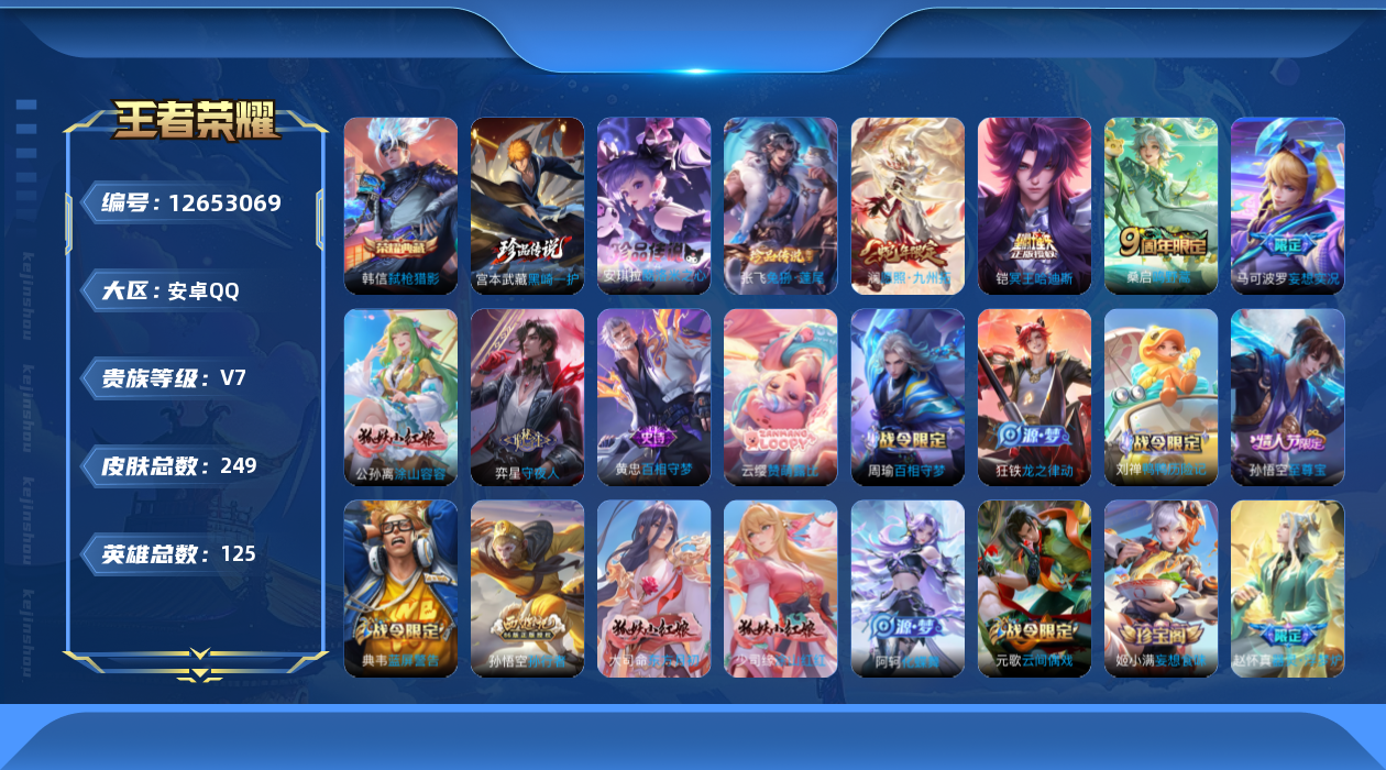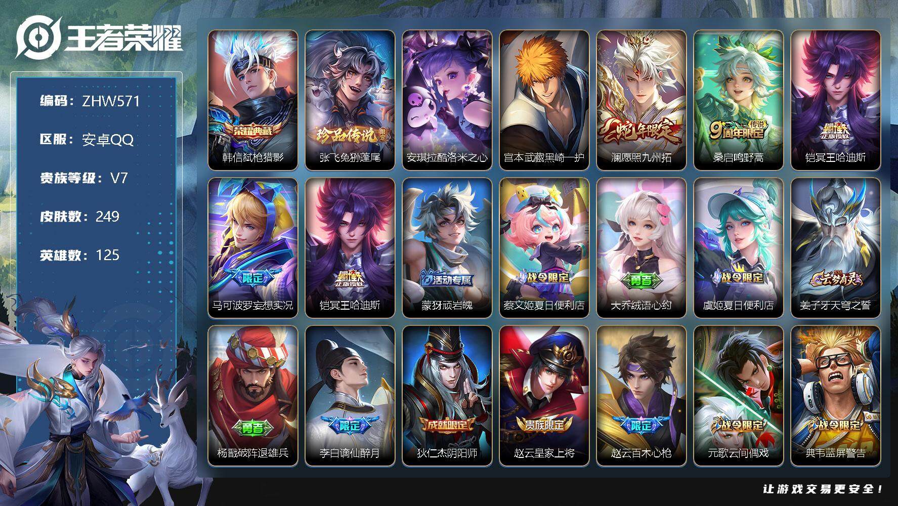 [12653069]安卓Q-V7-至尊星耀IV段位-125英雄-249皮肤-1典藏-3珍品传说-4传说-59史诗 【英雄全皮】:空空儿全皮,少司缘全皮 【荣耀典藏】:韩信弑枪猎影 【珍品传说】:张飞兔狲蓬尾,安琪拉酷洛米之心,宫本武藏黑崎一护 【传说皮肤】:澜愿照九州拓,桑启鸣野蒿,铠冥王哈迪斯,马可波罗妄想实况 【限定皮肤】:铠冥王哈迪斯,蒙犽顽岩魄,蔡文姬夏日便利店,大乔绒语心约,虞姬夏日便利店,姜子牙天穹之誓,杨戬破阵退雄兵,李白谪仙醉月,狄仁杰阴阳师,赵云皇家上将,赵云百木心枪,元歌云间偶戏,典韦蓝屏警告,马可波罗妄想实况,狄仁杰魔术师,项羽海滩派对,王昭君午后时光,兰陵王驯魔猎人,孙悟空至尊宝,孙悟空孙行者,钟馗神迹守卫,杨戬潮玩骑兵,百里玄策原初追逐者,裴擒虎李小龙,盾山梦圆繁星,上官婉儿神器万象笔,西施玲珑珍味,鲁班大师探海日志,阿古朵江河有灵,张良古海寻踪,蒙犽百解令,鬼谷子天穹祈灯,姬小满妄想食味,沈梦溪龙舞盛年,鲁班七号蔬乡物语,李元芳蔬乡物语,刘邦剑破天穹,程咬金群星魔术团,镜青焰无极,项羽苍威无极,刘备异域游侠,周瑜熔金海岸 【赛季限定】:张良古海寻踪,百里玄策原初追逐者,鲁班大师探海日志,鬼谷子天穹祈灯,刘邦剑破天穹,姜子牙天穹之誓 【战令限定】:蔡文姬夏日便利店,虞姬夏日便利店,元歌云间偶戏,典韦蓝屏警告,王昭君午后时光,兰陵王驯魔猎人,钟馗神迹守卫,杨戬潮玩骑兵,西施玲珑珍味,鲁班七号蔬乡物语,李元芳蔬乡物语,镜青焰无极,项羽苍威无极 【史诗皮肤】:露娜紫霞仙子,赵云皇家上将,赵云未来纪元,甄姬冰雪圆舞曲,狄仁杰魔术师,宫本武藏鬼剑武藏,孙尚香水果甜心,嬴政摇滚巨星,妲己魅力维加斯,刘禅绅士熊喵,曹操幽灵船长,吕布末日机甲,张飞乱世虎臣,孙悟空至尊宝,花木兰水晶猎龙者,刘邦德古拉伯爵,夏侯惇乘风破浪,亚瑟心灵战警,安琪拉心灵骇客,李元芳逐浪之夏,程咬金功夫厨神,典韦蓝屏警告,伽罗箭羽风息,狄仁杰鹰眼统帅,兰陵王驯魔猎人,百里玄策原初追逐者,裴擒虎李小龙,元歌云间偶戏,孙悟空孙行者,赵云百木心枪,盾山梦圆繁星,上官婉儿神器万象笔,阿古朵江河有灵,蒙犽百解令,周瑜雪夜绮愿,姬小满妄想食味,鲁班七号蔬乡物语,镜青焰无极,蔡文姬夏日便利店,蒙犽顽岩魄,少司缘涂山红红,大司命东方月初,姬小满战舞者,亚连破空之剑,弈星炽弈燎原,李白谪仙醉月,艾琳陌上桑,百里守约百相