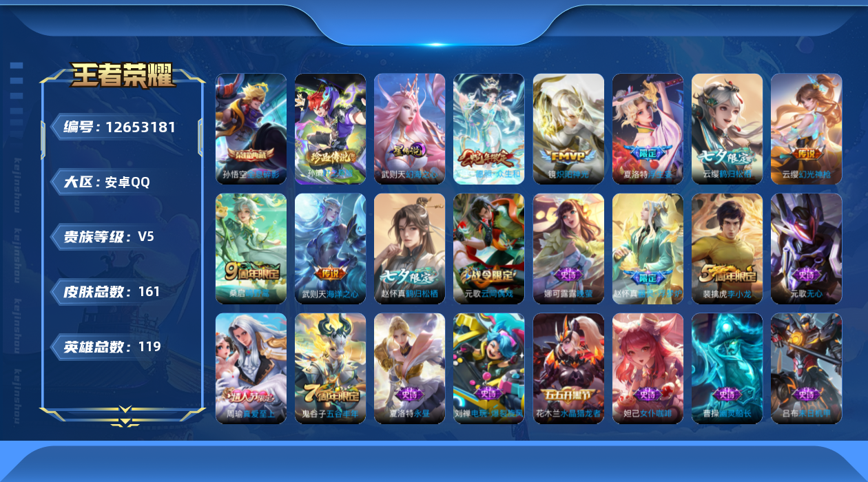 - [11930953]V10 3典藏 35传说 126英雄 482皮肤 典藏英雄武则天 牛魔大国标 孙膑小国标 武则天小国标 墨子小国标 钟馗小国标 大乔小国标 苏烈小国标 女号 可修改实名 优质装备:杀手不太冷,鸣剑·曳影,弑枪猎影(韩信典藏),黄金射手座,冠军飞将,久胜战神,炽阳神光,云霓雀翎,末日机甲-孙尚香(绿蚂蚱),地狱火,仲夏夜之梦(大飞蛾),零号·赤焰,海洋之心,地狱之眼,音你心动-周瑜,胖达荣荣,超时空战士-狄仁杰,无双飞将,鹤羽星尊,大乔-时之奇旅,永恒水手月亮,霜月吟,澜逐花归海,艾琳觅芳踪,涂山容容 珍宝阁皮:妄想食味,蔷薇恋人,女武神 限定皮:愿照·九州拓(澜年限),愿照·福禄聚(蔡文姬年限),逐霄战戟,鸣野蒿,凤求凰(白切鸡),武陵仙君(小桃花),异界灵契(白毛香),傲雪梅枪,寅虎·展翼(孙膑年限),前尘镜,绯月行,白晶晶,神威(电光马子),飞衡(韩信年限),至美·乘鲤谣,遇见飞天,高山流水,诗剑行,匿光决锋者,降魔,五谷丰年,冰锋战神,天狼运算者,游园惊梦,梁祝,御风骁将(吕布年限),龙胆,逐梦之星,天狼溯光者,祈雪灵祝(雪兔子),李小龙,逐梦之影,如梦令-嫦娥,霸王别姬-虞姬,圣诞老人,默契交锋-花木兰,孙行者,猪悟能,大圣娶亲,冰霜恋舞曲,乒乒小将,热情桑巴,美猴王,匿光追影者,寅虎·御盾(廉颇年限),寅虎·赤拳(老虎年限),时之祈愿-云中君,百木心枪,玉兔公主,启示之音,深海之息(深海大菠萝),唐三藏,山海·玄木吟(马可年限) 史诗皮:鸭鸭历险记-刘禅,化蝶舞,灵蛊蚀心,星界战将,石田雨龙,百相守梦-周瑜,茶境仙,幻珠鲛人,炽弈燎原,破空之剑,涂山红红,埋骨钱,琥珀纪元伽罗,蔬乡物语(鲁班七号),超元猎域,乘龙·忆丹青(大乔年限),百相守梦-百里守约,百相守梦-黄忠,织梦人,遇见神鹿,紫霞仙子,苍穹之光,电玩小子(小书包),白龙吟,黄金分割率,特工魅影,千年之狐,永昼,江河有灵,雪夜绮愿(周瑜),闲日渔趣,魅语,百解令(蒙犽),高渐离燃音魔法,蒙恬荣光圣徽,无限星赏官,匿光破解者,冰冠公主,青蛇,偶像歌手,白蛇,晚萤,电玩·爆裂旋风,暗夜猫娘,银翎春语,龙骑士(小龙虾),末日机甲-吕布,猫狗日记-孙策,猫狗日记-大乔,时之恋人-孙尚香,乱世虎臣,节奏热浪,修罗,女仆咖啡,摇滚巨星,水果甜心,绅士熊喵,天才门将,星夜王子,心灵骇客,