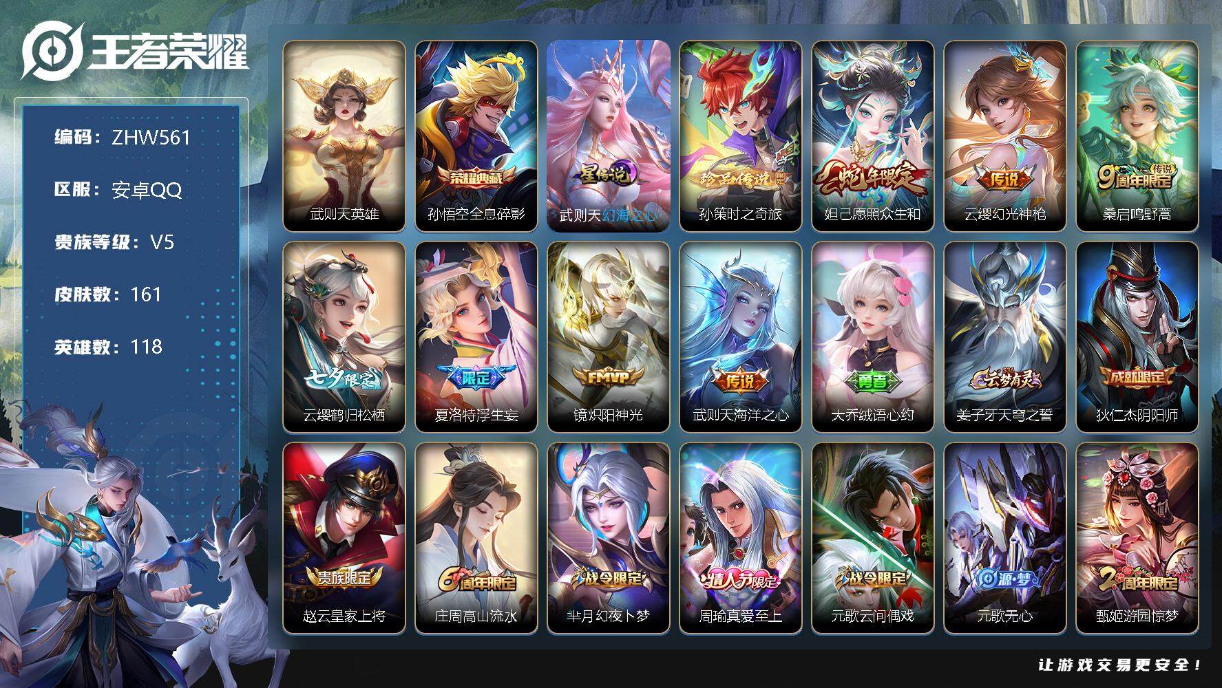 [12653181]安卓Q-V5-尊贵铂金III段位-118英雄-161皮肤-1典藏-1珍品传说-7传说-44史诗 【英雄全皮】:夏洛特全皮,赵怀真全皮 【荣耀典藏】:武则天英雄,孙悟空全息碎影 【珍品传说】:孙策时之奇旅 【传说皮肤】:妲己愿照众生和,云缨幻光神枪,桑启鸣野蒿,云缨鹤归松栖,夏洛特浮生妄,镜炽阳神光,武则天海洋之心 【限定皮肤】:大乔绒语心约,姜子牙天穹之誓,狄仁杰阴阳师,赵云皇家上将,庄周高山流水,芈月幻夜卜梦,周瑜真爱至上,元歌云间偶戏,元歌无心,甄姬游园惊梦,狄仁杰魔术师,狄仁杰万华元夜,达摩沙漠行僧,项羽海滩派对,老夫子醍醐杖,程咬金演武夺筹,兰陵王金庭之子,亚瑟潮玩骑士王,李元芳云中旅人,钟馗驱傩正仪,干将莫邪胡桃夹子,雅典娜黎明之约,鬼谷子原初探秘者,鬼谷子五谷丰年,黄忠火炮绅士,苏烈千军破阵,梦奇顽趣,沈梦溪大漠名商,裴擒虎李小龙,裴擒虎擒涛扼浪,鲁班大师探海日志,镜匿光追影者,桑启海盐诗旅,夏洛特浮生妄,赵怀真鹤归松栖,云缨鹤归松栖,张良古海寻踪,鬼谷子天穹祈灯,刘邦剑破天穹 【赛季限定】:狄仁杰万华元夜,达摩沙漠行僧,老夫子醍醐杖,程咬金演武夺筹,兰陵王金庭之子,张良古海寻踪,李元芳云中旅人,钟馗驱傩正仪,雅典娜黎明之约,鬼谷子原初探秘者,苏烈千军破阵,梦奇顽趣,沈梦溪大漠名商,裴擒虎擒涛扼浪,鲁班大师探海日志,桑启海盐诗旅,鬼谷子天穹祈灯,刘邦剑破天穹,姜子牙天穹之誓 【战令限定】:芈月幻夜卜梦,元歌云间偶戏,亚瑟潮玩骑士王,黄忠火炮绅士 【史诗皮肤】:项羽苍穹之光,赵云皇家上将,貂蝉圣诞恋歌,王昭君偶像歌手,狄仁杰魔术师,宫本武藏鬼剑武藏,孙尚香水果甜心,嬴政暗夜贵公子,嬴政摇滚巨星,妲己魅力维加斯,妲己女仆咖啡,墨子金属风暴,吕布圣诞狂欢,周瑜真爱至上,曹操幽灵船长,吕布末日机甲,张飞乱世虎臣,花木兰水晶猎龙者,夏侯惇乘风破浪,小乔缤纷独角兽,兰陵王暗隐猎兽者,甄姬游园惊梦,安琪拉心灵骇客,百里守约特工魅影,李元芳逐浪之夏,白起星夜王子,阿轲节奏热浪,孙策猫狗日记,狄仁杰鹰眼统帅,娜可露露晚萤,裴擒虎李小龙,元歌云间偶戏,沈梦溪月团寄思,庄周高山流水,镜匿光追影者,黄忠火炮绅士,雅典娜黎明之约,夏洛特永昼,鬼谷子五谷丰年,元歌无心,梦奇顽趣,刘禅电玩爆裂旋风,赵怀真鹤归松栖,赵怀真器灵浮梦炉 【其他皮肤】:项羽海滩派对,韩信教廷特使,韩信街头