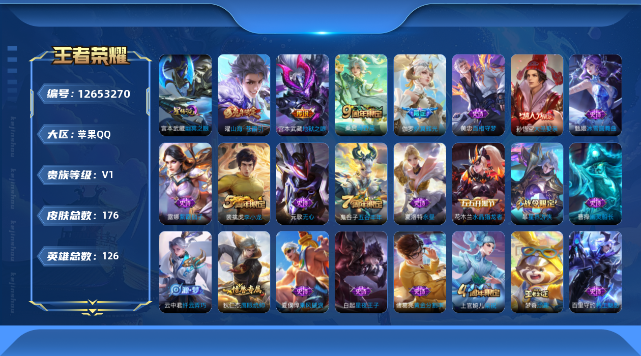 [12653270]苹果Q-V0-尊贵铂金I段位-126英雄-176皮肤-4传说-43史诗 【英雄全皮】:蒙恬全皮 【传说皮肤】:桑启鸣野蒿,伽罗炽翼辉光,曜山海苍雷引,宫本武藏地狱之眼 【限定皮肤】:蔡文姬夏日便利店,虞姬夏日便利店,姜子牙天穹之誓,杨戬破阵退雄兵,狄仁杰阴阳师,赵云皇家上将,嬴政优雅恋人,钟无艳超时空战士,元歌无心,甄姬落雪兰心,曹操烛龙,狄仁杰魔术师,狄仁杰万华元夜,达摩沙漠行僧,项羽海滩派对,老夫子醍醐杖,程咬金演武夺筹,兰陵王金庭之子,孙悟空大圣娶亲,李元芳云中旅人,干将莫邪胡桃夹子,雅典娜单词大作战,鬼谷子原初探秘者,鬼谷子五谷丰年,苏烈千军破阵,梦奇顽趣,沈梦溪大漠名商,明世隐疑决卦,裴擒虎李小龙,裴擒虎擒涛扼浪,米莱狄御霄,云中君纤云弄巧,伽罗炽翼辉光,上官婉儿梁祝,嫦娥暖冬兔眠,曜山海苍雷引,蒙犽狂想玩偶喵,鲁班大师探海日志,桑启海盐诗旅,暃星界游侠,阿古朵江河有灵,张良古海寻踪,蒙恬荣光圣徽,鬼谷子天穹祈灯,刘邦剑破天穹,程咬金群星魔术团,镜青焰无极,项羽苍威无极,刘备异域游侠,周瑜熔金海岸 【年限皮肤】:曜山海苍雷引,伽罗炽翼辉光 【赛季限定】:曹操烛龙,狄仁杰万华元夜,达摩沙漠行僧,老夫子醍醐杖,程咬金演武夺筹,兰陵王金庭之子,张良古海寻踪,李元芳云中旅人,鬼谷子原初探秘者,苏烈千军破阵,梦奇顽趣,沈梦溪大漠名商,明世隐疑决卦,裴擒虎擒涛扼浪,米莱狄御霄,鲁班大师探海日志,桑启海盐诗旅,鬼谷子天穹祈灯,蒙恬荣光圣徽,刘邦剑破天穹,姜子牙天穹之誓 【战令限定】:蔡文姬夏日便利店,虞姬夏日便利店,钟无艳超时空战士,甄姬落雪兰心,雅典娜单词大作战,嫦娥暖冬兔眠,蒙犽狂想玩偶喵,暃星界游侠,镜青焰无极,项羽苍威无极 【史诗皮肤】:露娜紫霞仙子,赵云皇家上将,赵云未来纪元,貂蝉圣诞恋歌,甄姬冰雪圆舞曲,王昭君偶像歌手,狄仁杰魔术师,宫本武藏鬼剑武藏,孙尚香水果甜心,嬴政优雅恋人,嬴政摇滚巨星,妲己魅力维加斯,墨子金属风暴,曹操幽灵船长,张飞乱世虎臣,花木兰水晶猎龙者,刘邦德古拉伯爵,夏侯惇乘风破浪,兰陵王暗隐猎兽者,诸葛亮黄金分割率,百里守约特工魅影,蔡文姬舞动绿茵,程咬金功夫厨神,白起星夜王子,阿轲节奏热浪,孙策猫狗日记,孙悟空大圣娶亲,狄仁杰鹰眼统帅,上官婉儿梁祝,蒙犽狂想玩偶喵,裴擒虎李小龙,云中君纤云弄巧,夏洛特永昼,钟无艳超时空战士,鬼谷子五谷