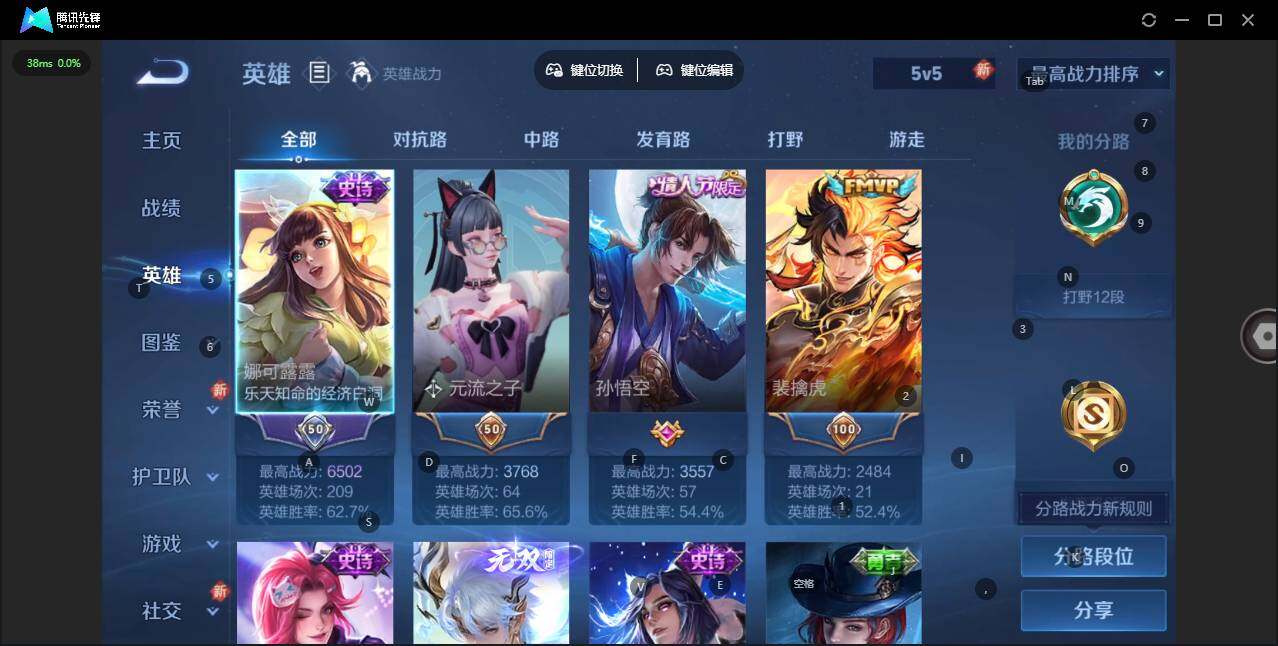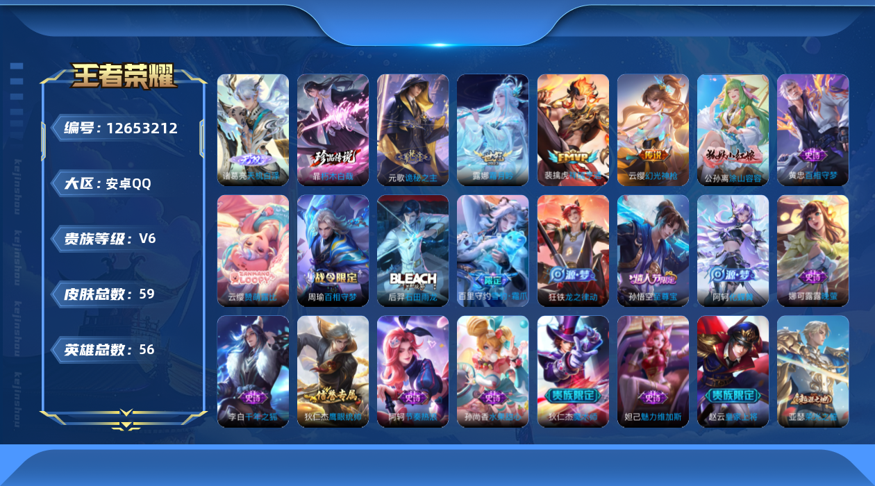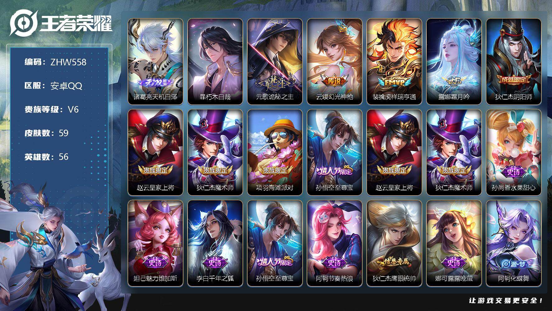 [12653212]安卓Q-V6-至尊星耀IV段位-56英雄-59皮肤-1无双-1珍品传说-4传说-17史诗