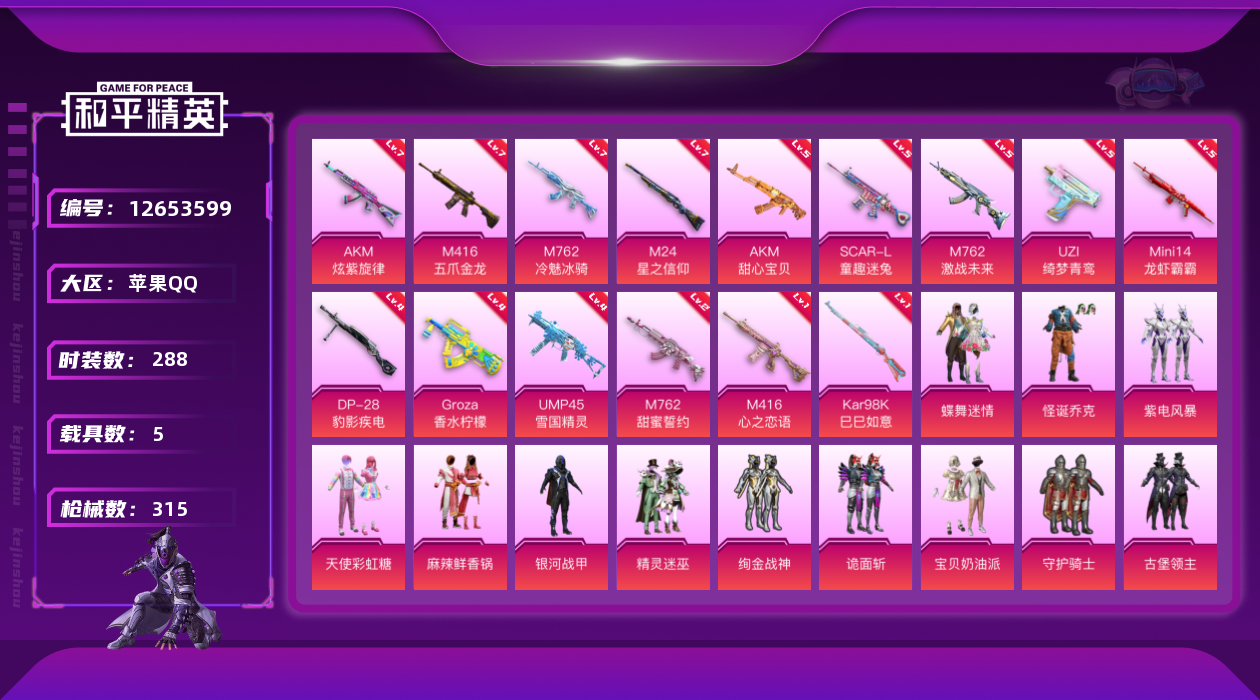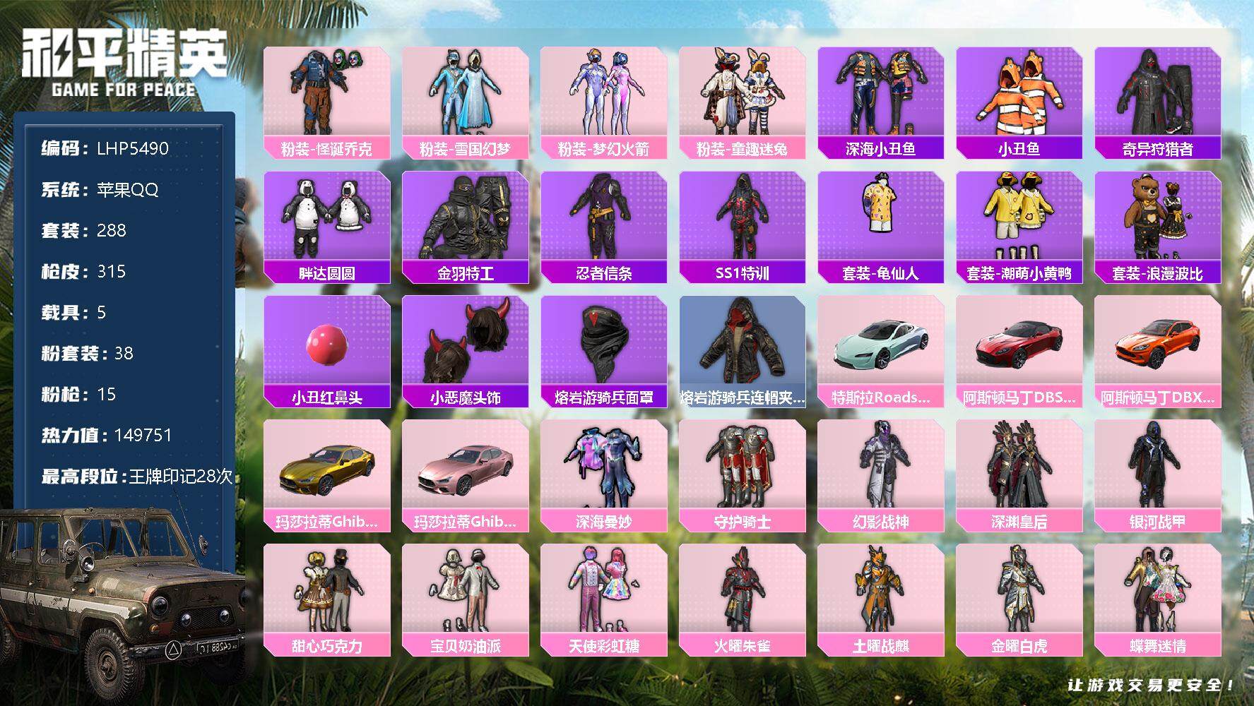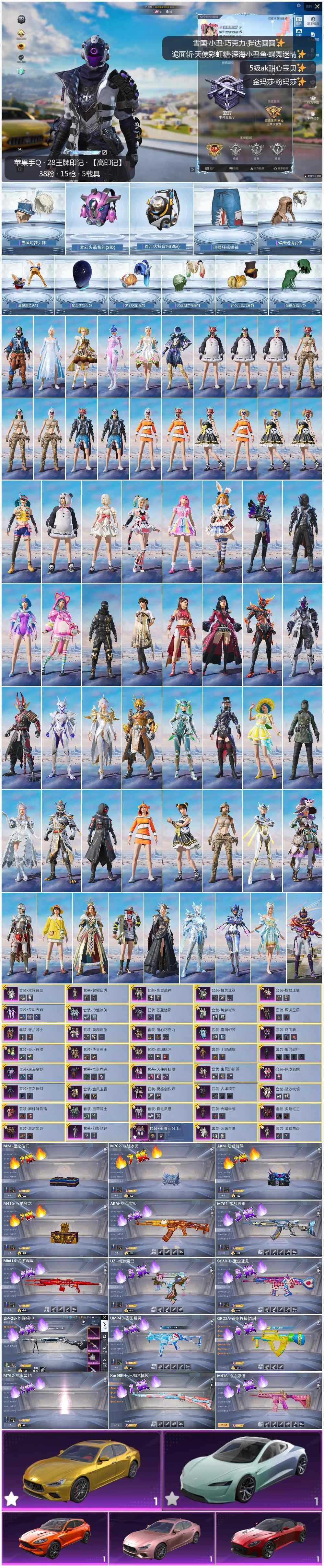 [12653599]素材身法号 苹果 手Q-38粉装-15特效枪-5载具-13粉色飞行器-14.9w热力值-28王牌印记-288套装-315枪皮【热门品类】:粉装-怪诞乔克,粉装-雪国幻梦,粉装-梦幻火箭,粉装-童趣迷兔,套装-深海小丑鱼,套装-小丑鱼,套装-奇异狩猎者,套装-胖达圆圆,套装-金羽特工,套装-忍者信条,套装-SS1特训,套装-龟仙人,套装-潮萌小黄鸭,套装-浪漫波比,小丑红鼻头,小恶魔头饰,熔岩游骑兵面罩,熔岩游骑兵连帽夹克【粉色载具】:特斯拉Roadster(水滴蓝),阿斯顿马丁DBS(红),阿斯顿马丁DBX(橙),玛莎拉蒂Ghibli(金),玛莎拉蒂Ghibli(粉)【粉色套装】:粉装-深海曼妙,粉装-守护骑士,粉装-幻影战神,粉装-怪诞乔克,粉装-深渊皇后,粉装-银河战甲,粉装-甜心巧克力,粉装-宝贝奶油派,粉装-天使彩虹糖,粉装-火曜朱雀,粉装-土曜战麒,粉装-金曜白虎,粉装-雪国幻梦,粉装-蝶舞迷情,粉装-精灵迷巫,粉装-梦幻火箭,粉装-华贵君王,粉装-星之信仰,粉装-金风玉露,粉装-麻辣鲜香锅,粉装-古堡领主,粉装-琉璃脉冲,粉装-潮汐统领,粉装-诡面斩,粉装-俏皮狐尾,粉装-苍蓝魅影,粉装-翡翠骑士,粉装-绚金战神,粉装-冰霜白皇,粉装-童趣迷兔,粉装-炙焰红王,粉装-香水柠檬,粉装-王牌四分卫,粉装-绮梦青鸾,粉装-冷魅冰骑,粉装-赤焰黑爵,粉装-紫电风暴,粉装-灵感创作师【粉色枪皮等级】:AKM-甜心宝贝(五级),AKM-炫紫旋律(七级),SCAR-L-童趣迷兔(五级),M416-五爪金龙(七级),M416-心之恋语(一级),GROZA-香水柠檬(四级),M762-甜蜜誓约(二级),M762-激战未来(五级),M762-冷魅冰骑(七级),UZI-绮梦青鸾(五级),UMP45-雪国精灵(四级),Kar98K-巳巳如意(一级),M24-星之信仰(七级),Mini14-龙虾霸霸(五级),DP-28-豹影疾电(四级)【粉色飞行器】:深海曼妙飞行器,春暖花开飞行器,精灵迷巫飞行器,梦幻火箭飞行器,古堡领主飞行器,甜蜜誓约飞行器,四圣焕新飞行器,心之恋语飞行翼,暗翼战神飞行器,绮梦青鸾飞行器,冷魅冰骑飞行器