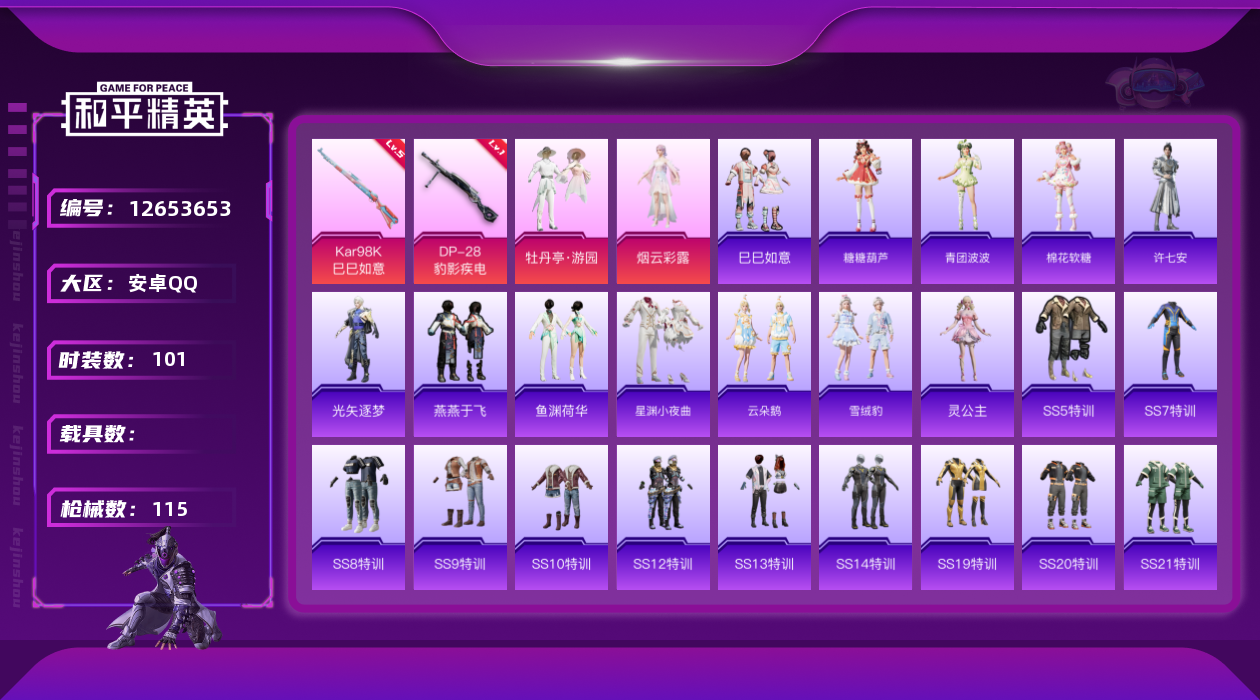 - PX_2108683-实名: 不可修改 时装数: 523 载具数: 3 枪械数: 194 战备数: 113 热门装扮: 金风玉露,梦魇先生,万圣娃娃,潮萌小黄鸭,蔷薇魔法师,神秘黑猫,金丰海韵 载具: 玛莎拉蒂Ghibli(粉),合金龙骨(蓝),合金龙骨(绿) 稀有枪皮: Mini14龙虾霸霸,AKM炫紫旋律,M416五爪金龙,M200玉鳞金羽,AUG超新星,SCAR-L-锦绣绵绵,Kar98K-
