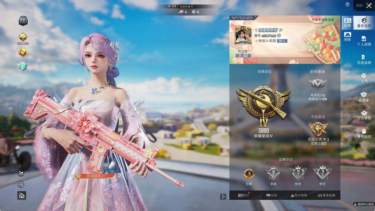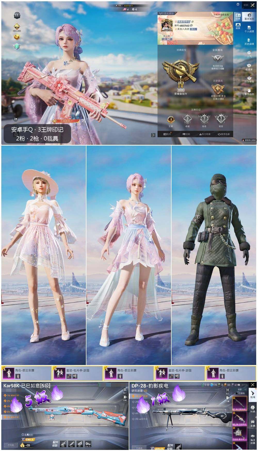 [12653653]地铁满天赋 安卓 手Q-2粉装-2特效枪-1粉色飞行器-3.4w热力值-3王牌印记-101套装-115枪皮【粉色套装】:角色-烟云彩露,粉装-牡丹亭·游园【粉色枪皮等级】:Kar98K-巳巳如意(五级),DP-28-豹影疾电(一级)