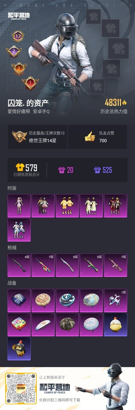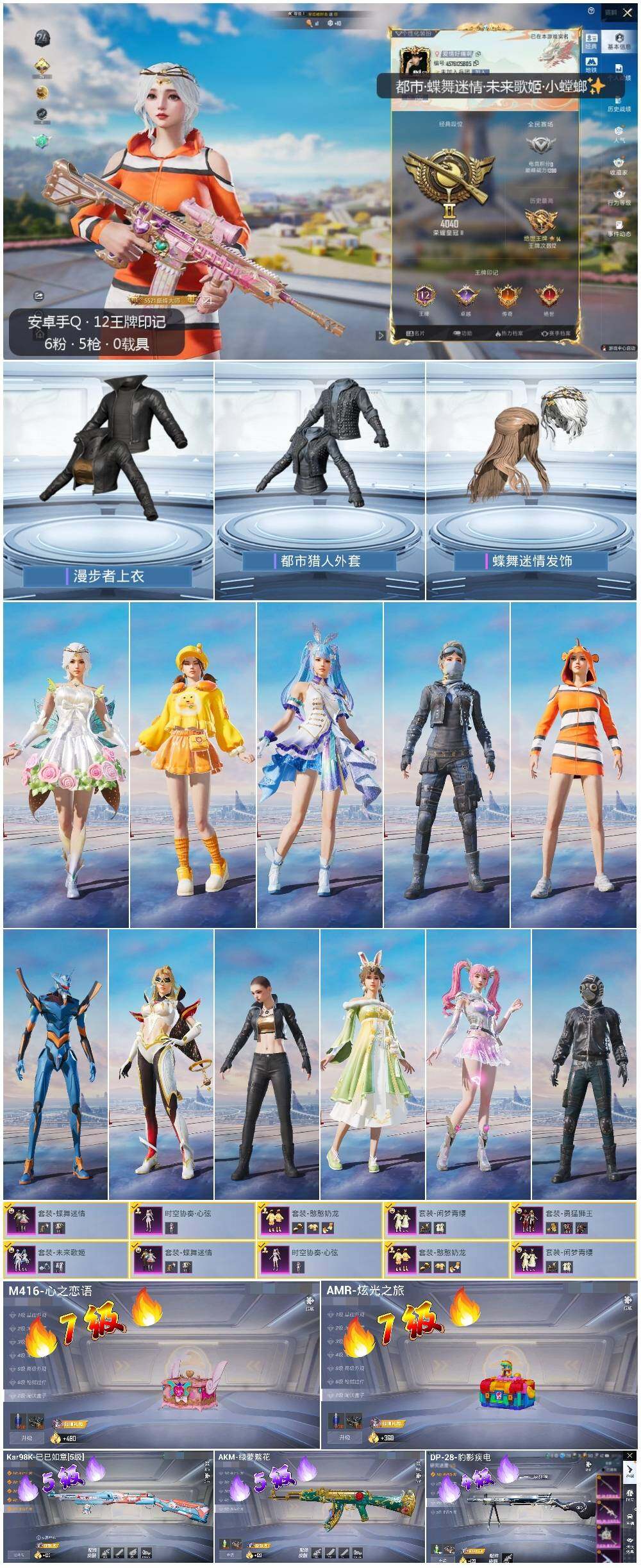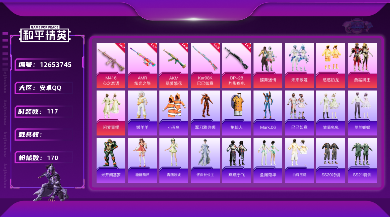 - PX_2091228- 安卓手Q-17王牌印记-3粉装-6特效枪-0载具-73660热力值-163套装-232枪皮-0卓越印记-0传奇印记 【3粉装】,第五大道,幻彩电音,未来歌姬 【6特效枪】AKM-梦之光华-7级 SCAR-L-青春物语-7级 GROZA-镜光银凌-5级 AUG-暖羊咩咩-5级 Kar98K-巳巳如意-5级 M24-翩跹演武-7级 【2稀有紫装】,龟仙人,怀庆长公主, 【16