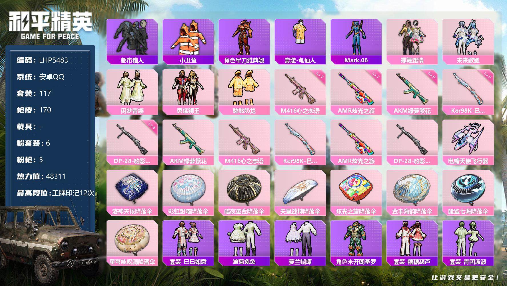 [12653745]绝世印记1/地铁满天赋 安卓 手Q-6粉装-5特效枪-1粉色飞行器-4.8w热力值-12王牌印记-117套装-170枪皮【热门品类】:套装-都市猎人,套装-小丑鱼,角色-军刀雅典娜,套装-龟仙人,角色-Mark.06【粉色套装】:粉装-蝶舞迷情,粉装-未来歌姬,粉装-闲梦青缨,粉装-勇猛狮王,粉装-憨憨奶龙【粉色枪皮等级】:AKM-绿萝繁花(五级),M416-心之恋语(七级),Kar98K-巳巳如意(五级),AMR-炫光之旅(七级),DP-28-豹影疾电(四级)【粉色飞行器】:电糖天使飞行器