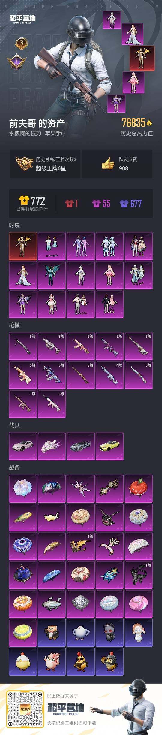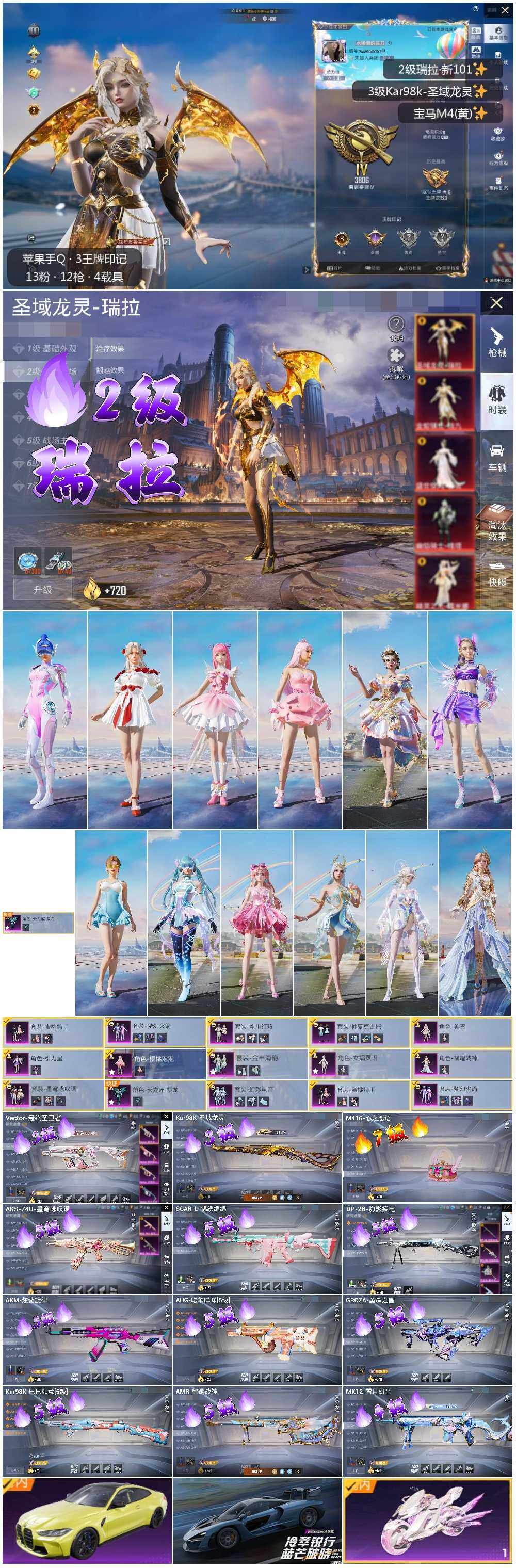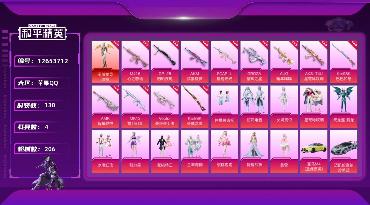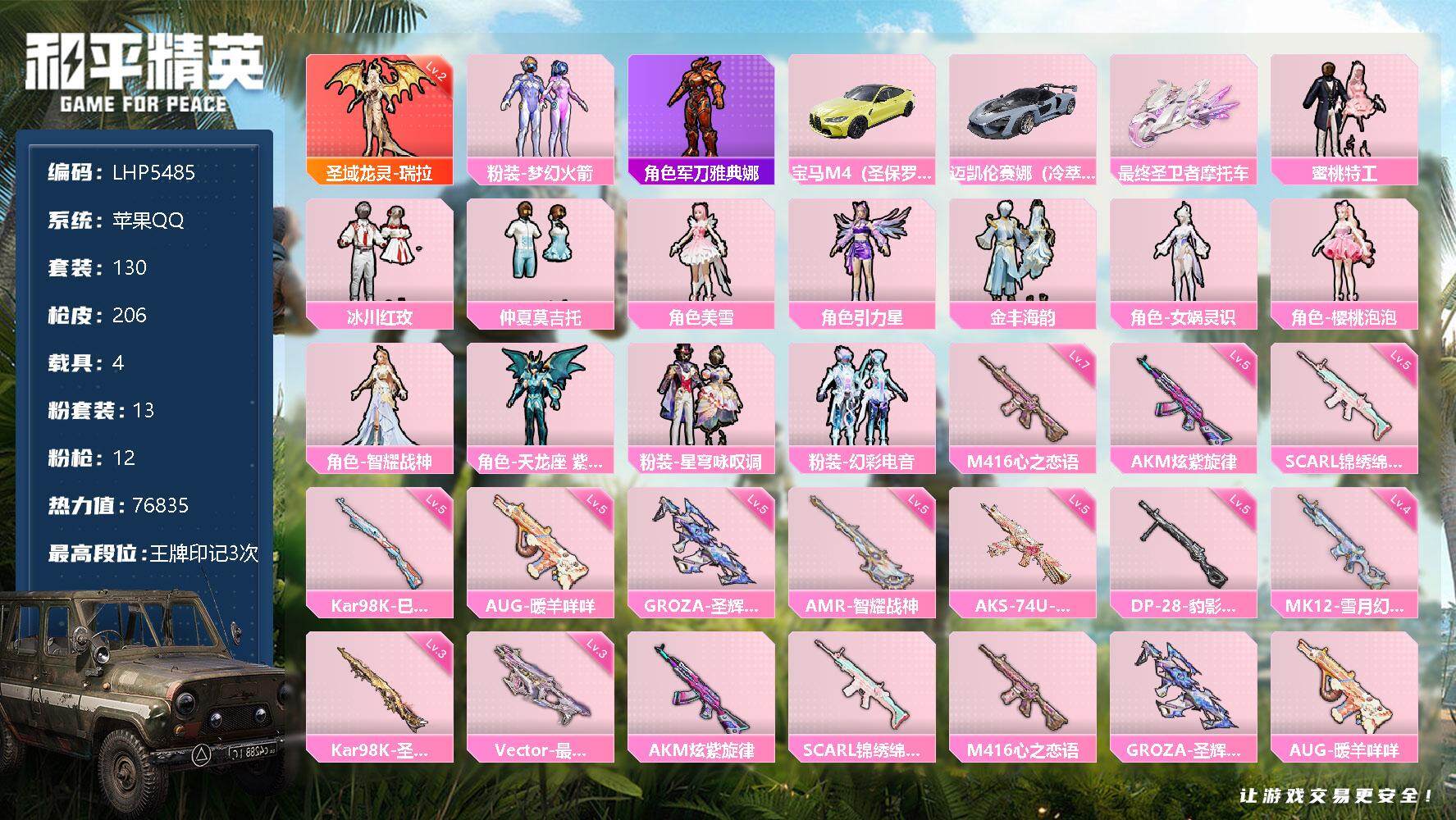 [12653712]素材身法号 苹果 手Q-1神装-13粉装-12特效枪-4载具-9粉色飞行器-7.6w热力值-3王牌印记-130套装-206枪皮【红色神装等级】:圣域龙灵-瑞拉(二级)【热门品类】:粉装-梦幻火箭,角色-军刀雅典娜【粉色载具】:宝马M4(圣保罗黄),迈凯伦塞纳(冷萃蓝),最终圣卫者摩托车【粉色套装】:粉装-梦幻火箭,粉装-蜜桃特工,粉装-冰川红玫,粉装-仲夏莫吉托,角色-美雪,角色-引力星,粉装-金丰海韵,角色-女娲灵识,角色-樱桃泡泡,角色-智耀战神,角色-天龙座 紫龙,粉装-星穹咏叹调,粉装-幻彩电音【粉色枪皮等级】:AKM-炫紫旋律(五级),SCAR-L-锦绣绵绵(五级),M416-心之恋语(七级),GROZA-圣辉之星(五级),AUG-暖羊咩咩(五级),Vector-最终圣卫者(三级),AKS-74U-星穹咏叹调(五级),Kar98K-巳巳如意(五级),Kar98K-圣域龙灵(三级),AMR-智耀战神(五级),MK12-雪月幻音(四级),DP-28-豹影疾电(五级)【粉色飞行器】:千面幻镜飞行器,龙翔九天飞行器,冠军兔兔飞行器,凤舞九天飞行器,圣域金龙飞行器,雀灵庇佑飞行器,御兔特攻飞行器,时光之吻飞行器,终晖之翼飞行器
