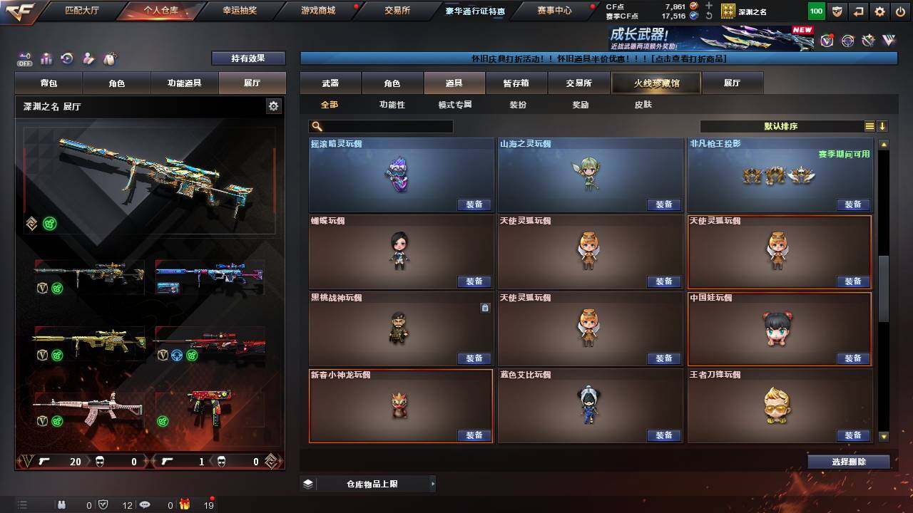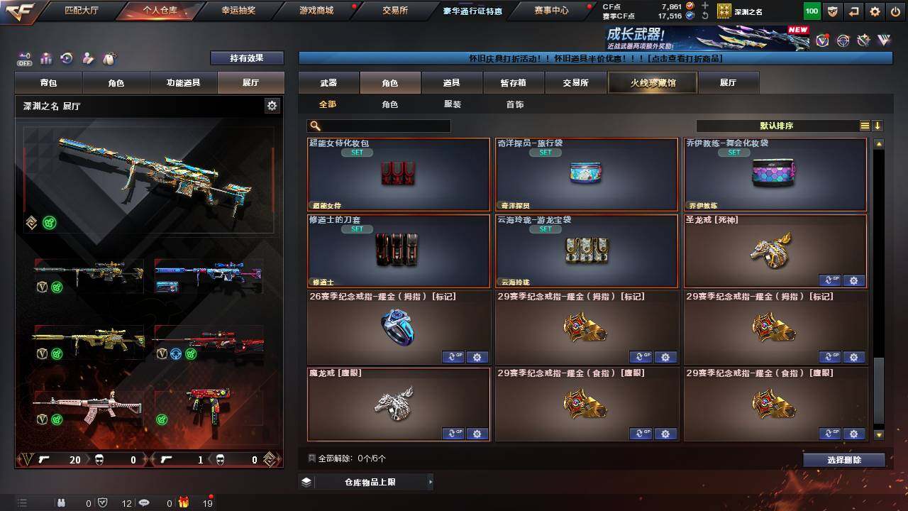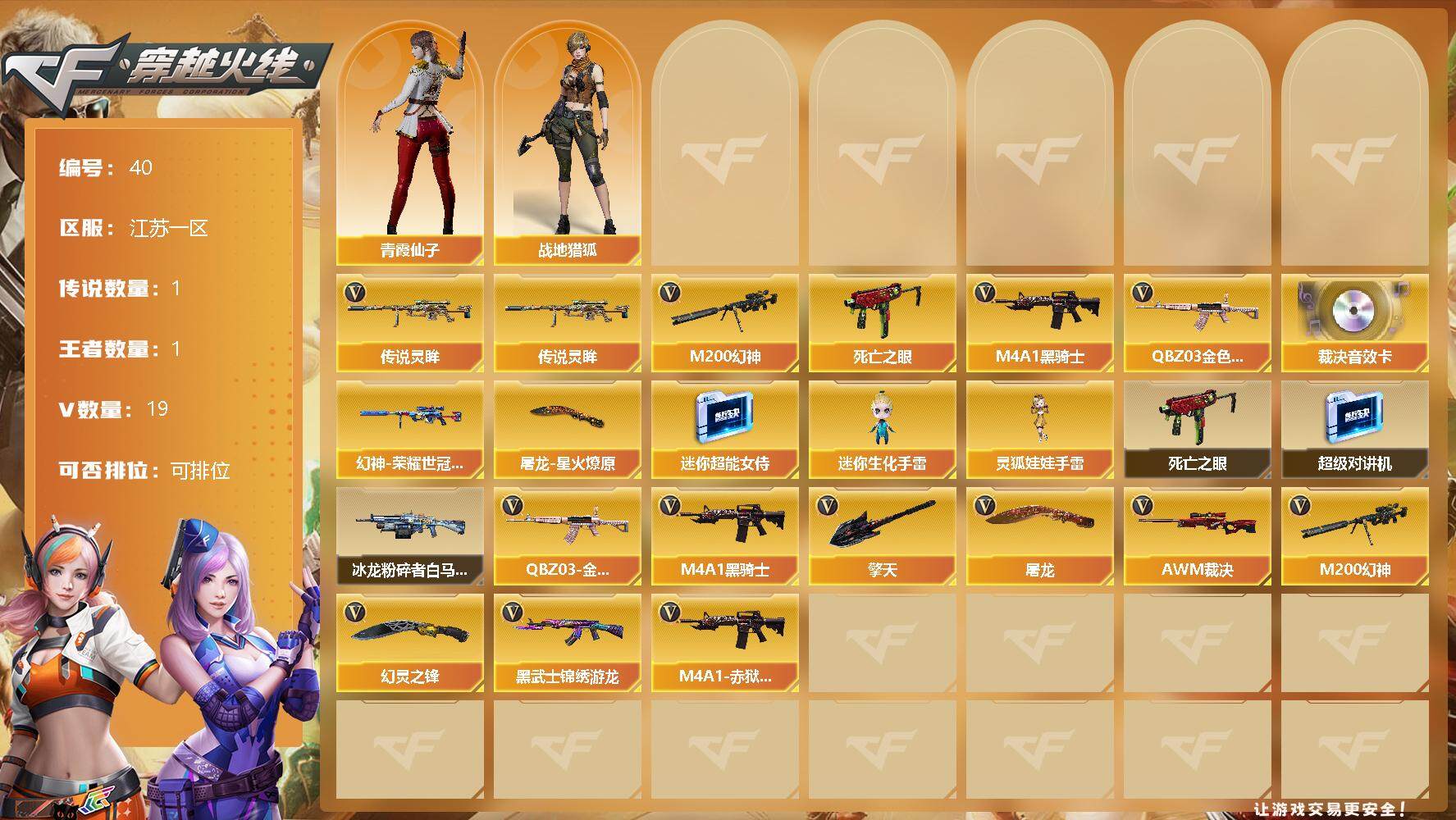 [12654027]江苏一区-19V-1王者-0炫金 【传说武器】:传说灵眸 【热门武器】:传说灵眸,QBZ03-金色蔷薇,M200-幻神,死亡之眼,M4A1-黑骑士 【音效卡】:AWM-裁决音效卡 【稀有皮肤】:M200-幻神-荣耀世冠白鲨,屠龙-星火燎原*2 【角色】:战地猎狐,青霞仙子 【人偶武器】:迷你超能女侍,迷你生化手雷,灵狐娃娃手雷 【暴走生化】:死亡之眼,超级对讲机 【挑战大师】:冰龙粉碎者-白马银枪*2 【英雄级武器】:幻灵之锋,QBZ03-金色蔷薇,M4A1-黑骑士,AWM-裁决,M200-幻神,黑武士-锦绣游龙,M4A1-赤狱骑士,擎天,屠龙 【特殊枪械】:1黑骑士