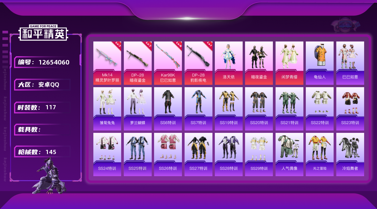 [12654060]地铁满天赋 安卓 手Q-3粉装-4特效枪-1粉色飞行器-4.3w热力值-5王牌印记-117套装-145枪皮【热门品类】:套装-龟仙人【粉色套装】:角色-洛天依,粉装-暗夜鎏金,粉装-闲梦青缨【粉色枪皮等级】:Kar98K-巳巳如意(四级),Mk14-精灵梦叶罗丽(七级),DP-28-暗夜鎏金(七级),DP-28-豹影疾电(一级)【粉色飞行器】:梦幻火箭飞行器