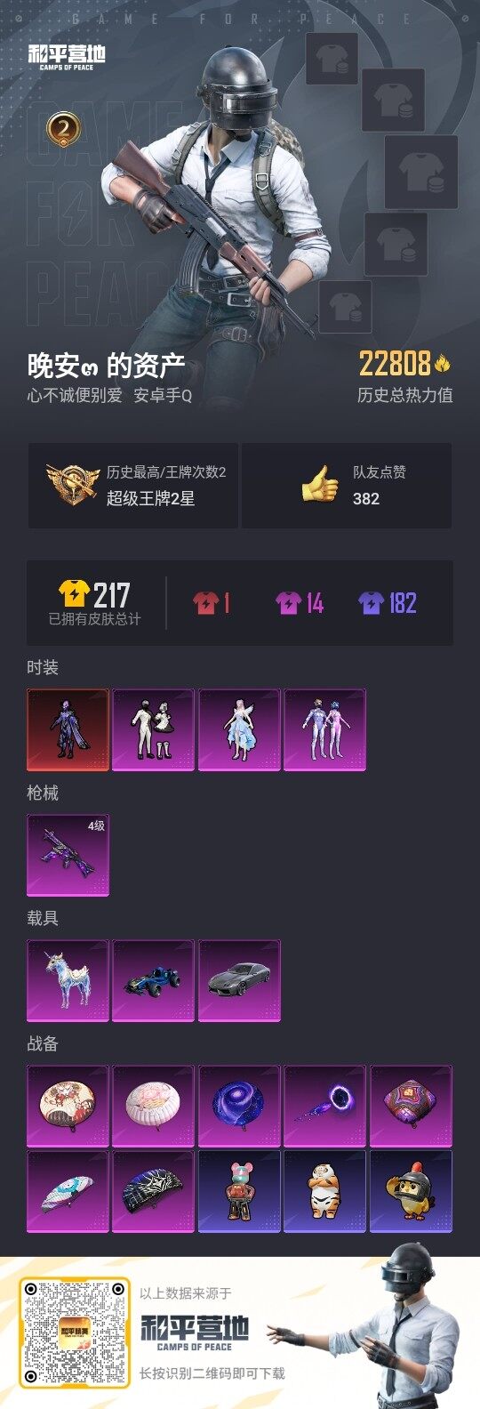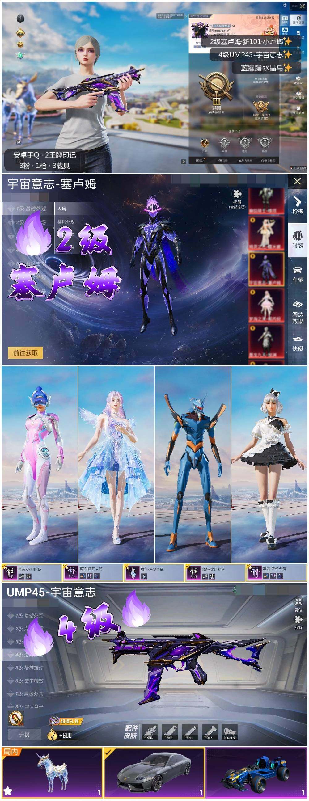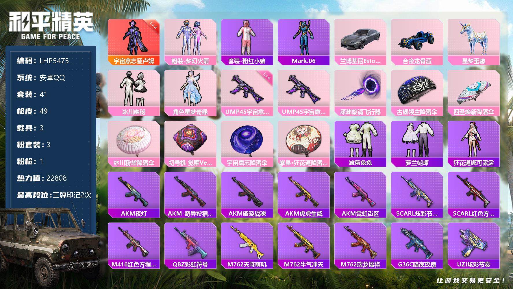 [12654062]素材身法号 安卓 手Q-1神装-3粉装-1特效枪-3载具-1粉色飞行器-2.2w热力值-2王牌印记-41套装-49枪皮【红色神装等级】:宇宙意志-塞卢姆(二级)【热门品类】:粉装-梦幻火箭,套装-粉红小猪,角色-Mark.06【粉色载具】:兰博基尼Estoque(银翼灰),合金龙骨(蓝),星梦玉骢【粉色套装】:粉装-梦幻火箭,粉装-冰川幽秘,角色-星梦奇缘【粉色枪皮等级】:UMP45-宇宙意志(四级)【粉色飞行器】:深渊漩涡飞行器