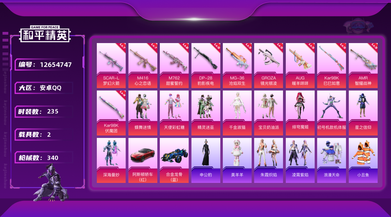 [12654747]素材身法号/地铁满天赋 安卓 手Q-10粉装-11特效枪-2载具-5粉色飞行器-10.5w热力值-9王牌印记-235套装-340枪皮【热门品类】:粉装-梦幻火箭,套装-浪漫天命,套装-派对舞王,套装-小丑鱼,套装-奇异狩猎者,套装-忍者信条,套装-龟仙人,小恶魔头饰【粉色载具】:阿斯顿马丁DBS(红),合金龙骨(蓝)【粉色套装】:粉装-深海曼妙,粉装-宝贝奶油派,粉装-天使彩虹糖,粉装-蝶舞迷情,粉装-精灵迷巫,粉装-梦幻火箭,粉装-星之信仰,角色-初号机款机体服,角色-千金淑猫,角色-绯穹魔姬【粉色枪皮等级】:SCAR-L-梦幻火箭(七级),M416-心之恋语(七级),GROZA-镜光银凌(五级),AUG-暖羊咩咩(五级),M762-甜蜜誓约(六级),Kar98K-伏魔团(四级),Kar98K-巳巳如意(五级),Mk14-甜梦熊击(五级),AMR-智耀战神(五级),DP-28-豹影疾电(五级),MG-36-沧焰双生(五级)【粉色飞行器】:春暖花开飞行器,精灵迷巫飞行器,梦幻火箭飞行器,黄族统领飞行器