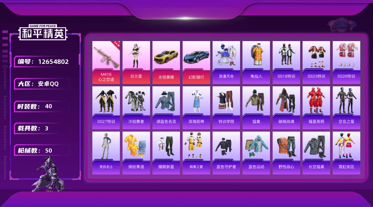 [12654802]安卓 手Q-1粉装-1特效枪-3载具-1.9w热力值-1王牌印记-40套装-50枪皮【热门品类】:套装-浪漫天命,套装-龟仙人【粉色载具】:永恒黄蜂,幻影随行,僚机-萌兔起飞【粉色套装】:角色-白兰星【粉色枪皮等级】:M416-心之恋语(五级)