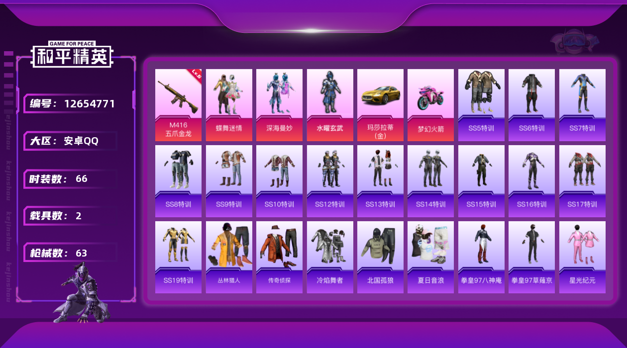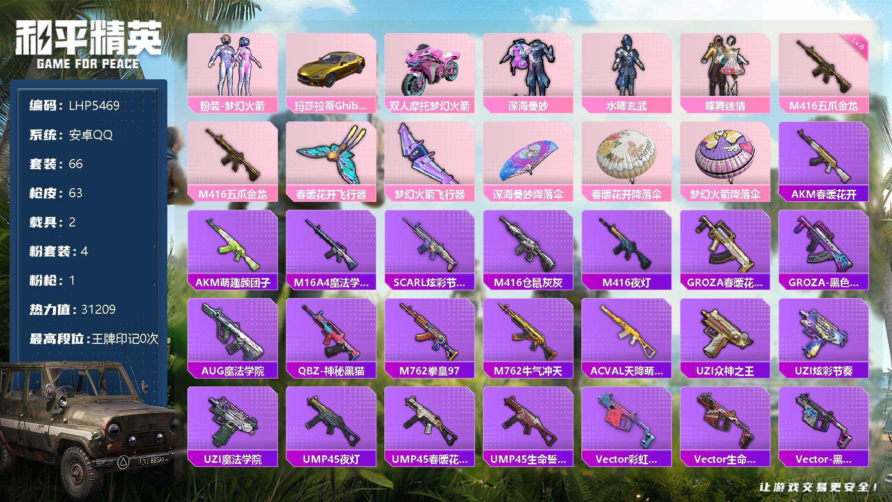 [12654771]安卓 手Q-4粉装-1特效枪-2载具-2粉色飞行器-3.1w热力值-1王牌印记-66套装-63枪皮【热门品类】:粉装-梦幻火箭【粉色载具】:玛莎拉蒂Ghibli(金),双人摩托-梦幻火箭【粉色套装】:粉装-深海曼妙,粉装-水曜玄武,粉装-蝶舞迷情,粉装-梦幻火箭【粉色枪皮等级】:M416-五爪金龙(六级)【粉色飞行器】:春暖花开飞行器,梦幻火箭飞行器