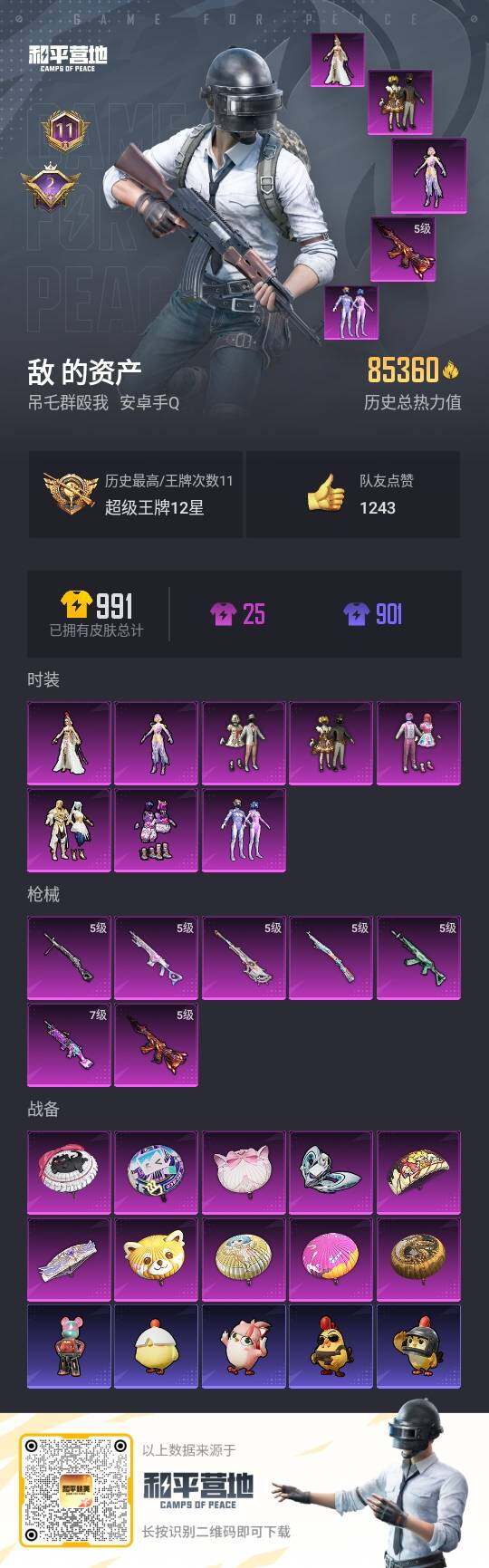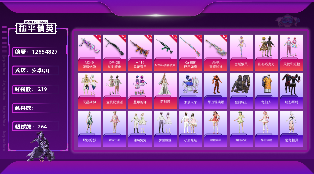 [12654827]地铁满天赋 安卓 手Q-8粉装-7特效枪-1粉色飞行器-8.5w热力值-11王牌印记-219套装-264枪皮【热门品类】:粉装-梦幻火箭,套装-浪漫天命,套装-都市猎人,套装-深海小丑鱼,角色-军刀雅典娜,套装-胖达团团,套装-金羽特工,套装-龟仙人,套装-潮萌小黄鸭,套装-暗影哥特,小恶魔头饰【粉色套装】:粉装-甜心巧克力,粉装-宝贝奶油派,粉装-天使彩虹糖,粉装-梦幻火箭,粉装-蓝莓炮弹,粉装-天星战神,角色-金域紫灵,角色-萨利娅【粉色枪皮等级】:M416-风花雪月(五级),M762-青锋波束(五级),Kar98K-巳巳如意(五级),Mk14-甜梦熊击(五级),AMR-智耀战神(五级),M249-蓝莓炮弹(七级),DP-28-豹影疾电(五级)【粉色飞行器】:时空协奏飞行器