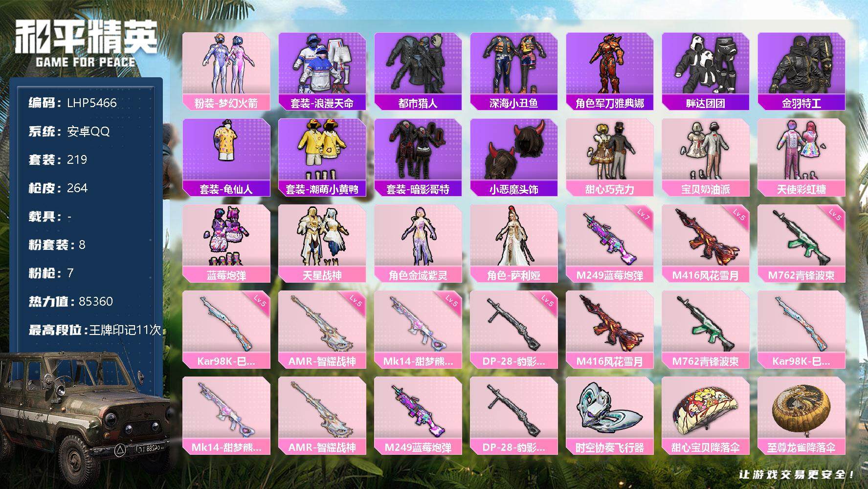 - [11252757]3粉装 3特效枪 1载具 7印记 可二次 安全保护中 热门装扮:宝贝奶油派,甜蜜誓约,极致幻想,罗小黑,迅捷狂鲨,呆萌铁蟹,浪漫波比 载具:阿斯顿·马丁DBS(绿) 稀有枪皮:M416心之恋语,M762甜蜜誓约,Kar98K伏魔团 七级特效枪:七级M762-甜蜜誓约 六级特效枪:六级M416-心之恋语 二级特效枪:二级Kar98K-伏魔团 紫色装扮:萌趣咩咩,甜心亚梦,虚音幻奏,SS20特训,SS21特训,娇憨猪猪,SS30特训套装,SS13特训,SS14特训,骁骑迪迦,缤纷焰火,SS18特训,SS19特训,异彩先驱,SS16特训,瑞龙福将,团圆交子,SS17特训,极乐追光,虎虎生威吉莉,都市漫游者,都市魅力,蓝色守护者,空投萌叽,红色运动,绮丽涂鸦,耀眼新星,长空猛禽,霓虹极客,骑行爱好者,福星高照,战地菁英,幻世战舞者,甜蜜告白,特殊使命,特训学院,甜蜜熊情侣,牛气满满,灰色格斗者,炫蓝之夏,热血青春,牛气冲天,玉兔迎春,竞技名士,小丑鱼,逆风勇士,SS11特训,丝绸行者,神秘舞者,青龙圣者,原初圣火,机械征服者,机械英豪,SS10特训,纯白誓言,暗夜契约,萌黄之夏,童话森林,弄潮海豚,SS12特训 优质战备:伏魔团降落伞,繁花小夜曲飞行翼,甜蜜誓约降落伞,扶摇飞仙降落伞,飞行器-扶摇飞仙,四圣焕新降落伞,暗夜玫瑰降落伞,林间仙鹿降落伞