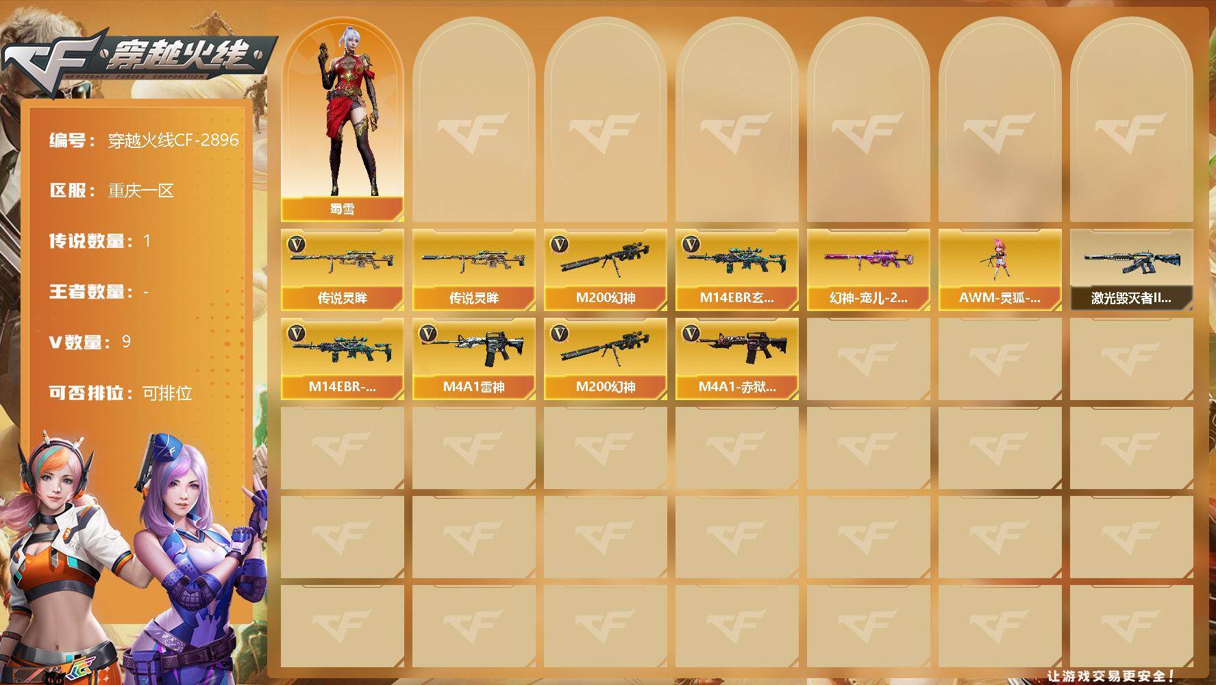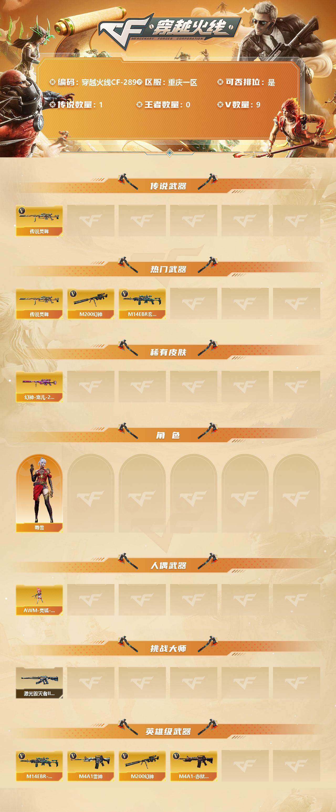[12655195]重庆一区-9V-0王者-0炫金 【传说武器】:传说灵眸 【热门武器】:传说灵眸,M14EBR-玄武,M200-幻神 【稀有皮肤】:幻神-宠儿-2021MVP 【角色】:蜀雪 【人偶武器】:AWM-灵狐-15周年嘉年华 【挑战大师】:激光毁灭者III-白马银枪 【英雄级武器】:M14EBR-玄武,M4A1-雷神,M200-幻神,M4A1-赤狱骑士 【特殊枪械】: