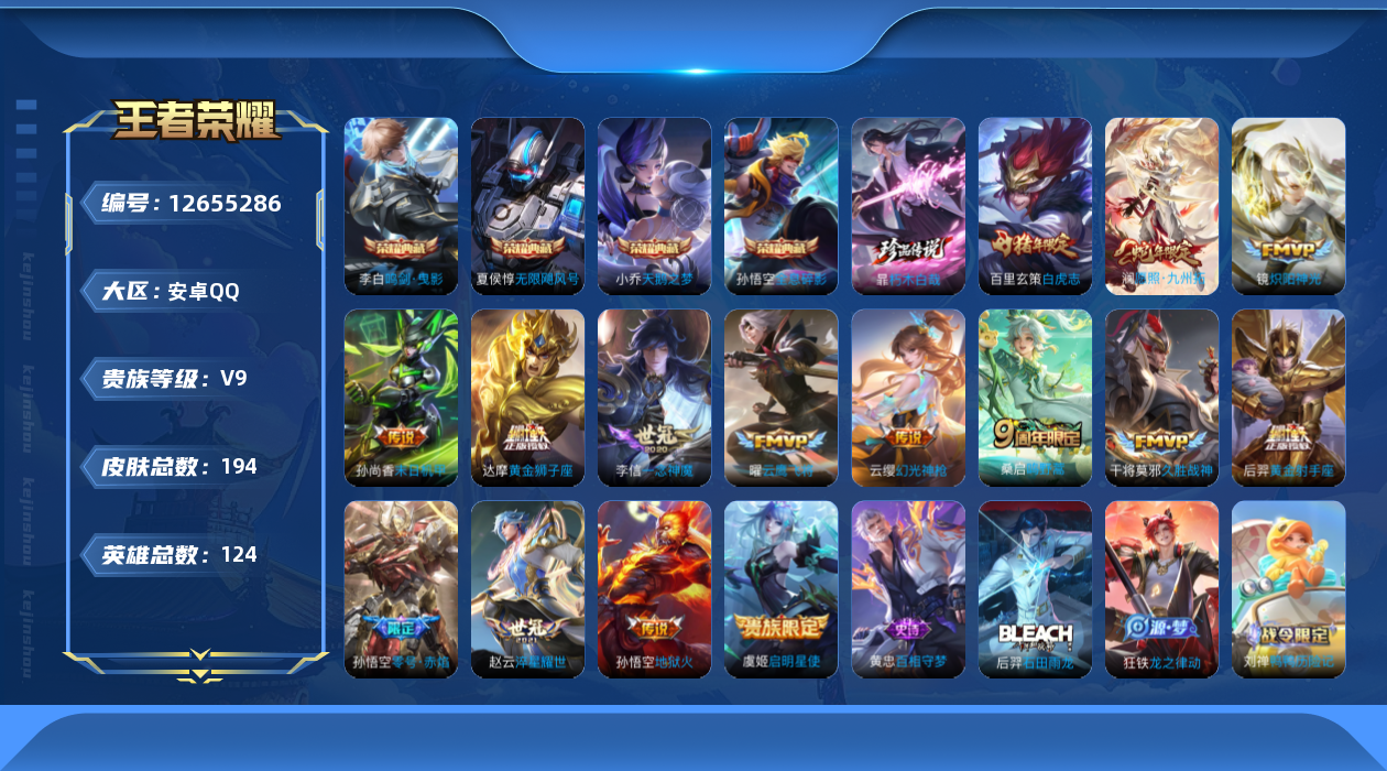 [12655286]安卓Q-V9-最强王者段位-124英雄-194皮肤-4典藏-0珍品无双-0无双-1珍品传说-15传说-60史诗