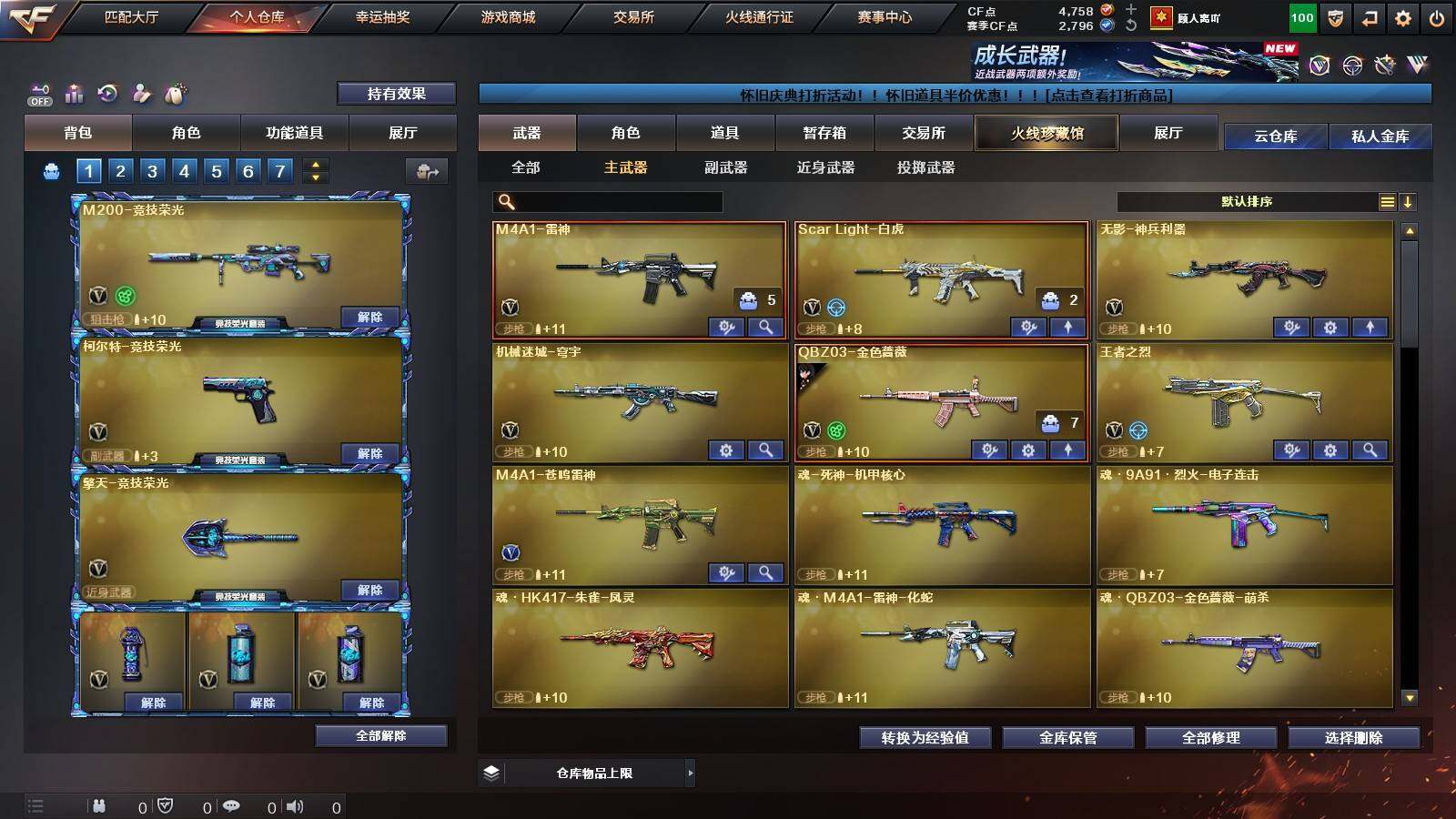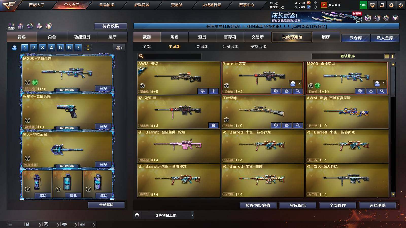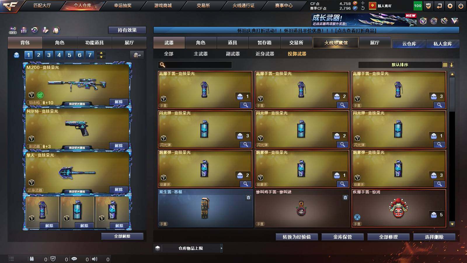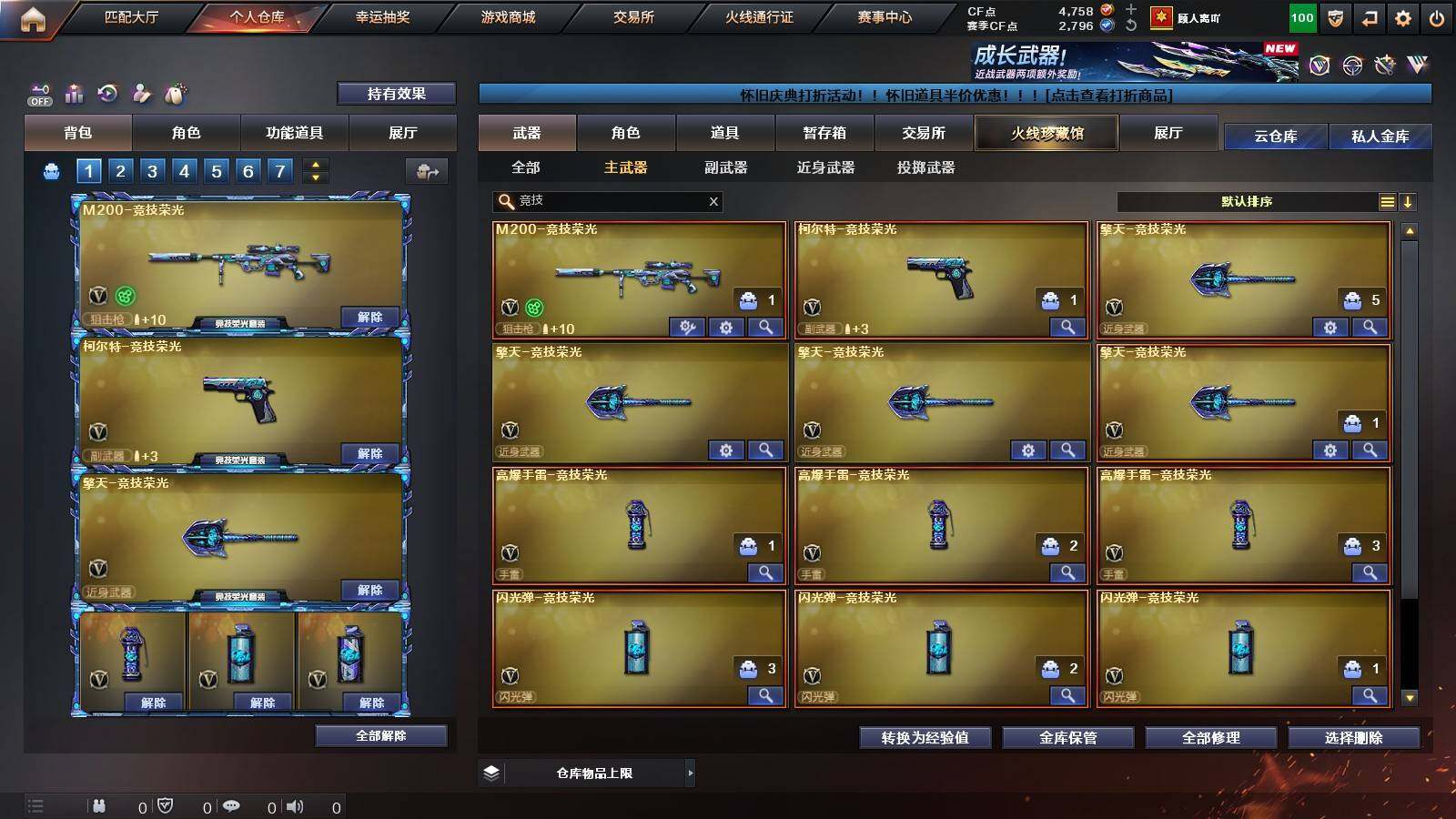 【英雄级武器】:M200-竞技荣光,柯尔特-竞技荣光,擎天-竞技荣光*4,高爆手雷-竞技荣光*3,烟雾弹-竞技荣光*3,闪光弹-竞技荣光*3,USP-雷暴,QBZ03-金色蔷薇,Scar Light-白虎,无影-神兵利器,M4A1-雷神,AWM-天龙,Barrett-毁灭