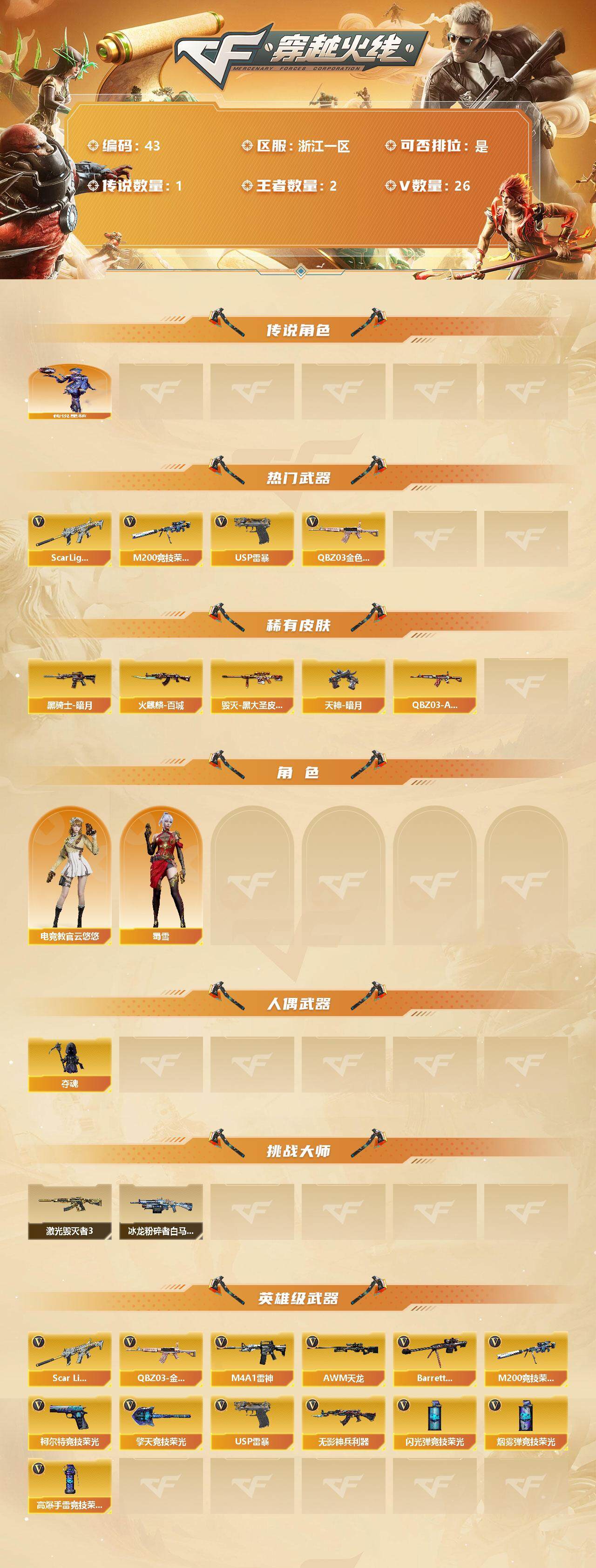 [12655291]浙江一区-26V-2王者-0炫金 【传说角色】:传说星骇 【热门武器】:QBZ03-金色蔷薇,Scar Light-白虎,M200-竞技荣光,USP-雷暴 【稀有皮肤】:QBZ03-AG-CFPLS19冠军,火麒麟-百城,黑骑士-暗月,毁灭-黑大圣皮肤,天神-暗月 【角色】:电竞教官-云悠悠,蜀雪 【人偶武器】:夺魂 【挑战大师】:激光毁灭者III,冰龙粉碎者-白马银枪 【英雄级武器】:M200-竞技荣光,柯尔特-竞技荣光,擎天-竞技荣光*4,高爆手雷-竞技荣光*3,烟雾弹-竞技荣光*3,闪光弹-竞技荣光*3,USP-雷暴,QBZ03-金色蔷薇,Scar Light-白虎,无影-神兵利器,M4A1-雷神,AWM-天龙,Barrett-毁灭 【特殊枪械】:1白虎