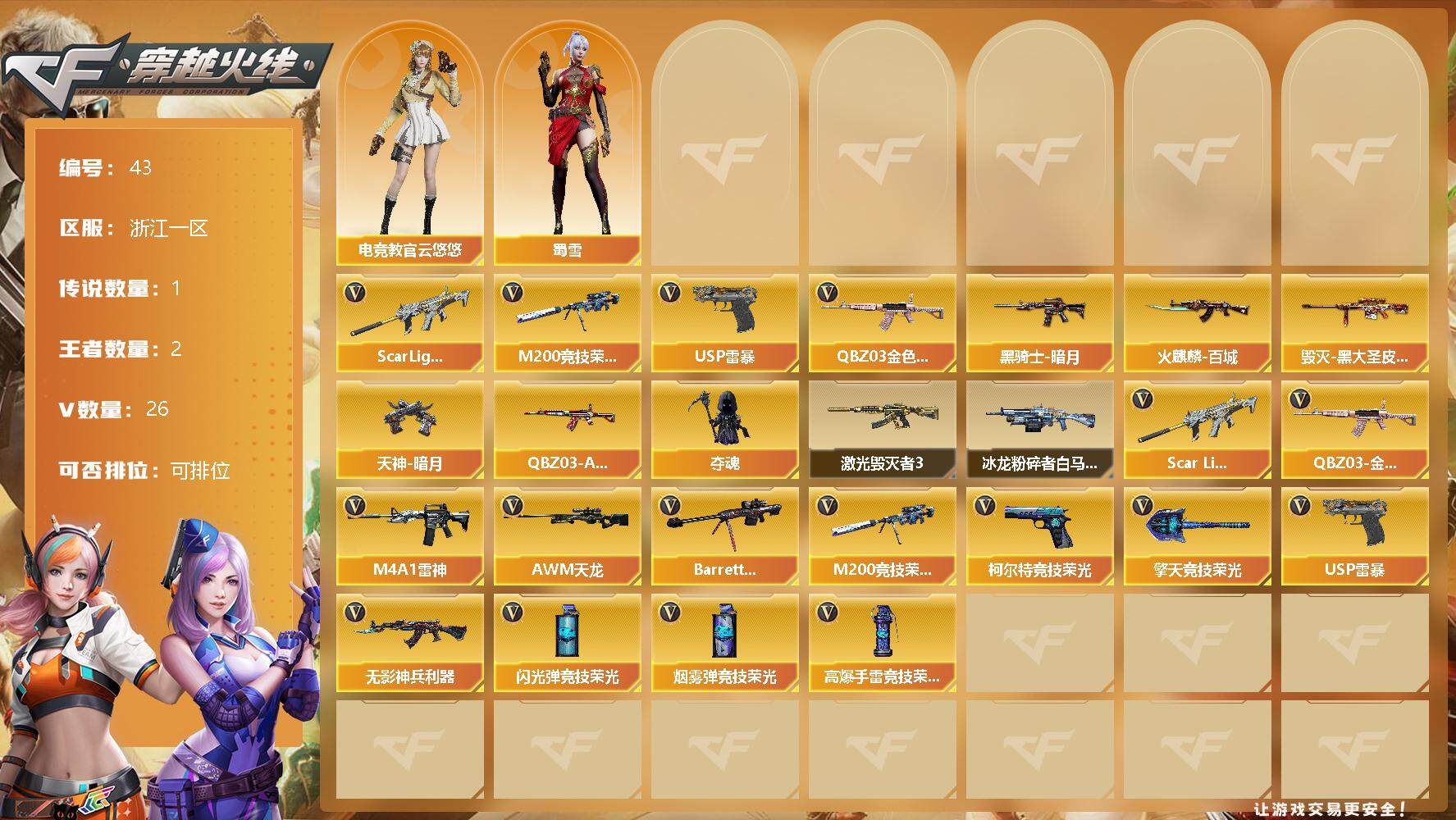 - [12451531]【197】93V/100级/元帅/26王者/5炫金/4英雄/QBZ03-金色蔷薇/M14EBR-玄武/Scar Light-白虎/HK417-朱雀/M4A1青龙/M200-幻神/M200-竞技荣光/死亡之眼/白虎-电玩蓝兔/柯尔特-冠军之特/Kar98k-星神/Cat-刀锋/炼狱-迷你小钢/毒蜂/M4A1-黑骑士/汤姆逊-烈龙/加特林-炼狱/雷神-小红/COP-白鲨/USP雷暴/COP-堕天神/COP 357-幻灵/沙鹰-修罗/Knife-冠军之刃/黄金猫猫手套-白鲨/金刚伞/炫金火麒麟/炫金黑骑士/炫金千变/炫金修罗/炫金黑武士/王者之霆/M200-幻神音效卡/AK47-火麒麟音效卡/M4A1-雷神音效卡/M4A1-黑骑士音效卡/Barrett-毁灭音效卡/金色蔷薇音效卡/AWM-裁决音效卡/白虎音效卡/星神音效卡/绝迹语音包/幻神周瑜/幻神冠军之幻/幻神降龙/M200-幻神-荣耀世冠白鲨/幻神-纸灯龙皮肤/白虎-电玩粉兔/QBZ03冠军之薇/雷神荣耀之魄/M4A1-雷神CFS 2019/雷神冠军之魄/雷神-R.LGD-CFPLS18冠军/火麒麟-AG战队皮肤/火麒麟-冠军之心/火麒麟-平天大圣/火麒麟-盘古/火麒麟-百城/火麒麟-心动糖果/黑骑士-冠军之势/黑骑士-地狱火/黑骑士-伏羲/黑龙-墨子皮肤/毁灭耀金皮肤/毁灭-冠军之怒/毁灭-BEAN-2020MVP/毁灭-风暴/天龙-能量核心/沙鹰-修罗-CF STAR/修罗-冠军之魂/天神-暗月/屠龙-荣耀之锋/王者-瞳-闭月羞花/王者-零-华冠丽服/王者-葵-貂蝉/灵狐者-职业经理/零/炫/幽/电竞教官-云悠悠/司雨/蜀雪/职业选手/暗黑审判/青霞仙子/Barrett-夜玫瑰/巴雷特-零-水下丽影/王者Barrett-英勇金戈/AWM-灵狐-15周年嘉年华/海滩汪汪-巴雷特/迷你深渊冰龙/迷你艾比/迷你超能女侍/迷你裂空之翼/夺魂/迷你牛牛/迷你生化手雷/灵狐娃娃手雷/深渊终结者手雷/闪光弹-貂蝉/高爆手雷-大乔/黑龙吞噬者/双面神/超级对讲机/机甲撕裂者/神圣爆裂者-末日/试炼破坏者/激光毁灭者/激光毁灭者III-白马银枪/冰龙粉碎者-白马银枪/柯尔特-竞技荣光/擎天-竞技荣光/高爆手雷-竞技荣光/烟雾弹-竞技荣光/闪光弹-竞技荣光/幻灵之锋/麒麟刺-堕天神/龙啸-堕天神/M4A1-武圣/Glock18-武