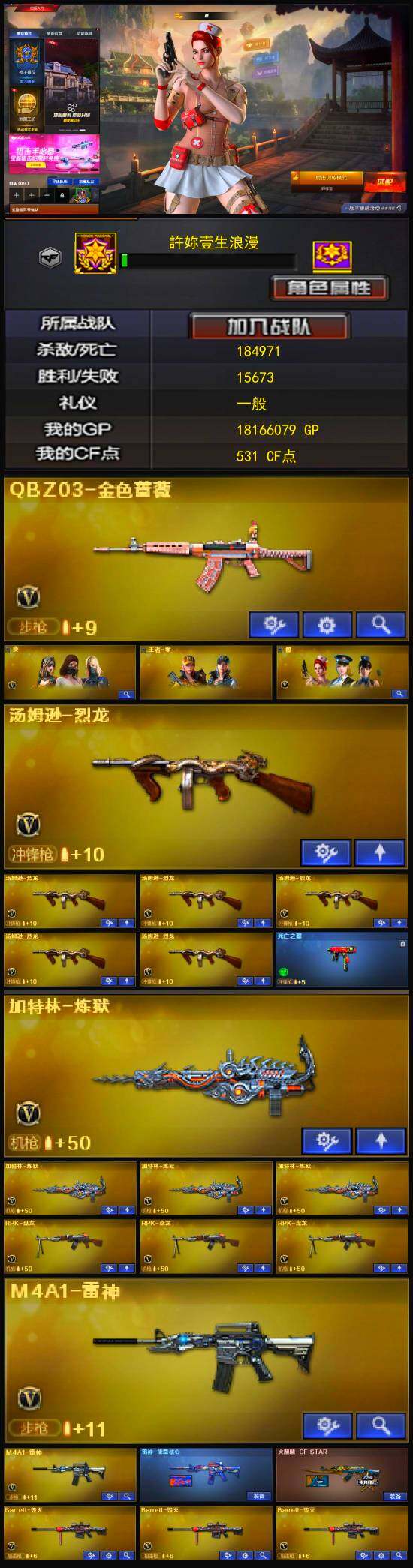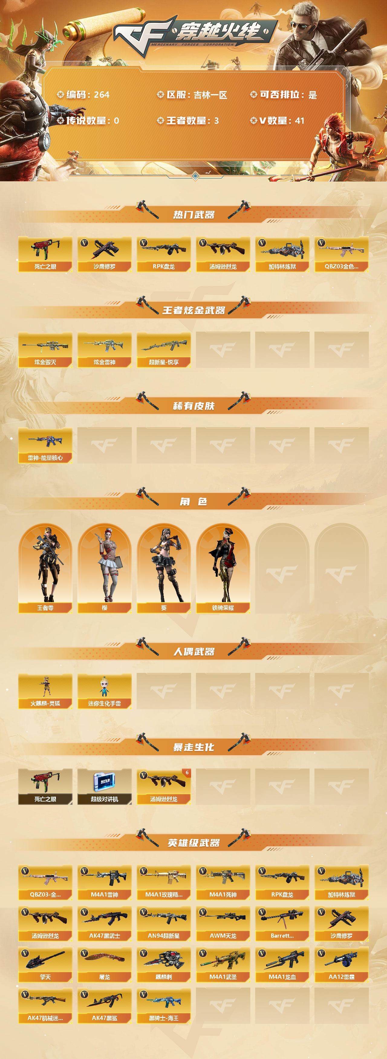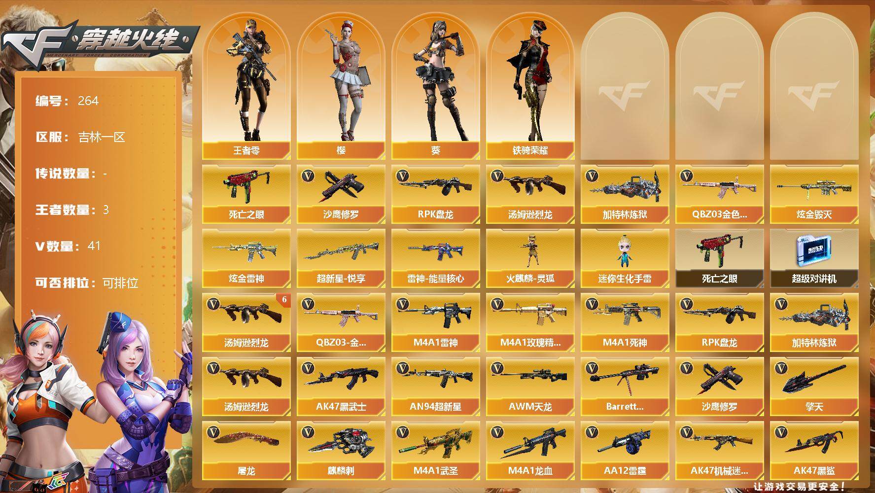 [12655643]【264】39V/102级/荣耀元首/3王者/2炫金/2英雄/QBZ03-金色蔷薇/死亡之眼/汤姆逊-烈龙/RPK-盘龙/加特林-炼狱/沙鹰-修罗/炫金毁灭/炫金雷神/超新星-悦享/雷神-能量核心/王者-零/葵/樱/铁骑荣耀/火麒麟-灵狐/迷你生化手雷/超级对讲机/6烈龙/M4A1-武圣/M4A1-雷神/M4A1-玫瑰精灵/M4A1-死神/AK47-黑武士/AN94-超新星/AWM-天龙/Barrett-毁灭/M4A1-龙血/AK47-机械迷城/AA-12-雷霆/AK47-黑鲨/黑骑士-海王/麒麟刺/擎天/屠龙