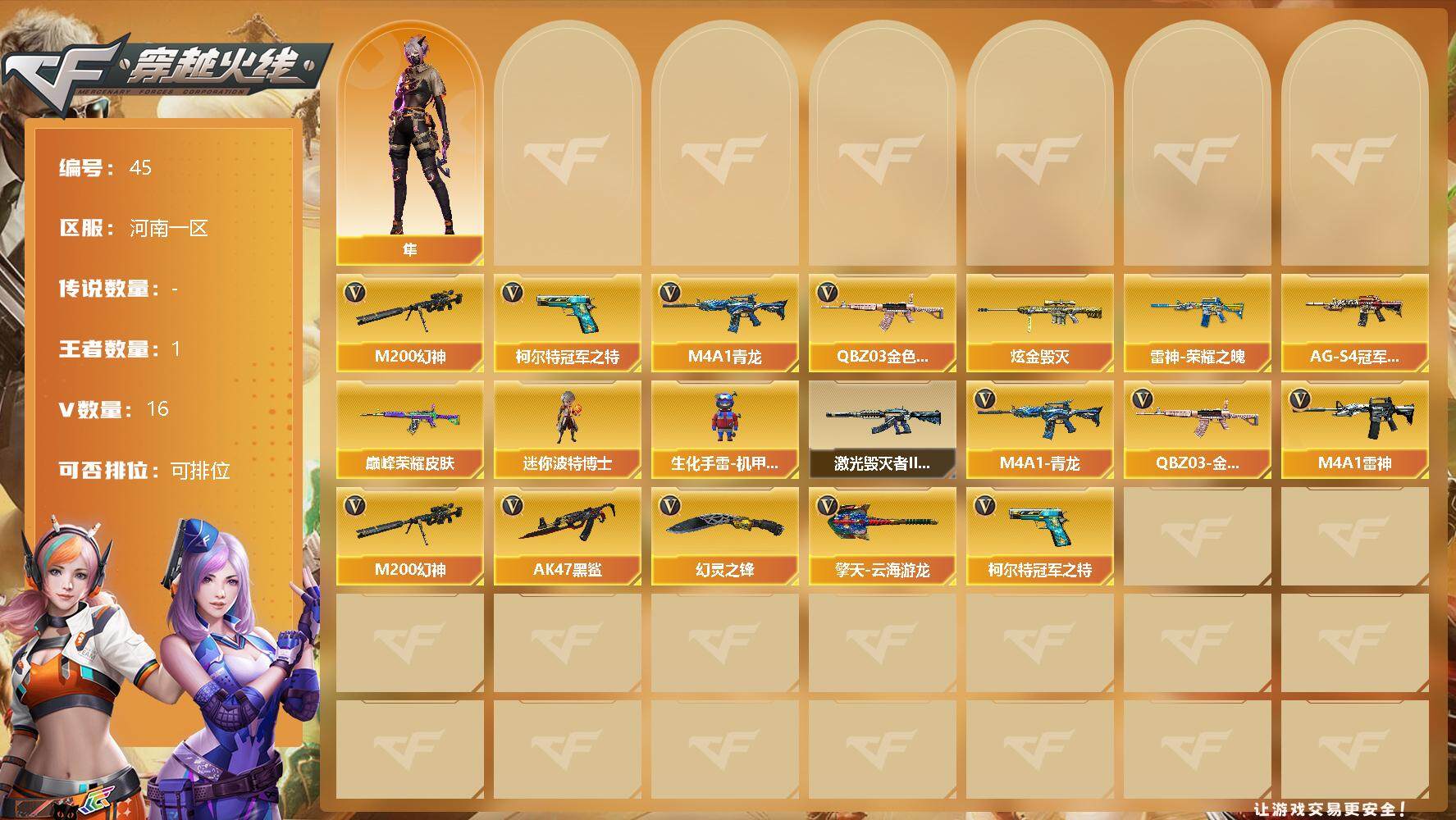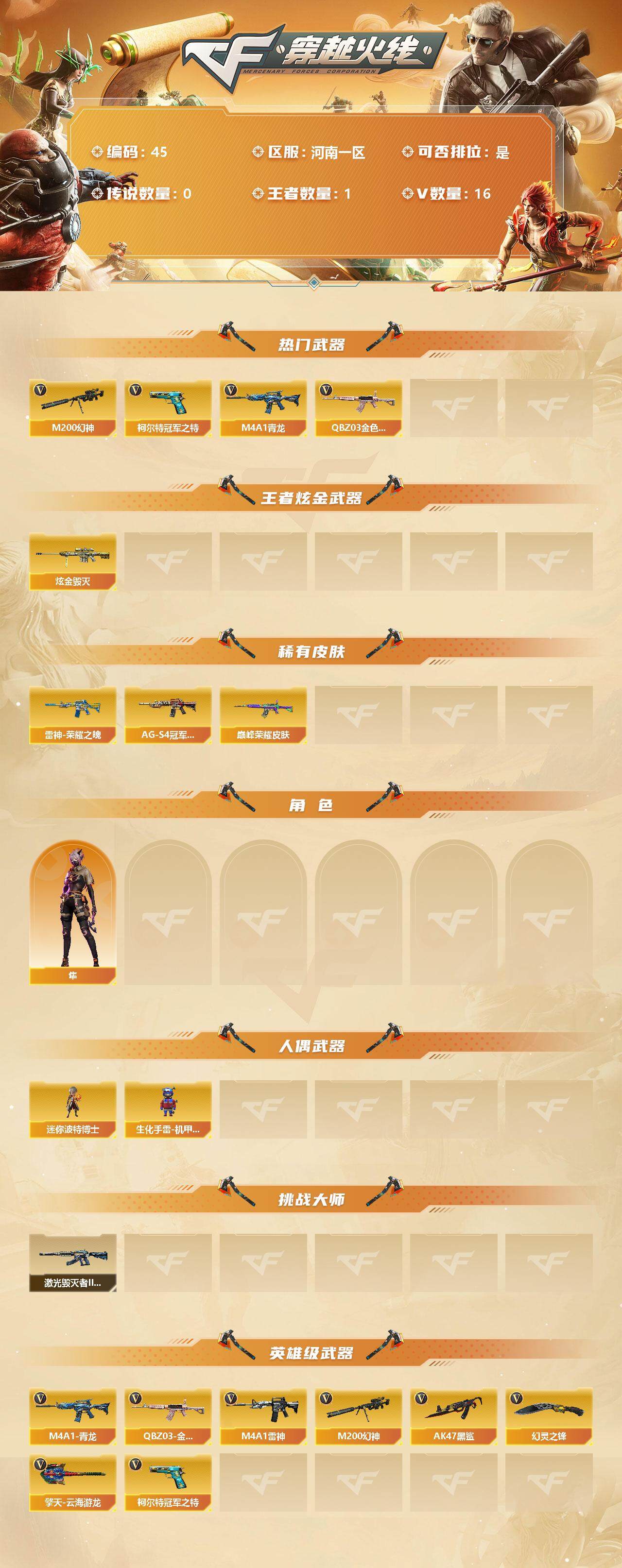 [12655671]河南一区-16V-1王者-1炫金 【热门武器】:QBZ03-金色蔷薇,M4A1-青龙,M200-幻神,柯尔特-冠军之特 【王者炫金武器】:炫金毁灭 【稀有皮肤】:QBZ03-巅峰荣耀皮肤,雷神-荣耀之魄,黑骑士-AG-S4冠军典藏 【角色】:隼 【人偶武器】:迷你波特博士,生化手雷-机甲核心 【挑战大师】:激光毁灭者III-白马银枪 【英雄级武器】:幻灵之锋,QBZ03-金色蔷薇,M4A1-青龙,M4A1-雷神,M200-幻神,AK47-黑鲨,柯尔特-冠军之特,擎天-云海游龙 【特殊枪械】: