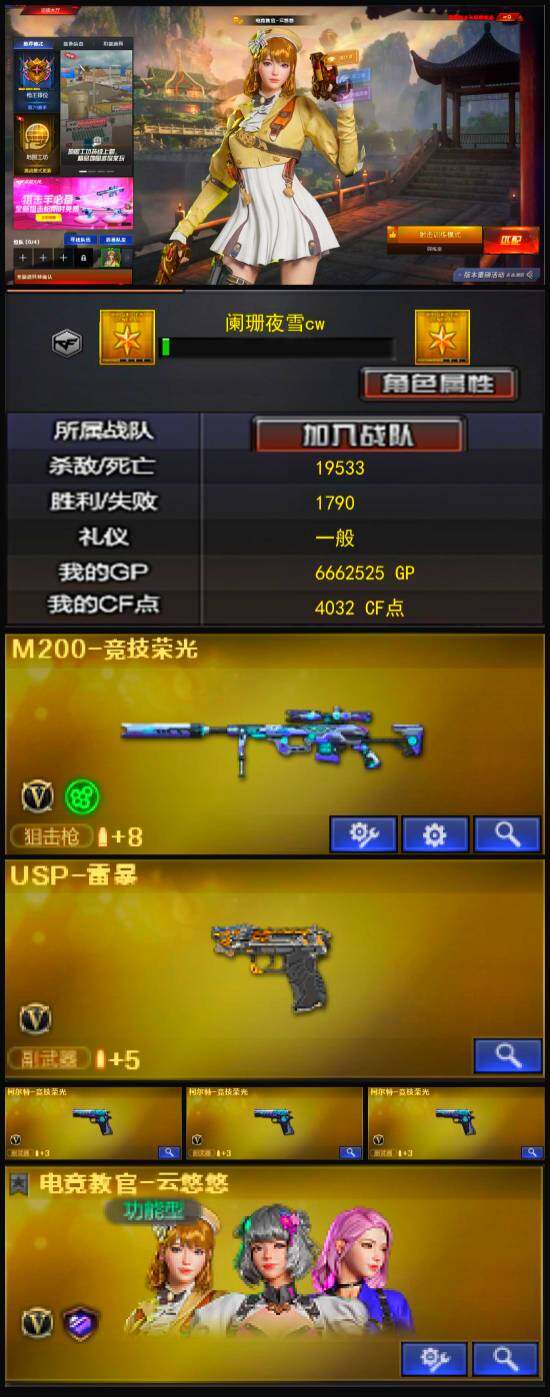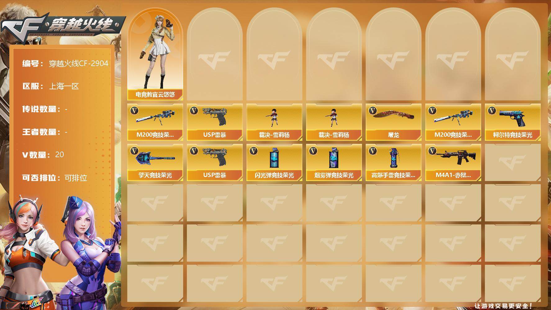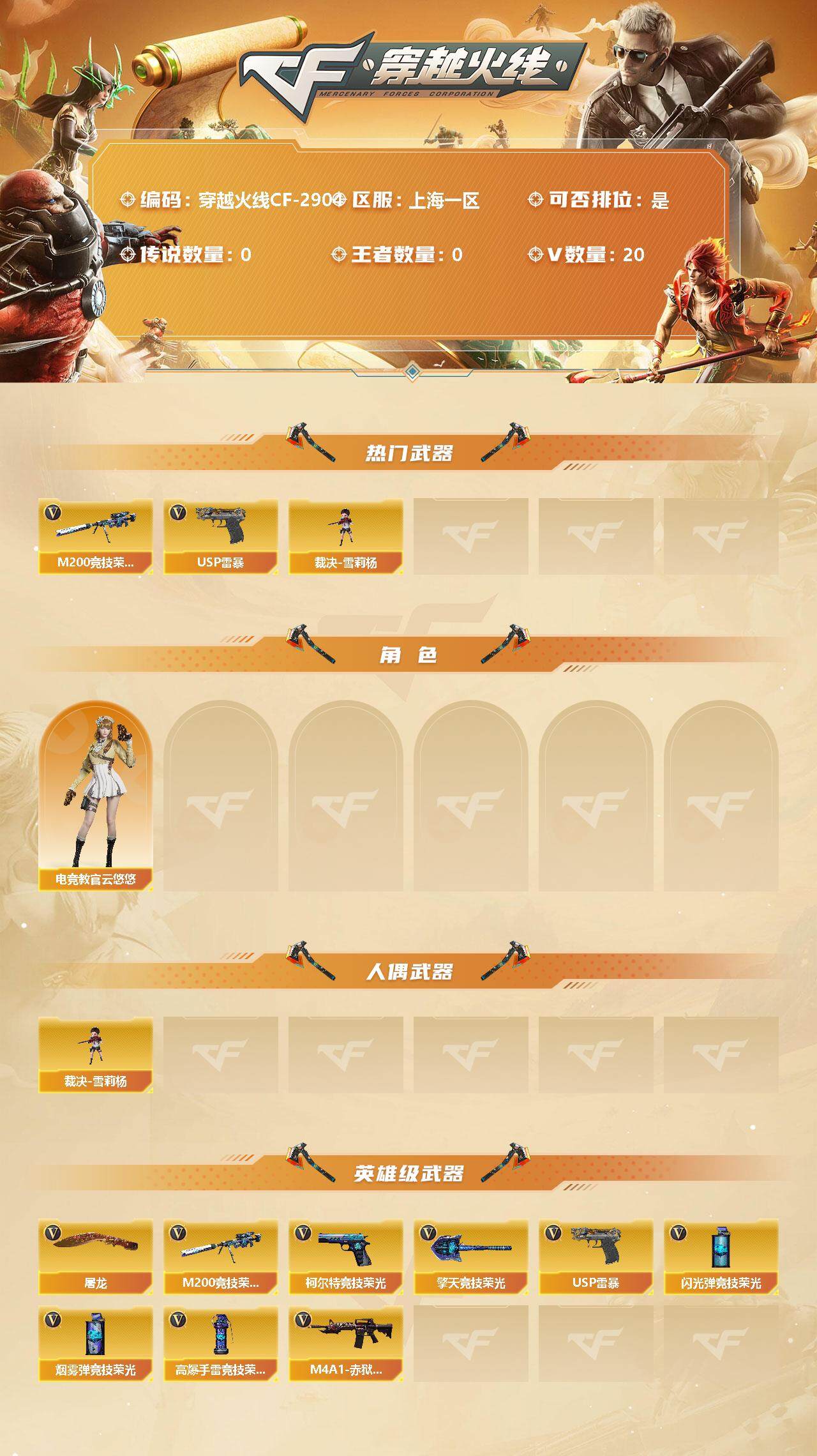 [12656278]上海一区-20V-0王者-0炫金 【热门武器】:M200-竞技荣光,裁决-雪莉杨,USP-雷暴 【角色】:电竞教官-云悠悠 【人偶武器】:裁决-雪莉杨 【英雄级武器】:M200-竞技荣光,柯尔特-竞技荣光*3,擎天-竞技荣光*2,高爆手雷-竞技荣光*5,烟雾弹-竞技荣光*2,闪光弹-竞技荣光*2,USP-雷暴,M4A1-赤狱骑士,屠龙*2 【特殊枪械】: