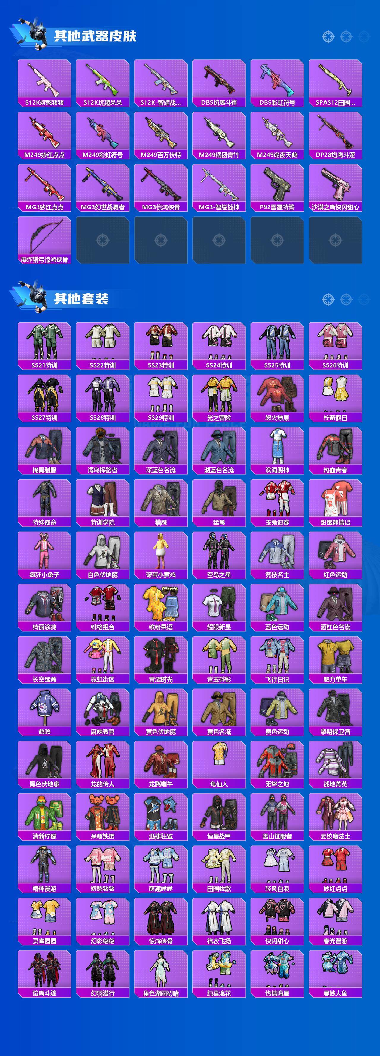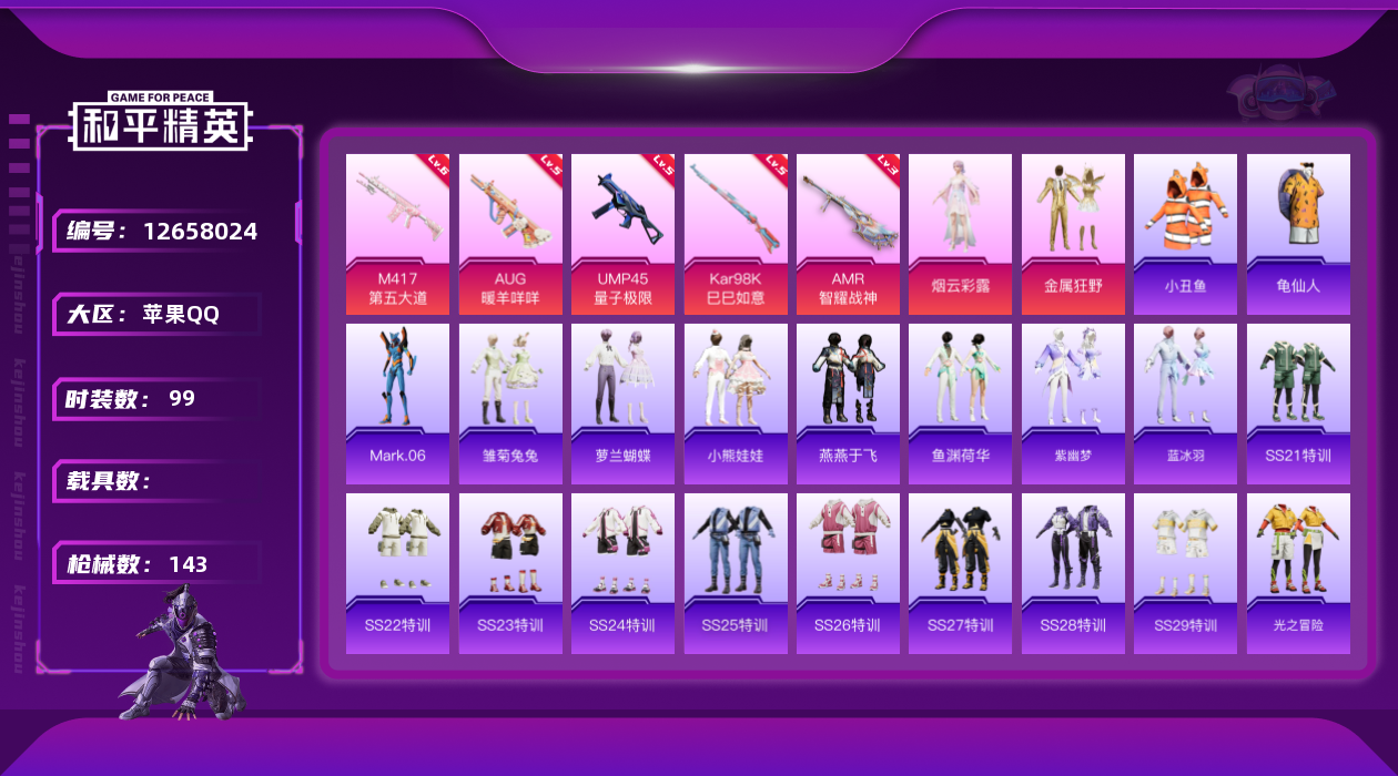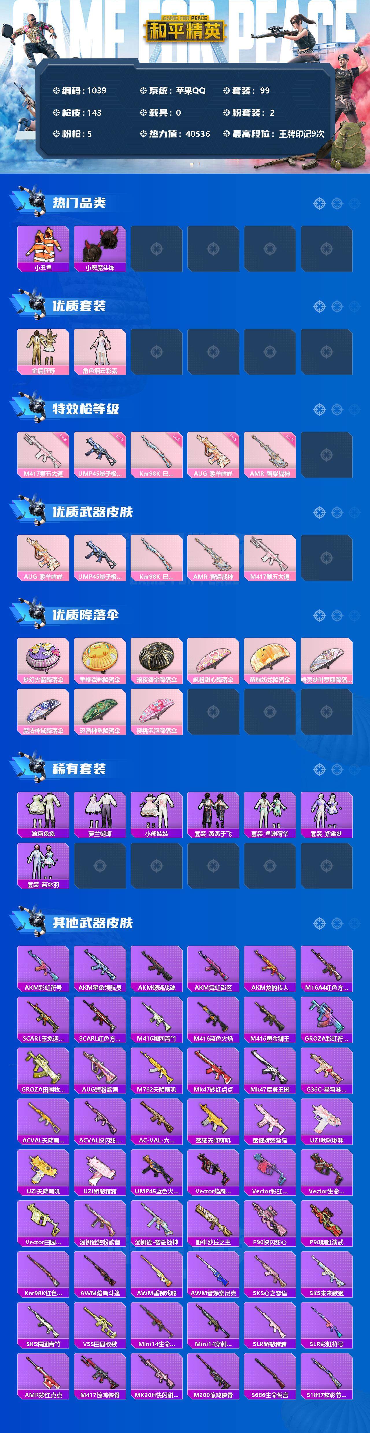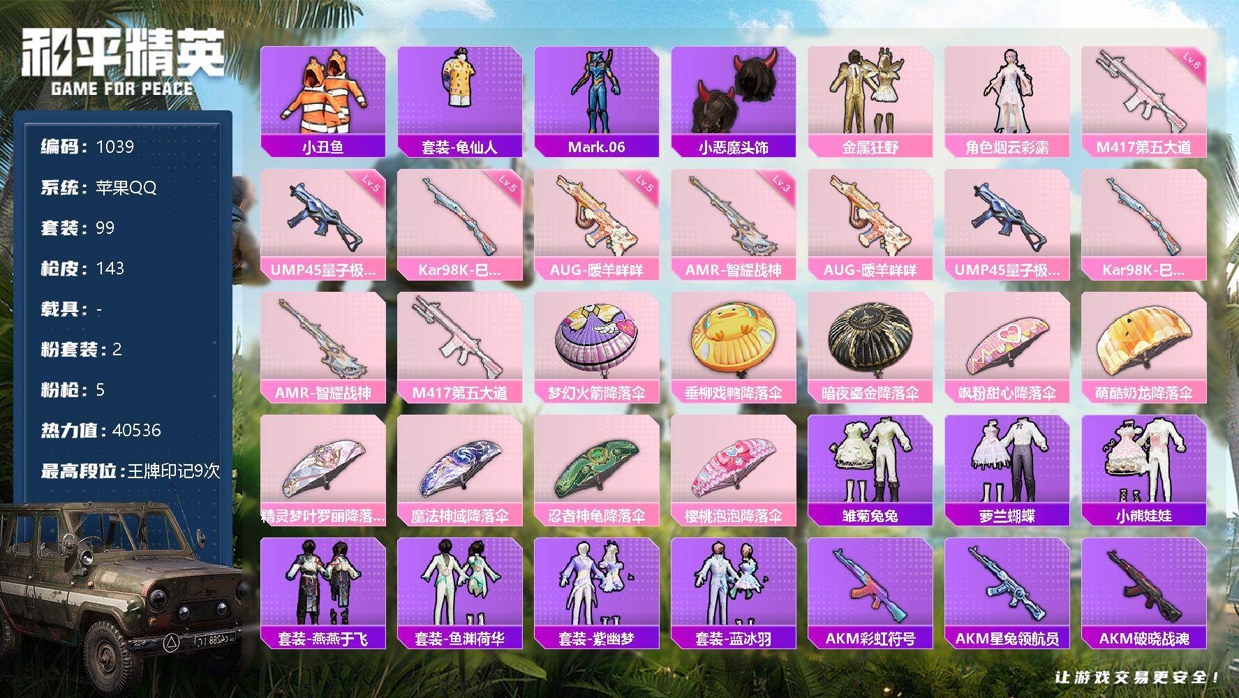 [12658024]苹果 手Q-2粉装-5特效枪-0载具-0粉色飞行器-40536热力值-9王牌印记-99套装-143枪皮 【热门品类】:套装-小丑鱼,套装-龟仙人,角色-Mark.06,小恶魔头饰 【粉色套装】:粉装-金属狂野,角色-烟云彩露 【粉色枪皮等级】:AUG-暖羊咩咩(五级),UMP45-量子极限(五级),Kar98K-巳巳如意(五级),AMR-智耀战神(三级),M417-第五大道(六级) 【粉色枪皮】:AUG-暖羊咩咩,UMP45-量子极限,Kar98K-巳巳如意,AMR-智耀战神,M417-第五大道 【粉色降落伞】:梦幻火箭降落伞,垂柳戏鸭降落伞,暗夜鎏金降落伞,飒粉甜心降落伞,萌酷奶龙降落伞,精灵梦叶罗丽降落伞,魔法神域降落伞,忍者神龟降落伞,樱桃泡泡降落伞 【稀有套装】:套装-龟仙人,套装-雏菊兔兔,套装-萝兰蝴蝶,套装-小熊娃娃,套装-燕燕于飞,套装-鱼渊荷华,套装-紫幽梦,套装-蓝冰羽 【稀有枪皮】:AKM-彩虹符号,AKM-星兔领航员,AKM-破晓战魂,AKM-霓虹街区,AKM-龙的传人,M16A4-红色方程式,SCAR-L-玉兔迎春,SCAR-L-红色方程式,M416-糯团青竹,M416-蓝色火焰,M416-黄金狮王,GROZA-彩虹符号,GROZA-田园牧歌,AUG-耀粉歌者,M762-天降萌叽,Mk47-妙红点点,Mk47-摩登王国,G36C-星穹咏叹调,AC-VAL-天降萌叽,AC-VAL-快闪甜心,AC-VAL-六号稻草人,蜜獾-天降萌叽,蜜獾-娇憨猪猪,UZI-啾咪啾咪,UZI-天降萌叽,UZI-娇憨猪猪,UMP45-蓝色火焰,Vector-焰鹰斗篷,Vector-彩虹符号,Vector-生命誓言,Vector-田园牧歌,汤姆逊-耀粉歌者,汤姆逊-智耀战神,野牛-沙丘之主,P90-快闪甜心,P90-翩跹演武,Kar98K-红色方程式,AWM-焰鹰斗篷,AWM-垂柳戏鸭,AWM-音爆索尼克,SKS-心之恋语,SKS-未来歌姬,SKS-糯团青竹,VSS-田园牧歌,Mini14-生命誓言,Mini14-穿刺龙虾,SLR-娇憨猪猪,SLR-彩虹符号,AMR-妙红点点,M417-惊鸿侠骨,MK20-H-快闪甜心,M200-惊鸿侠骨,S686-生命誓言,S1897-炫彩节奏,S12K-玩趣呆呆,S12K-娇憨猪猪,S12K-智耀战神,DBS-焰鹰斗篷,DBS