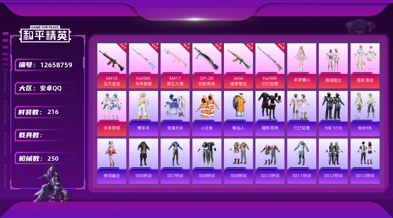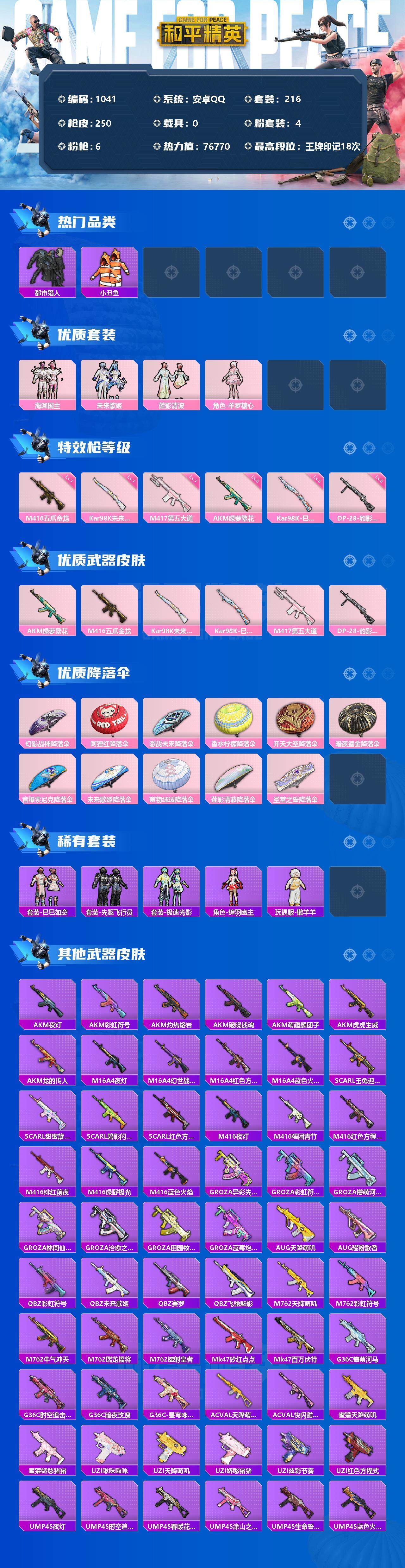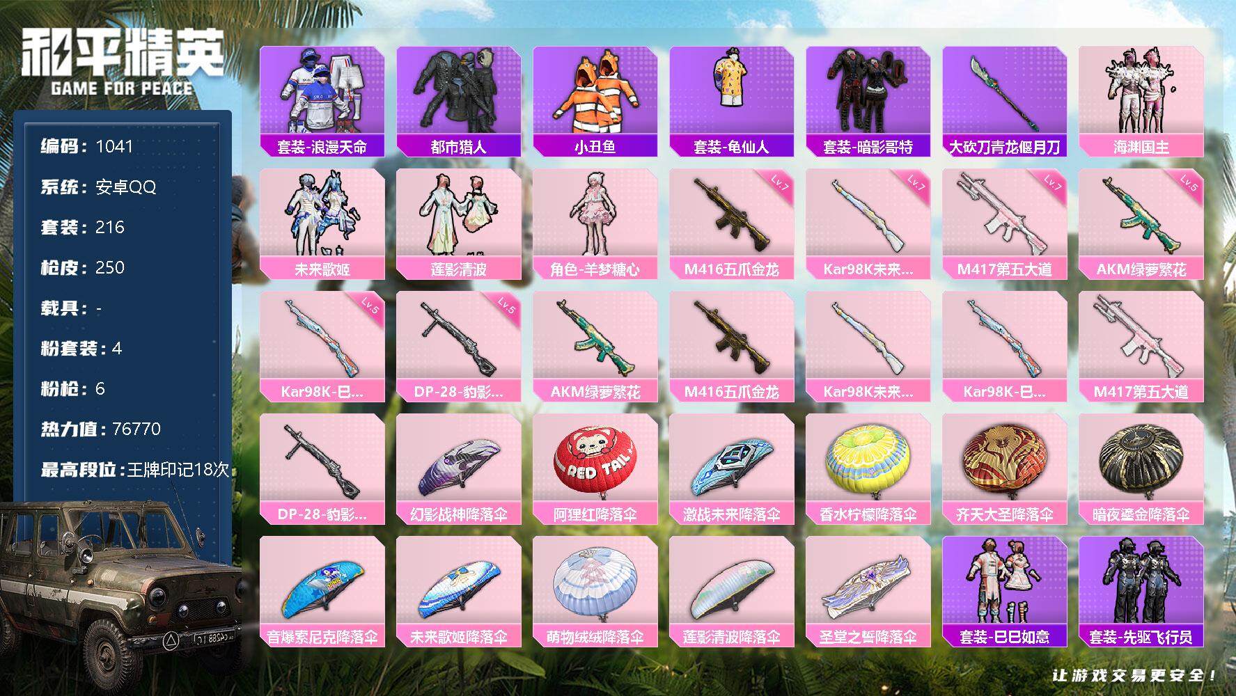 [12658759]安卓 手Q-4粉装-6特效枪-0载具-0粉色飞行器-76770热力值-18王牌印记-216套装-250枪皮 【热门品类】:套装-浪漫天命,套装-都市猎人,套装-小丑鱼,套装-龟仙人,套装-暗影哥特,大砍刀-青龙偃月刀 【粉色套装】:粉装-海渊国主,粉装-未来歌姬,粉装-莲影清波,角色-羊梦糖心 【粉色枪皮等级】:AKM-绿萝繁花(五级),M416-五爪金龙(七级),Kar98K-未来歌姬(七级),Kar98K-巳巳如意(五级),M417-第五大道(七级),DP-28-豹影疾电(五级) 【粉色枪皮】:AKM-绿萝繁花,M416-五爪金龙,Kar98K-未来歌姬,Kar98K-巳巳如意,M417-第五大道,DP-28-豹影疾电 【粉色降落伞】:幻影战神降落伞,阿狸红降落伞,激战未来降落伞,香水柠檬降落伞,齐天大圣降落伞,暗夜鎏金降落伞,音爆索尼克降落伞,未来歌姬降落伞,萌物绒绒降落伞,莲影清波降落伞,圣堂之誓降落伞 【稀有套装】:套装-龟仙人,套装-巳巳如意,套装-先驱飞行员,套装-极速光影,角色-绛羽幽主,玩偶服-懒羊羊 【稀有枪皮】:AKM-夜灯,AKM-彩虹符号,AKM-灼热熔岩,AKM-破晓战魂,AKM-萌趣颜团子,AKM-虎虎生威,AKM-龙的传人,M16A4-夜灯,M16A4-幻世战舞者,M16A4-红色方程式,M16A4-蓝色火焰,SCAR-L-玉兔迎春,SCAR-L-甜蜜旋律,SCAR-L-碧影闪光,SCAR-L-红色方程式,M416-夜灯,M416-糯团青竹,M416-红色方程式,M416-绯红前夜,M416-绿野极光,M416-蓝色火焰,GROZA-异彩先驱,GROZA-彩虹符号,GROZA-懵萌河马,GROZA-林间仙鹿,GROZA-治愈之星,GROZA-田园牧歌,GROZA-蓝莓炮弹,AUG-天降萌叽,AUG-耀粉歌者,QBZ-彩虹符号,QBZ-未来歌姬,QBZ-赛罗,QBZ-飞驰魅影,M762-天降萌叽,M762-彩虹符号,M762-牛气冲天,M762-瑞龙福将,M762-镭射皇者,Mk47-妙红点点,Mk47-百万伏特,G36C-懵萌河马,G36C-时空追击者,G36C-暗夜玫瑰,G36C-星穹咏叹调,AC-VAL-天降萌叽,AC-VAL-快闪甜心,蜜獾-天降萌叽,蜜獾-娇憨猪猪,UZI-啾咪啾咪,UZI-天降萌叽,UZI-娇憨猪猪,UZI