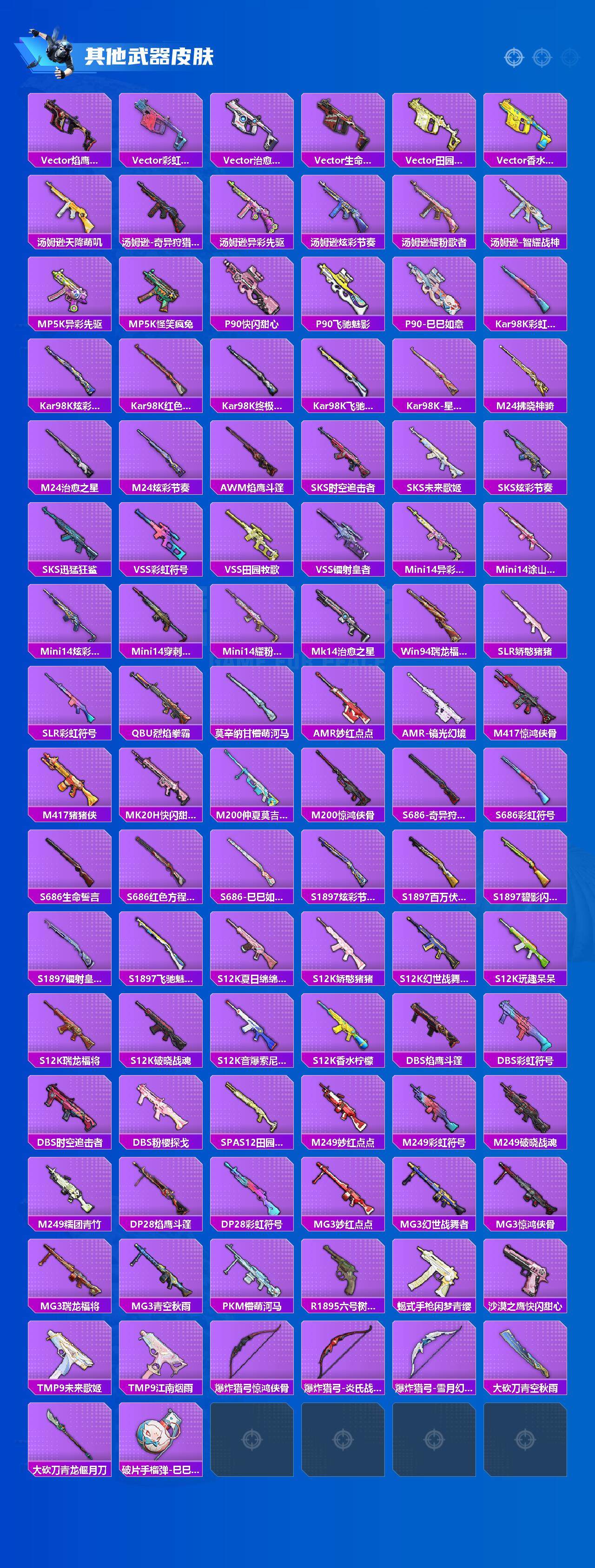 【稀有枪皮】:AKM-夜灯,AKM-彩虹符号,AKM-灼热熔岩,AKM-破晓战魂,AKM-萌趣颜团子,AKM-虎虎生威,AKM-龙的传人,M16A4-夜灯,M16A4-幻世战舞者,M16A4-红色方程式,M16A4-蓝色火焰,SCAR-L-玉兔迎春,SCAR-L-甜蜜旋律,SCAR-L-碧影闪光,SCAR-L-红色方程式,M416-夜灯,M416-糯团青竹,M416-红色方程式,M416-绯红前夜,M416-绿野极光,M416-蓝色火焰,GROZA-异彩先驱,GROZA-彩虹符号,GROZA-懵萌河马,GROZA-林间仙鹿,GROZA-治愈之星,GROZA-田园牧歌,GROZA-蓝莓炮弹,AUG-天降萌叽,AUG-耀粉歌者,QBZ-彩虹符号,QBZ-未来歌姬,QBZ-赛罗,QBZ-飞驰魅影,M762-天降萌叽,M762-彩虹符号,M762-牛气冲天,M762-瑞龙福将,M762-镭射皇者,Mk47-妙红点点,Mk47-百万伏特,G36C-懵萌河马,G36C-时空追击者,G36C-暗夜玫瑰,G36C-星穹咏叹调,AC-VAL-天降萌叽,AC-VAL-快闪甜心,蜜獾-天降萌叽,蜜獾-娇憨猪猪,UZI-啾咪啾咪,UZI-天降萌叽,UZI-娇憨猪猪,UZI