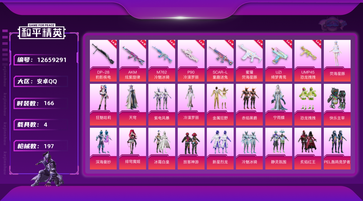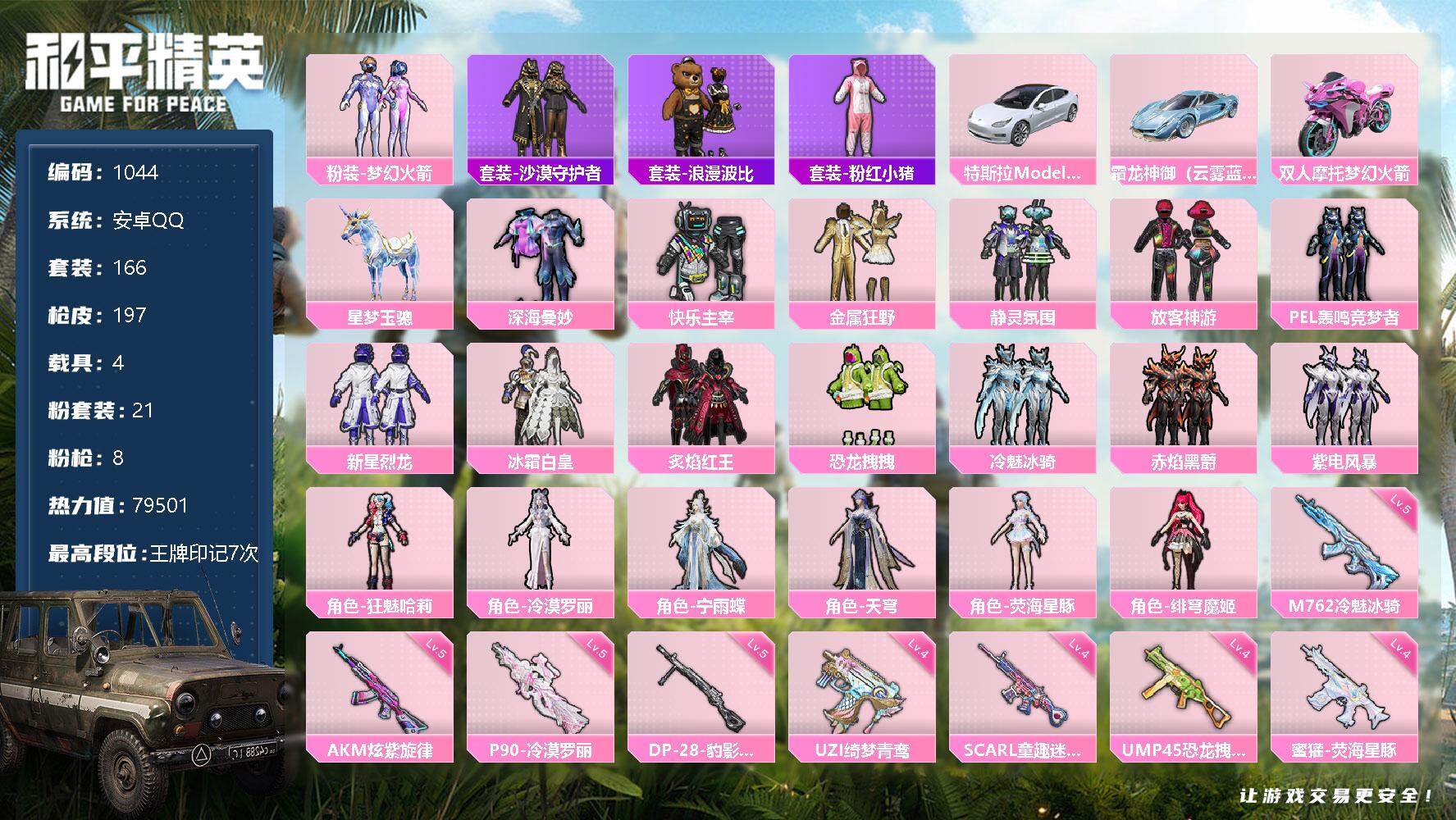 [12659291]安卓 手Q-21粉装-8特效枪-4载具-6粉色飞行器-79501热力值-7王牌印记-166套装-197枪皮 【热门品类】:粉装-梦幻火箭,套装-沙漠守护者,套装-浪漫波比,套装-粉红小猪 【粉色载具】:特斯拉Model 3(珍珠白),霜龙神御(云雾蓝),双人摩托-梦幻火箭,星梦玉骢 【粉色套装】:粉装-深海曼妙,粉装-快乐主宰,粉装-梦幻火箭,粉装-金属狂野,粉装-静灵氛围,粉装-放客神游,粉装-PEL轰鸣竞梦者,粉装-新星烈龙,粉装-冰霜白皇,粉装-炙焰红王,粉装-恐龙拽拽,粉装-冷魅冰骑,粉装-赤焰黑爵,粉装-紫电风暴,角色-狂魅哈莉,角色-冷漠罗丽,角色-宁雨蝶,角色-天穹,角色-荧海星豚,角色-绯穹魔姬 【粉色枪皮等级】:AKM-炫紫旋律(五级),SCAR-L-童趣迷兔(四级),M762-冷魅冰骑(五级),蜜獾-荧海星豚(四级),UZI-绮梦青鸾(四级),UMP45-恐龙拽拽(四级),P90-冷漠罗丽(五级),DP-28-豹影疾电(五级) 【粉色枪皮】:AKM-炫紫旋律,SCAR-L-童趣迷兔,M762-冷魅冰骑,蜜獾-荧海星豚,UZI-绮梦青鸾,UMP45-恐龙拽拽,P90-冷漠罗丽,DP-28-豹影疾电 【粉色飞行器】:深海曼妙飞行器,梦幻火箭飞行器,炫紫旋律飞行器,神秘黑猫飞行器,古堡领主飞行器,幻星舰长飞行器 【粉色降落伞】:深海曼妙降落伞,快乐主宰降落伞,至尊龙雀降落伞,梦幻火箭降落伞,天启纪元降落伞,金风玉露降落伞,龙虾霸霸降落伞,PEL轰鸣竞梦者降落伞,神秘黑猫降落伞,古堡领主降落伞,童趣迷兔降落伞,青春物语降落伞,恐龙拽拽降落伞,冷魅冰骑降落伞,星梦奇缘降落伞,幻星舰长降落伞,幻彩电音降落伞,双重狂想降落伞,冷漠罗丽降落伞,荧海星豚降落伞,绯穹魔姬降落伞 【稀有套装】:套装-暖暖向日葵,套装-霓虹热舞,套装-极速光影,套装-彩虹兔,套装-云朵鹅,套装-雪绒豹,套装-混沌火种,角色-时希公主,角色-灵公主,角色-乐音,套装-蜜露汐语,套装-蓝海鲸歌,角色-绛羽幽主,角色-夜瞳黯灵,套装-朱霞炽焰,套装-凌霄紫焰,套装-擎苍青焰 【稀有枪皮】:AKM-PEL轰鸣竞梦者,AKM-天启纪元,AKM-彩虹符号,AKM-恐龙拽拽,AKM-沙漠守护者,AKM-生命誓言,AKM-破晓战魂,AKM-萌趣颜团子,AKM-虎虎生威,M16A4-快乐主宰,M16A