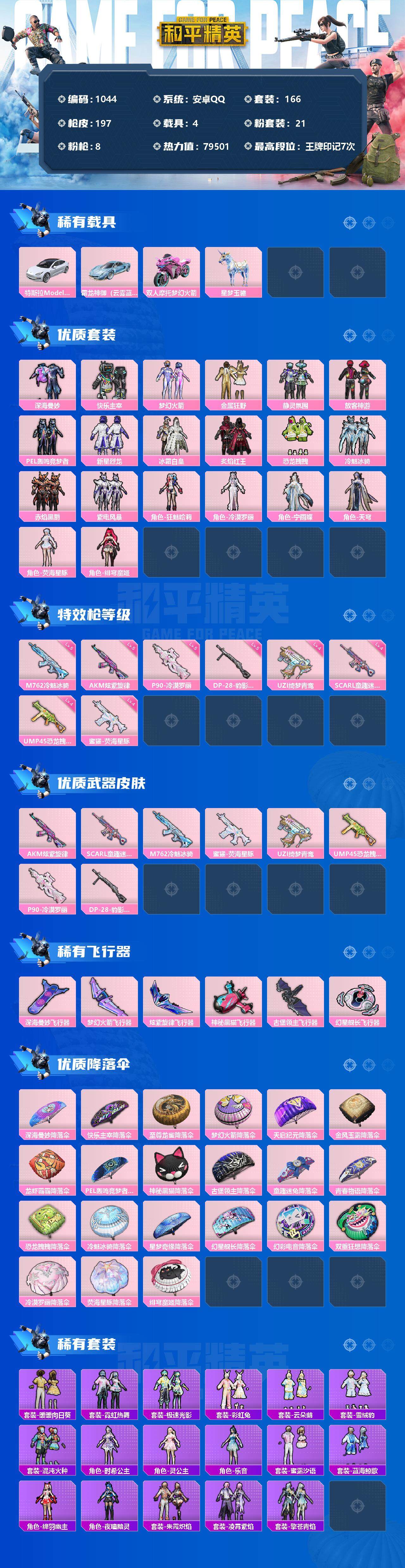 [12659291]安卓 手Q-21粉装-8特效枪-4载具-6粉色飞行器-79501热力值-7王牌印记-166套装-197枪皮