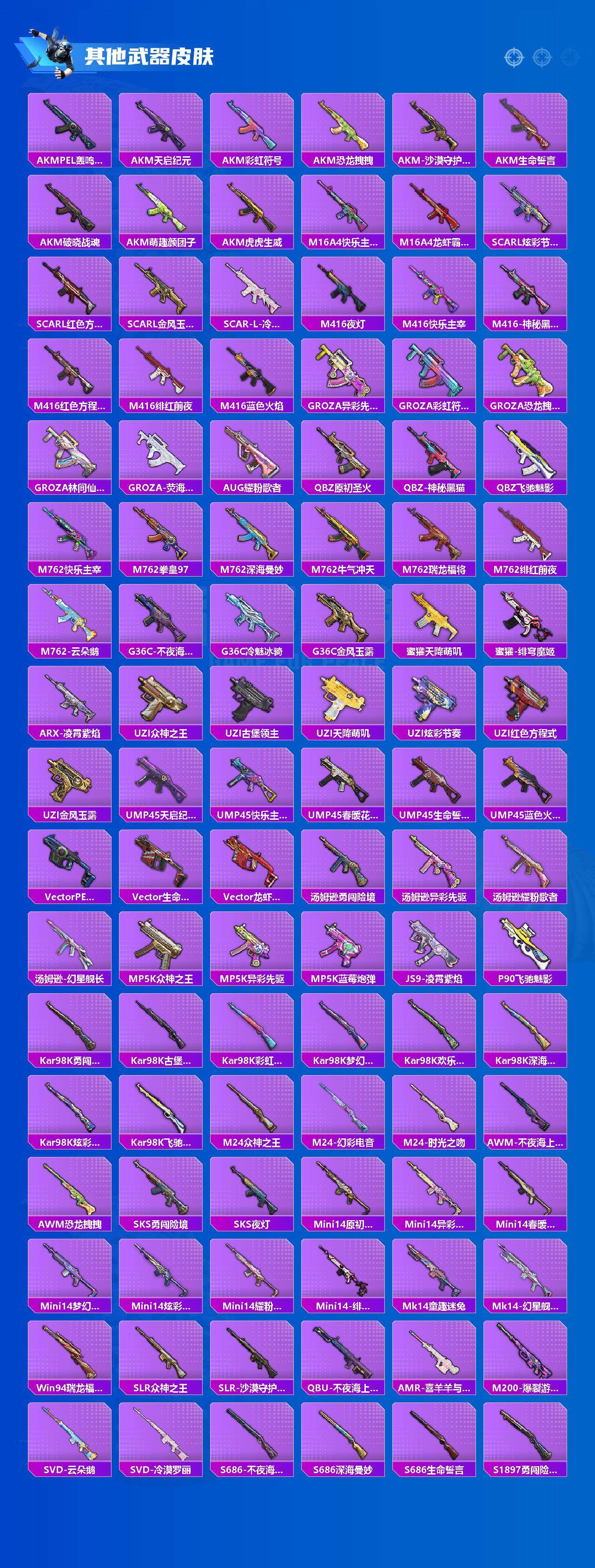 AKM-炫紫旋律,SCAR-L-童趣迷兔,M762-冷魅冰骑,UZI-绮梦青鸾,UMP45-恐龙拽拽