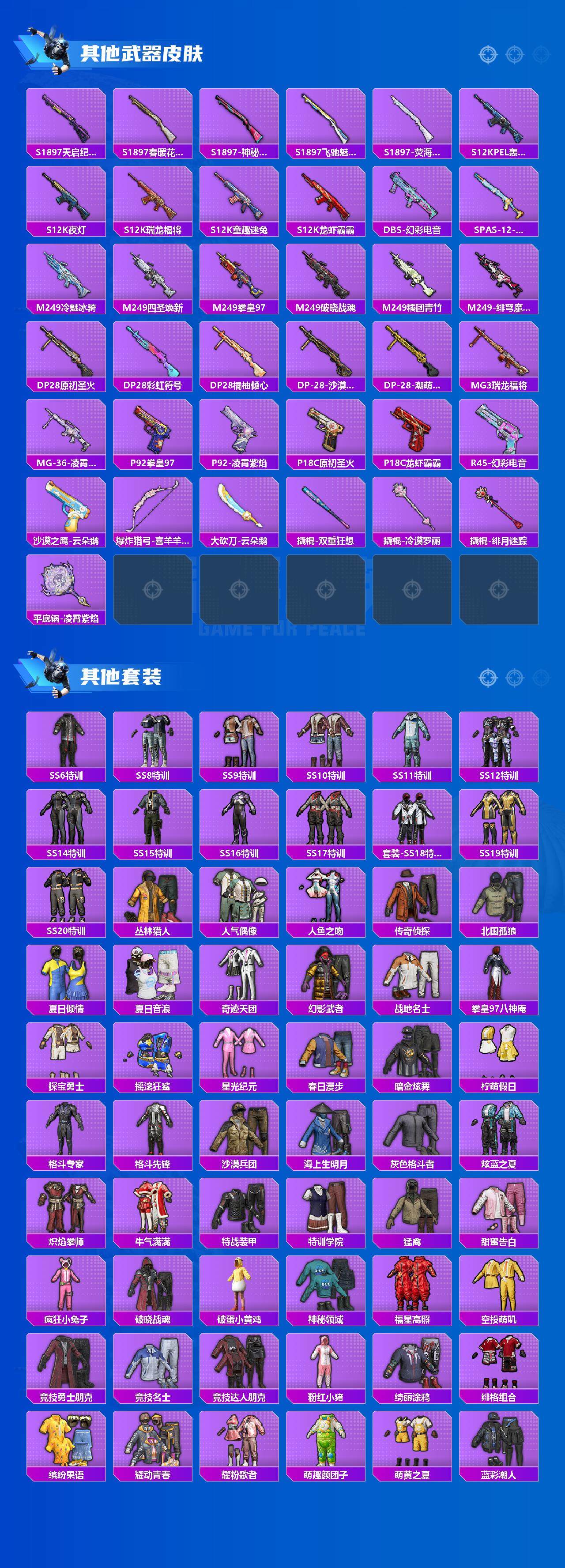 - [11288658]2粉装 2特效枪 9印记 可二次 可修改实名 优质装备:冰霜白皇,AMR炫光之旅,Kar98K-巳巳如意 热门装扮:水仙星 六级特效枪:六级AMR-炫光之旅 一级特效枪:一级Kar98K-巳巳如意 紫色装扮:北国孤狼,青涩时光,SS33特训套装,SS15特训,SS16特训,SS13特训,超能拳王,SS14特训,SS17特训,SS18特训,吉莉礼服,长空猛禽,雪山精英,霓虹街区,蓝彩潮人,蓝色运动,血色贵族,龙的传人,魅力单车,黄色名流,黑色伏地魔,深蓝色名流,疯狂小兔子,破晓战魂,破蛋小黄鸡,福星高照,空岛之星,竞技勇士朋克,竞技达人朋克,猛禽,灼焰舞者,牛气满满,特战英豪,巳巳如意,竞技名士,惊鸿侠骨,SS25特训,锦衣飞扬,无暇誓言,SS26特训,春光漫游,快闪甜心,SS6特训,SS7特训,清香五月粽,SS8特训,SS12特训,SS10特训,SS9特训,SS11特训,耀粉歌者,SS32特训服(SS32特训套装),绯格组合 优质战备:圣堂之誓降落伞,闲梦青缨降落伞,炫光之旅降落伞,王牌四分卫降落伞