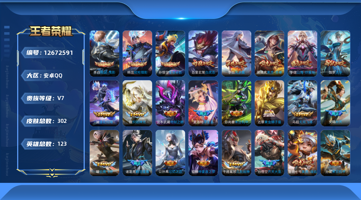 [12672591]安卓Q-V7-永恒钻石II段位-123英雄-302皮肤-3典藏-0珍品无双-0无双-0珍品传说-35传说-86史诗