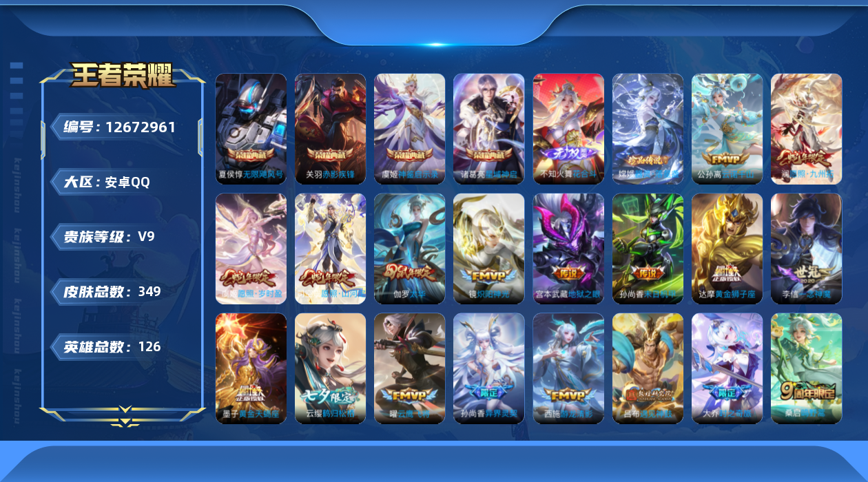 [12672961]安卓Q-V9-永恒钻石I段位-126英雄-349皮肤-4典藏-0珍品无双-1无双-1珍品传说-46传说-90史诗 【荣耀典藏】:武则天英雄,夏侯惇无限飓风号,诸葛亮星域神启,关羽赤影疾锋,虞姬神鉴启示录 【无双皮肤】:不知火舞花合斗 【珍品传说】:嫦娥器灵落星盏 【传说皮肤】:狄仁杰超时空战士,武则天海洋之心,孙悟空地狱火,宫本武藏地狱之眼,孙尚香末日机甲,貂蝉仲夏夜之梦,后羿黄金射手座,梦奇胖达荣荣,花木兰冠军飞将,达摩黄金狮子座,虞姬云霓雀翎,干将莫邪久胜战神,张良黄金白羊座,伽罗太华,刘备时之恋人,李信一念神魔,曜云鹰飞将,孙悟空零号赤焰,虞姬启明星使,镜炽阳神光,铠绛天战甲,李元芳飞鸢探春,小乔音你心动,西施游龙清影,王昭君乞巧织情,赵云淬星耀世,孙尚香异界灵契,孙策末日机甲,蔡文姬花朝如约,百里守约碎云,李白诗剑行,吕布怒海麟威,澜电玩雷克斯,东皇太一灼幽烈阳,马可波罗妄想实况,云缨鹤归松栖,宫本武藏惊梅引,吕布遇见神鼓,兰陵王影龙天霄,大乔时之奇旅,墨子黄金天蝎座,桑启鸣野蒿,虞姬愿照岁时盈,澜愿照九州拓,司空震愿照山河定,公孙离云诺千山 【限定皮肤】:白起狰,暃埋骨钱,蒙犽顽岩魄,姜子牙天穹之誓,杨戬破阵退雄兵,狄仁杰阴阳师,虞姬凯尔特女王,赵云皇家上将,赵云百木心枪,嬴政白昼王子,孙尚香异界灵契,鲁班七号狮舞东方,庄周高山流水,阿轲迷踪丽影,孙膑妖精王,扁鹊炼金王,白起夜都怪侠,芈月重明,芈月幻夜卜梦,吕布猎兽之王,吕布遇见神鼓,周瑜赤莲之焰,夏侯惇朔风刀,甄姬游园惊梦,曹操烛龙,典韦穷奇,典韦蓝屏警告,典韦岱宗,马可波罗妄想实况,狄仁杰魔术师,狄仁杰万华元夜,达摩星际陆战队,达摩沙漠行僧,项羽海滩派对,老夫子醍醐杖,程咬金演武夺筹,刘邦夺宝奇兵,韩信傲雪梅枪,兰陵王影龙天霄,兰陵王驯魔猎人,兰陵王金庭之子,亚瑟潮玩骑士王,孙悟空零号赤焰,孙悟空孙行者,牛魔御旌,后羿圣弓游侠,李元芳银河之约,李元芳匿光侦查者,李元芳云中旅人,虞姬启明星使,钟馗神迹守卫,钟馗驱傩正仪,杨玉环遇见飞天,女娲朔望之晖,干将莫邪真爱魔法,雅典娜单词大作战,雅典娜黎明之约,太乙真人饕餮,鬼谷子原初探秘者,鬼谷子五谷丰年,大乔时之奇旅,铠青龙志,苏烈千军破阵,百里玄策原初追逐者,弈星混沌棋,沈梦溪星空之诺,沈梦溪大漠名商,明世隐疑决卦,狂铁御狮,狂铁电玩高手,米莱狄御霄,米莱