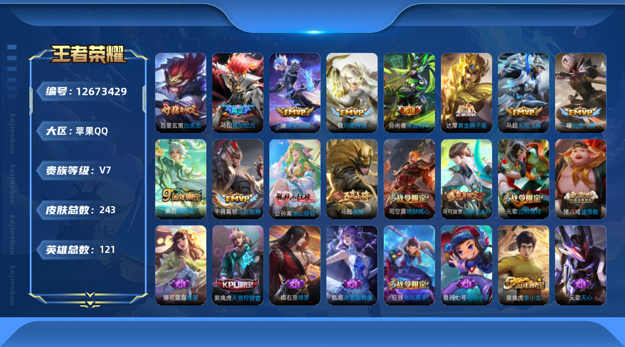 [12673429]苹果Q-V7-尊贵铂金IV段位-121英雄-243皮肤-0典藏-0珍品无双-0无双-0珍品传说-10传说-77史诗