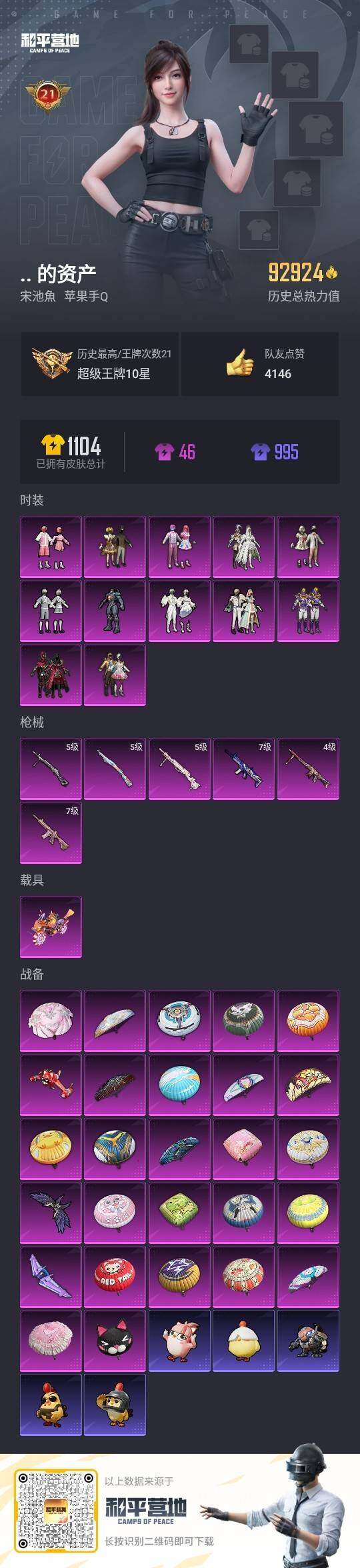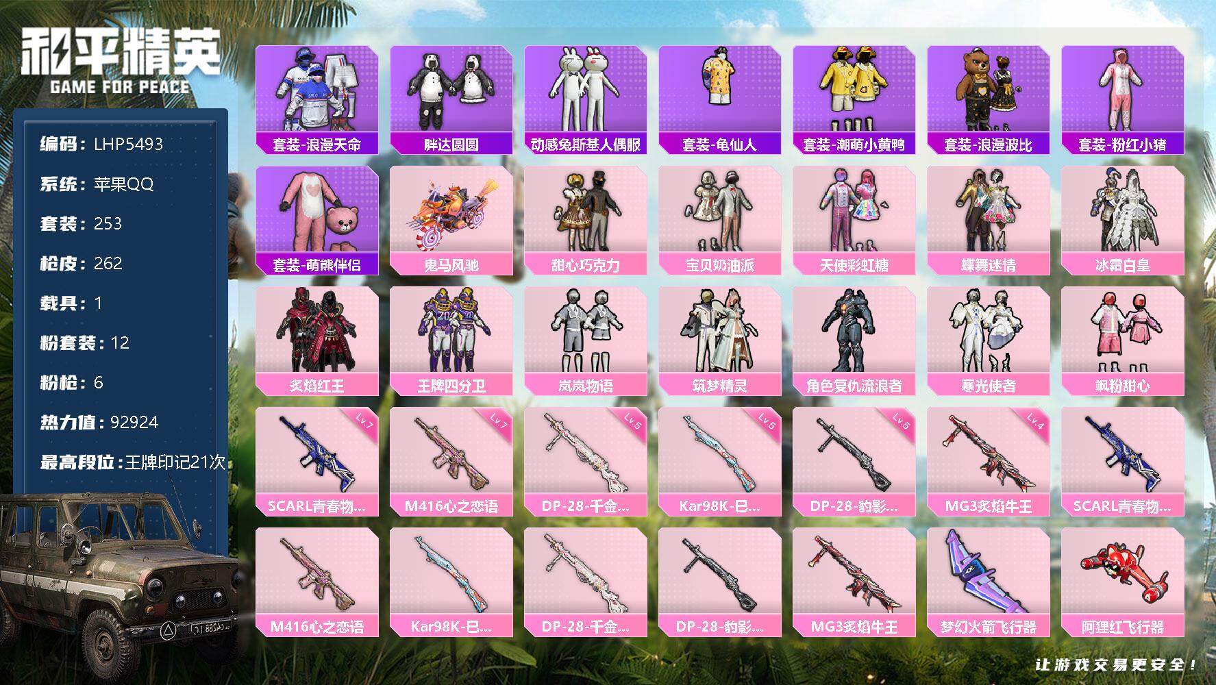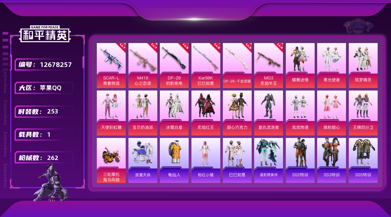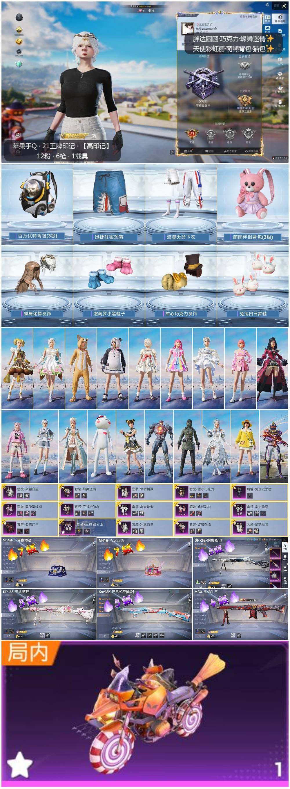 [12678257]素材身法号 苹果 手Q-12粉装-6特效枪-1载具-3粉色飞行器-9.2w热力值-21王牌印记-253套装-262枪皮【热门品类】:套装-浪漫天命,套装-胖达圆圆,套装-动感兔斯基人偶服,套装-龟仙人,套装-潮萌小黄鸭,套装-浪漫波比,套装-粉红小猪,套装-萌熊伴侣【粉色载具】:鬼马风驰【粉色套装】:粉装-甜心巧克力,粉装-宝贝奶油派,粉装-天使彩虹糖,粉装-蝶舞迷情,粉装-冰霜白皇,粉装-炙焰红王,粉装-王牌四分卫,粉装-岚岚物语,粉装-筑梦精灵,角色-复仇流浪者,粉装-寒光使者,粉装-飒粉甜心【粉色枪皮等级】:SCAR-L-青春物语(七级),M416-心之恋语(七级),Kar98K-巳巳如意(五级),DP-28-千金淑猫(五级),DP-28-豹影疾电(五级),MG3-炙焰牛王(四级)【粉色飞行器】:梦幻火箭飞行器,阿狸红飞行器,星夜魔法师飞行翼