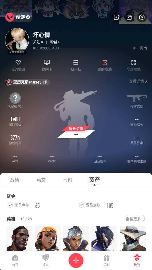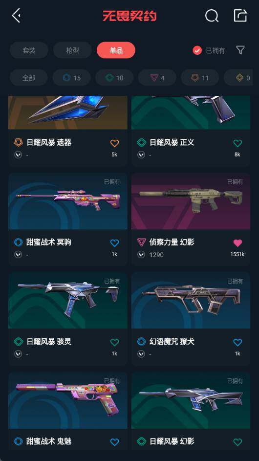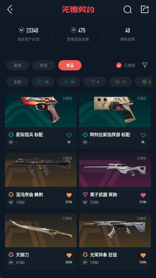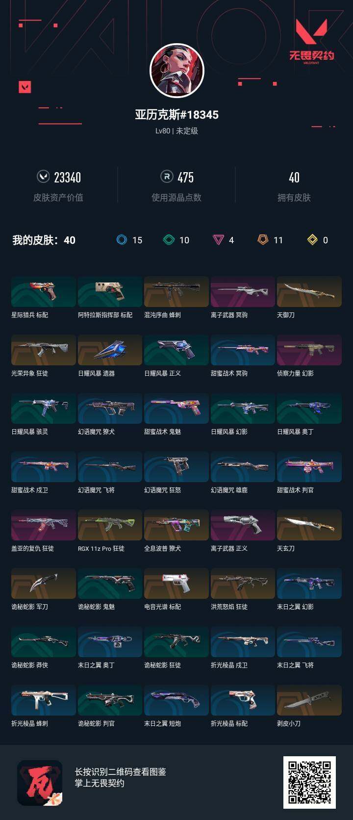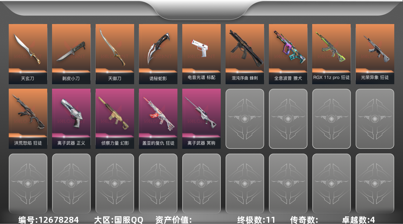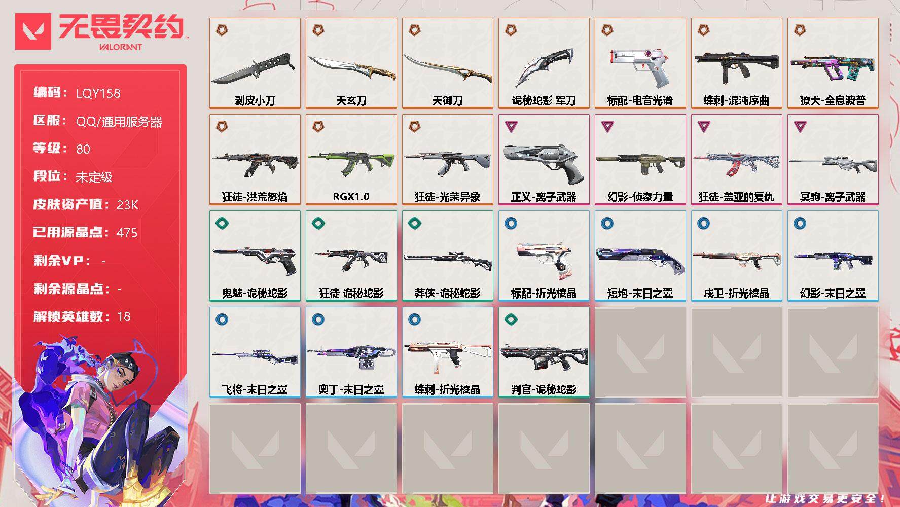 [12678284]皮肤资产价值23340【英雄】:幻棱,炼狱,维斯,暮蝶,壹决,捷风,雷兹,幽影,不死鸟,贤者,猎枭,蝰蛇,零,芮娜,奇乐,霓虹,星礈 【近战 武器】:近战武器-剥皮小刀,近战武器-天玄刀,近战武器-天御刀,近战武器-诡秘蛇影 军刀 【狂徒】:狂徒-洪荒怒焰,狂徒-RGX 11z Pro,狂徒-光荣异象,狂徒-盖亚的复仇,狂徒-诡秘蛇影 【幻影】:幻影-侦察力量,幻影-末日之翼 【戍卫】:戍卫-折光棱晶 【獠犬】:獠犬-全息波普 【冥驹】:冥驹-离子武器 【飞将】:飞将-末日之翼 【莽侠】:莽侠-诡秘蛇影 【奥丁】:奥丁-末日之翼 【判官】:判官-诡秘蛇影 【蜂刺】:蜂刺-混沌序曲,蜂刺-折光棱晶 【标配】:标配-电音光谱,标配-折光棱晶,标配-电音光谱 【正义】:正义-离子武器 【鬼魅】:鬼魅-诡秘蛇影 【短炮】:短炮-末日之翼 【卡面】:树懒大作战 卡面,表象之下 卡面,无畏契约GO!第一卷:芮娜 卡面,无畏契约GO!第一卷:零 卡面,无垠星环 卡面,《双城之战》金克丝 卡面,无畏契约GO!第一卷:贤者 卡面,代号红色 卡面,新兵报到 卡面,V契约 卡面,无畏契约 卡面 【喷漆】:买装还是存钱 喷漆,关门放狗 喷漆,蕊形灯 喷漆,放下武器 喷漆,胜利属于无畏契约 喷漆,GLHF 喷漆,无畏契约 喷漆 【挂饰】:鱼骨头 挂饰,薰衣草之心 挂饰,冲上云霄 挂饰,动力机箱 挂饰,天外飞客 挂饰,《双城之战》魄罗 挂饰,海豹的认可 挂饰,无畏契约 纪念币 挂饰