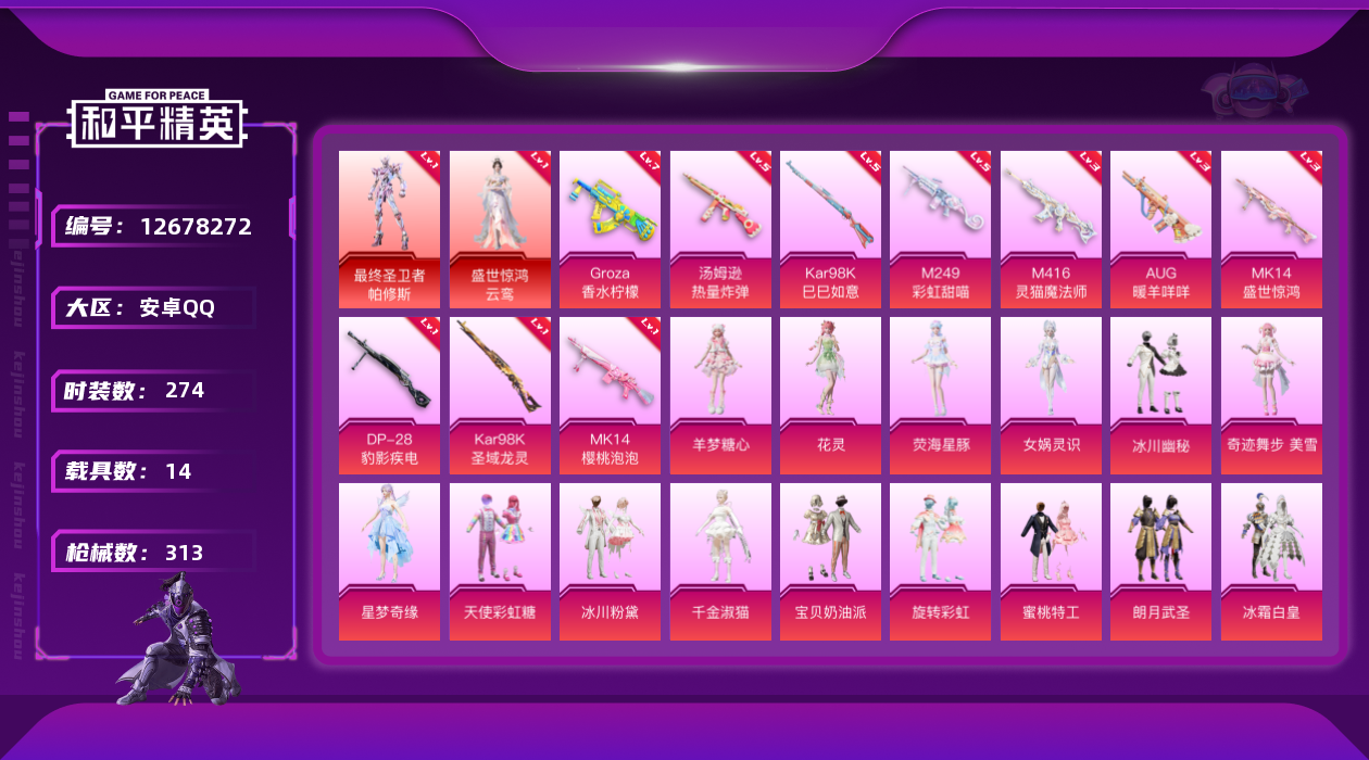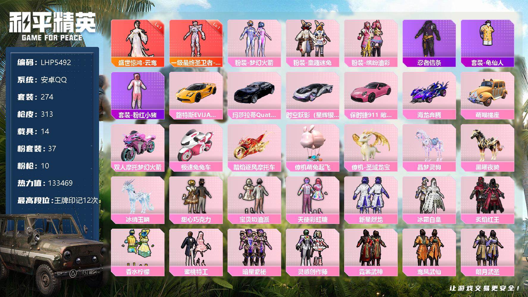[12678272]素材身法号/扭蛋碎片784 安卓 手Q-2神装-37粉装-10特效枪-14载具-19粉色飞行器-13.3w热力值-12王牌印记-274套装-313枪皮【红色神装等级】:最终圣卫者-帕修斯(一级),盛世惊鸿-云鸾(一级)【热门品类】:粉装-梦幻火箭,粉装-童趣迷兔,粉装-缤纷油彩,套装-忍者信条,套装-龟仙人,套装-粉红小猪【粉色载具】:路特斯EVIJA(星际黄),玛莎拉蒂Quattroporte(夜幕蓝),时空跃影(星辉银),保时捷911 敞篷版(星珀红),海龙奔腾,萌喵橘座,双人摩托-梦幻火箭,极速兔兔车,踏焰逐风摩托车,僚机-萌兔起飞,僚机-圣域龙宝,晶梦灵驹,黑曜夜骑,冰绡玉鳞【粉色套装】:粉装-甜心巧克力,粉装-宝贝奶油派,粉装-天使彩虹糖,粉装-梦幻火箭,粉装-缤纷油彩,粉装-新星烈龙,粉装-冰霜白皇,粉装-童趣迷兔,粉装-炙焰红王,粉装-香水柠檬,粉装-蜜桃特工,粉装-暗星紫秘,粉装-灵感创作师,粉装-霓裳武神,粉装-鸾凤武仙,粉装-朗月武圣,粉装-彩虹甜喵,蜀山剑侠-李逍遥,粉装-旋转彩虹,粉装-冰川粉黛,粉装-冰川幽秘,粉装-冰川红玫,角色-小可学妹,角色-鸢尾晶梦,角色-星梦奇缘,角色-千金淑猫,角色-女娲灵识,角色-晶梦幻蝶,角色-樱桃泡泡,粉装-戏水时光,粉装-幻彩电音,角色-罗征,角色-荧海星豚,角色-奇迹舞步 美雪,角色-花灵,角色-羊梦糖心【粉色枪皮等级】:M416-灵猫魔法师(三级),GROZA-香水柠檬(七级),AUG-暖羊咩咩(三级),汤姆逊-热量炸弹(五级),Kar98K-巳巳如意(五级),Kar98K-圣域龙灵(一级),Mk14-盛世惊鸿(三级),Mk14-樱桃泡泡(一级),M249-彩虹甜喵(五级),DP-28-豹影疾电(一级)【粉色飞行器】:酣梦熊熊飞行器,梦幻火箭飞行器,灵感创作师飞行器,翩跹演武飞行器,仙剑飞行器,凤舞九天飞行器,万象金身飞行器,幻梦之森飞行器,彩虹独角兽飞行器,戏水时光飞行器,星月云朵飞行器,圣域金龙飞行器,终晖之翼飞行器,绯月迷踪飞行器,智趣喵喵飞行器,灵猫魔法师飞行器,飞天猪飞行器,灵珠游龙飞行器