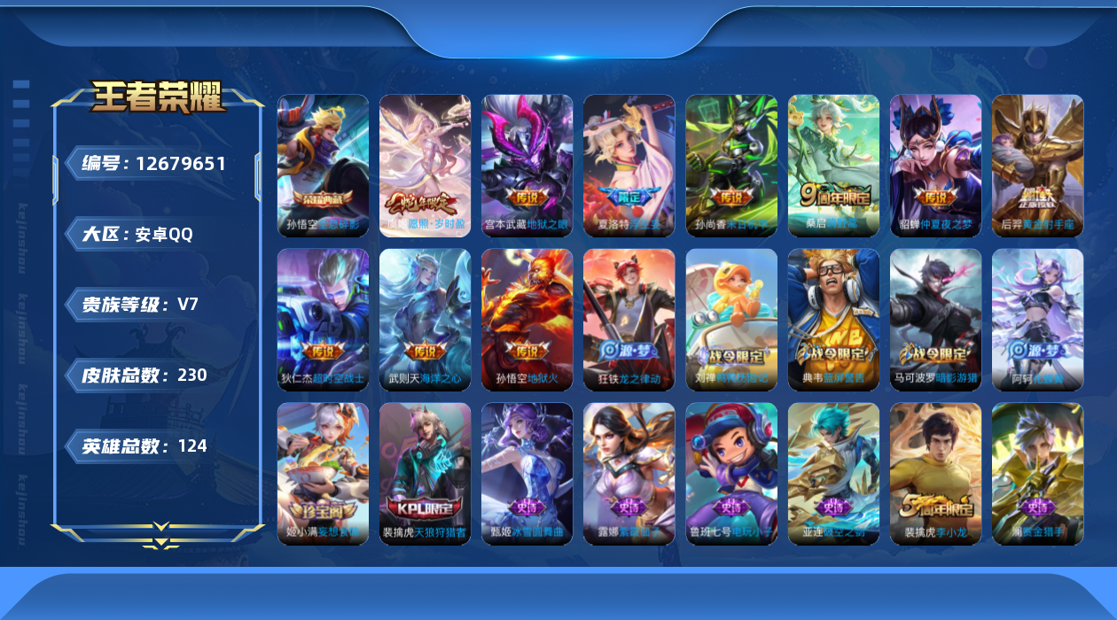 [12679651]安卓Q-V3-永恒钻石III段位-124英雄-230皮肤-1典藏-0珍品无双-0无双-0珍品传说-10传说-56史诗