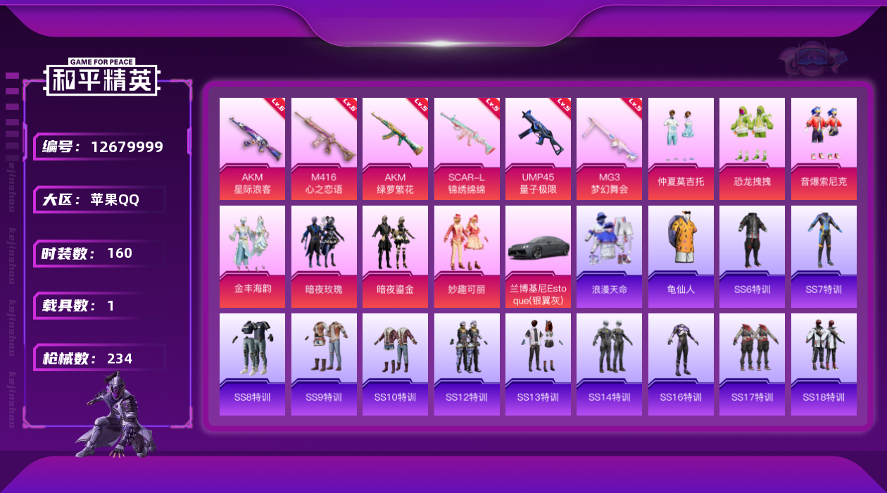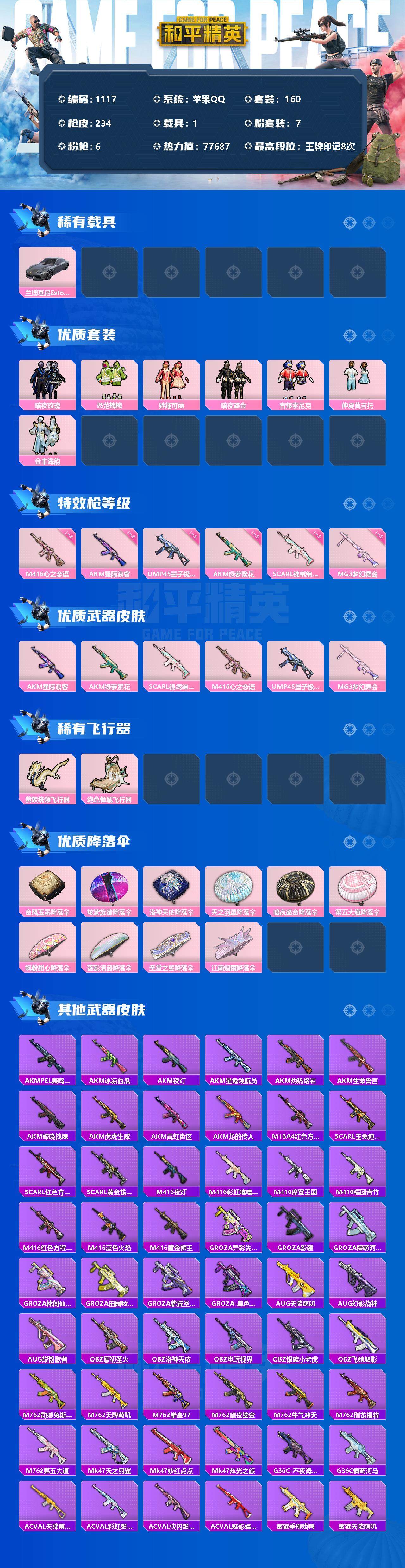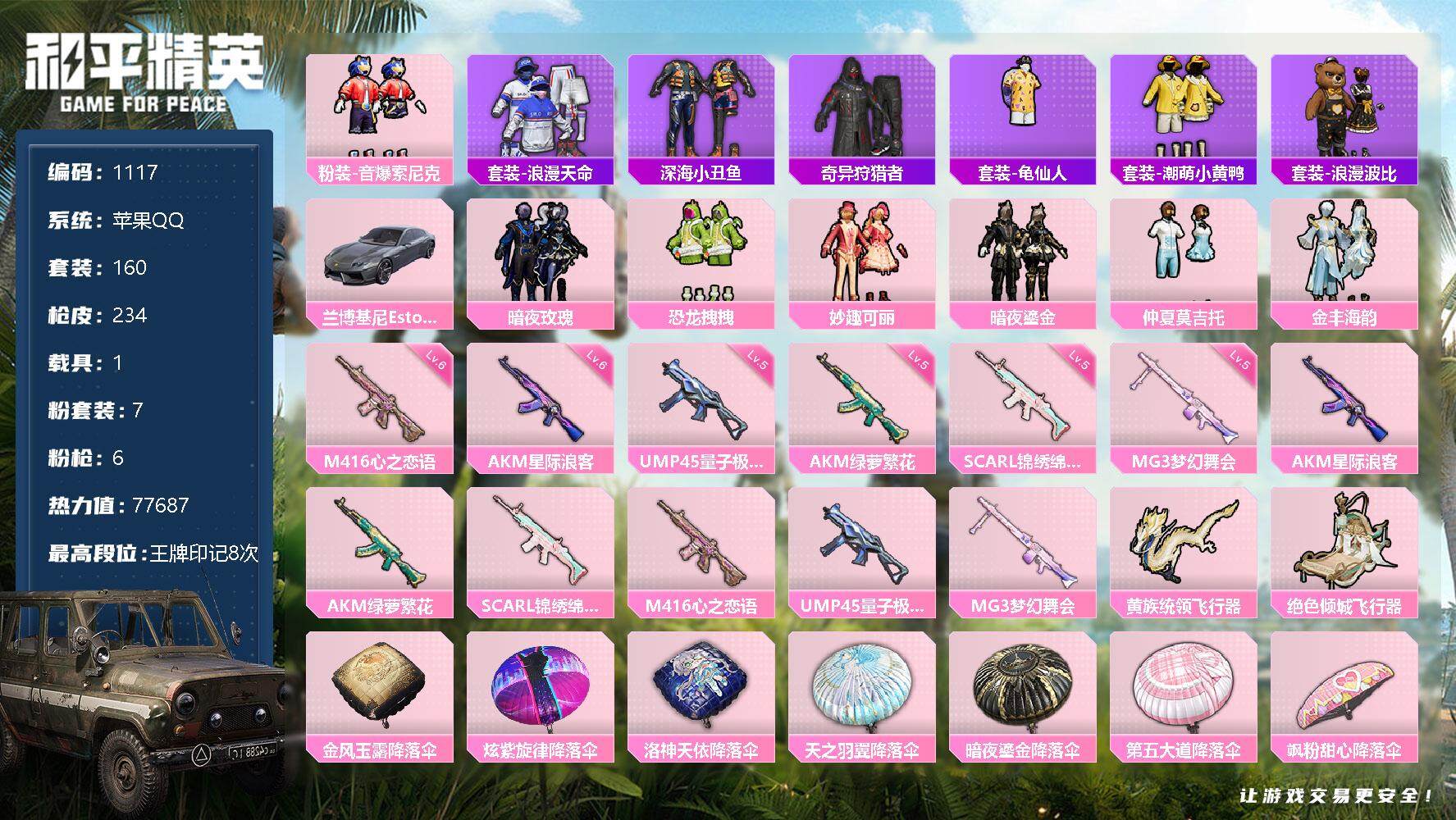 [12679999]苹果 手Q-7粉装-6特效枪-1载具-2粉色飞行器-77687热力值-8王牌印记-160套装-234枪皮 【热门品类】:粉装-音爆索尼克,套装-浪漫天命,套装-深海小丑鱼,套装-奇异狩猎者,套装-龟仙人,套装-潮萌小黄鸭,套装-浪漫波比 【粉色载具】:兰博基尼Estoque(银翼灰) 【粉色套装】:粉装-暗夜玫瑰,粉装-恐龙拽拽,粉装-妙趣可丽,粉装-暗夜鎏金,粉装-音爆索尼克,粉装-仲夏莫吉托,粉装-金丰海韵 【粉色枪皮等级】:AKM-星际浪客(六级),AKM-绿萝繁花(五级),SCAR-L-锦绣绵绵(五级),M416-心之恋语(六级),UMP45-量子极限(五级),MG3-梦幻舞会(五级) 【粉色枪皮】:AKM-星际浪客,AKM-绿萝繁花,SCAR-L-锦绣绵绵,M416-心之恋语,UMP45-量子极限,MG3-梦幻舞会 【粉色飞行器】:黄族统领飞行器,绝色倾城飞行器 【粉色降落伞】:金风玉露降落伞,炫紫旋律降落伞,洛神天依降落伞,天之羽翼降落伞,暗夜鎏金降落伞,第五大道降落伞,飒粉甜心降落伞,莲影清波降落伞,圣堂之誓降落伞,江南烟雨降落伞 【稀有套装】:套装-龟仙人 【稀有枪皮】:AKM-PEL轰鸣竞梦者,AKM-冰凉西瓜,AKM-夜灯,AKM-星兔领航员,AKM-灼热熔岩,AKM-生命誓言,AKM-破晓战魂,AKM-虎虎生威,AKM-霓虹街区,AKM-龙的传人,M16A4-红色方程式,SCAR-L-玉兔迎春,SCAR-L-红色方程式,SCAR-L-黄金龙骨,M416-夜灯,M416-彩虹嘻嘻猴,M416-摩登王国,M416-糯团青竹,M416-红色方程式,M416-蓝色火焰,M416-黄金狮王,GROZA-异彩先驱,GROZA-影袭,GROZA-懵萌河马,GROZA-林间仙鹿,GROZA-田园牧歌,GROZA-紫翼圣骑,GROZA-黑色刀锋,AUG-天降萌叽,AUG-幻影战神,AUG-耀粉歌者,QBZ-原初圣火,QBZ-洛神天依,QBZ-电玩视界,QBZ-银碳小老虎,QBZ-飞驰魅影,M762-动感兔斯基,M762-天降萌叽,M762-拳皇97,M762-暗夜鎏金,M762-牛气冲天,M762-瑞龙福将,M762-第五大道,Mk47-天之羽翼,Mk47-妙红点点,Mk47-炫光之旅,G36C-不夜海上花,G36C-懵萌河马,AC-VAL-天降萌叽,AC-V