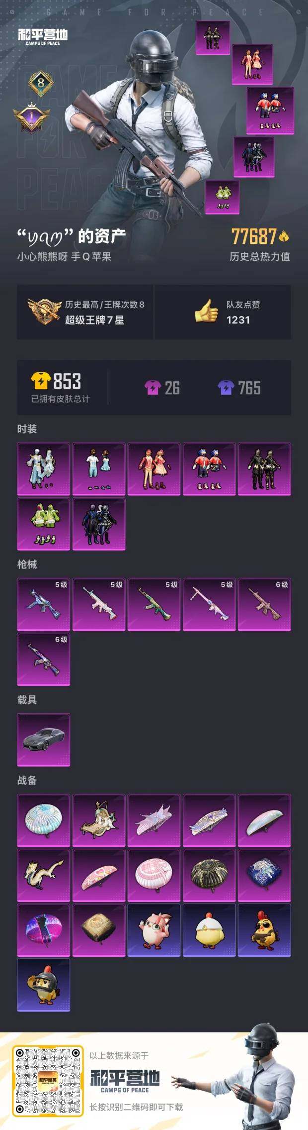 [12679999]苹果 手Q-7粉装-6特效枪-1载具-2粉色飞行器-77687热力值-8王牌印记-160套装-234枪皮