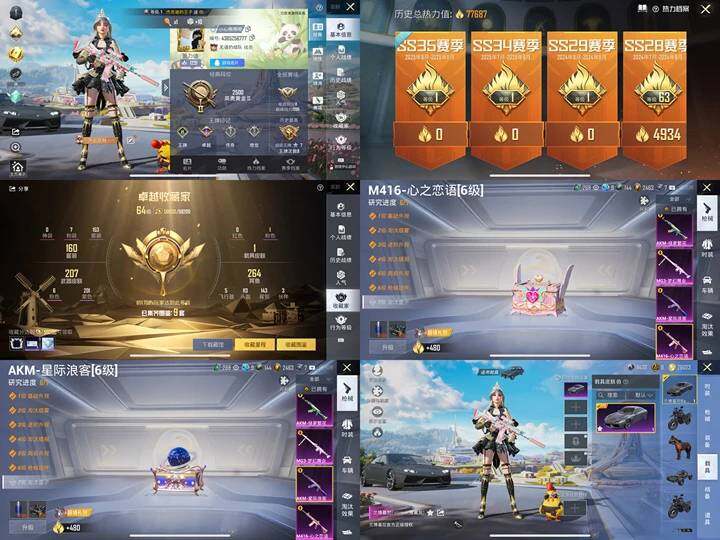 【粉色枪皮等级】:AKM-星际浪客(六级),AKM-绿萝繁花(五级),SCAR-L-锦绣绵绵(五级),M416-心之恋语(六级),UMP45-量子极限(五级),MG3-梦幻舞会(五级)