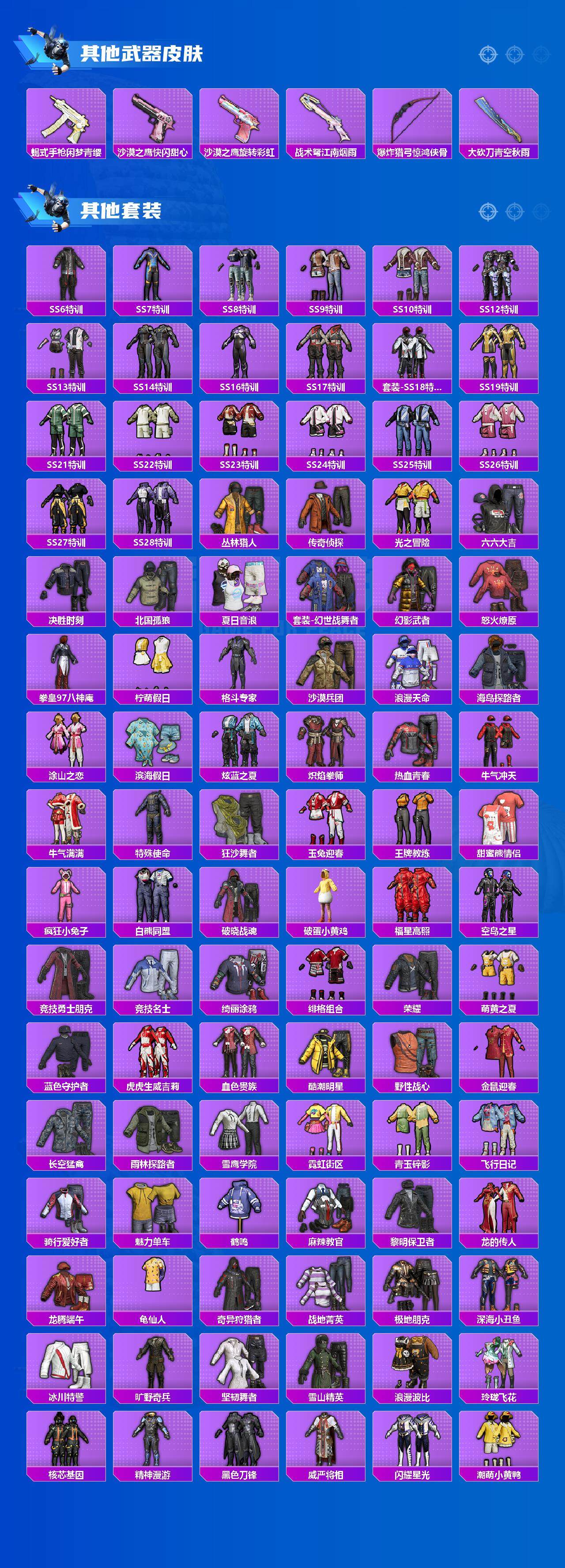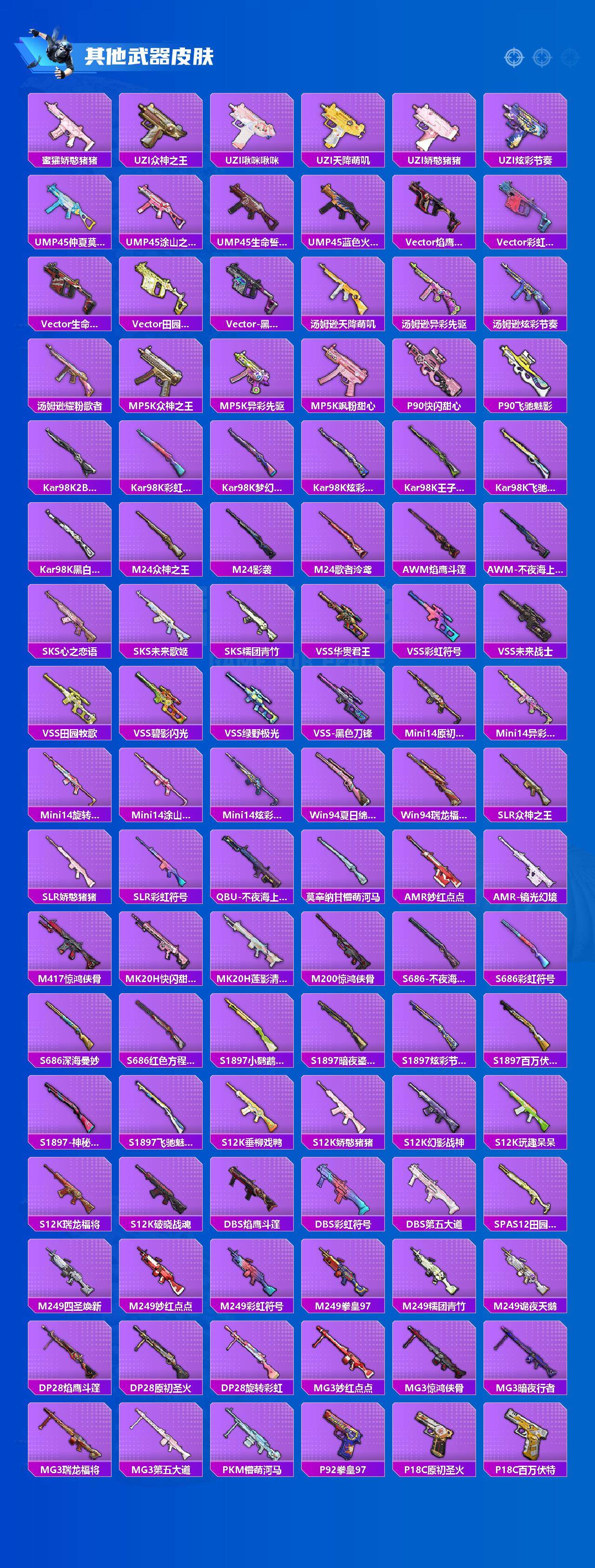 【稀有枪皮】:AKM-PEL轰鸣竞梦者,AKM-冰凉西瓜,AKM-夜灯,AKM-星兔领航员,AKM-灼热熔岩,AKM-生命誓言,AKM-破晓战魂,AKM-虎虎生威,AKM-霓虹街区,AKM-龙的传人,M16A4-红色方程式,SCAR-L-玉兔迎春,SCAR-L-红色方程式,SCAR-L-黄金龙骨,M416-夜灯,M416-彩虹嘻嘻猴,M416-摩登王国,M416-糯团青竹,M416-红色方程式,M416-蓝色火焰,M416-黄金狮王,GROZA-异彩先驱,GROZA-影袭,GROZA-懵萌河马,GROZA-林间仙鹿,GROZA-田园牧歌,GROZA-紫翼圣骑,GROZA-黑色刀锋,AUG-天降萌叽,AUG-幻影战神,AUG-耀粉歌者,QBZ-原初圣火,QBZ-洛神天依,QBZ-电玩视界,QBZ-银碳小老虎,QBZ-飞驰魅影,M762-动感兔斯基,M762-天降萌叽,M762-拳皇97,M762-暗夜鎏金,M762-牛气冲天,M762-瑞龙福将,M762-第五大道,Mk47-天之羽翼,Mk47-妙红点点,Mk47-炫光之旅,G36C-不夜海上花,G36C-懵萌河马,AC-VAL-天降萌叽,AC-V