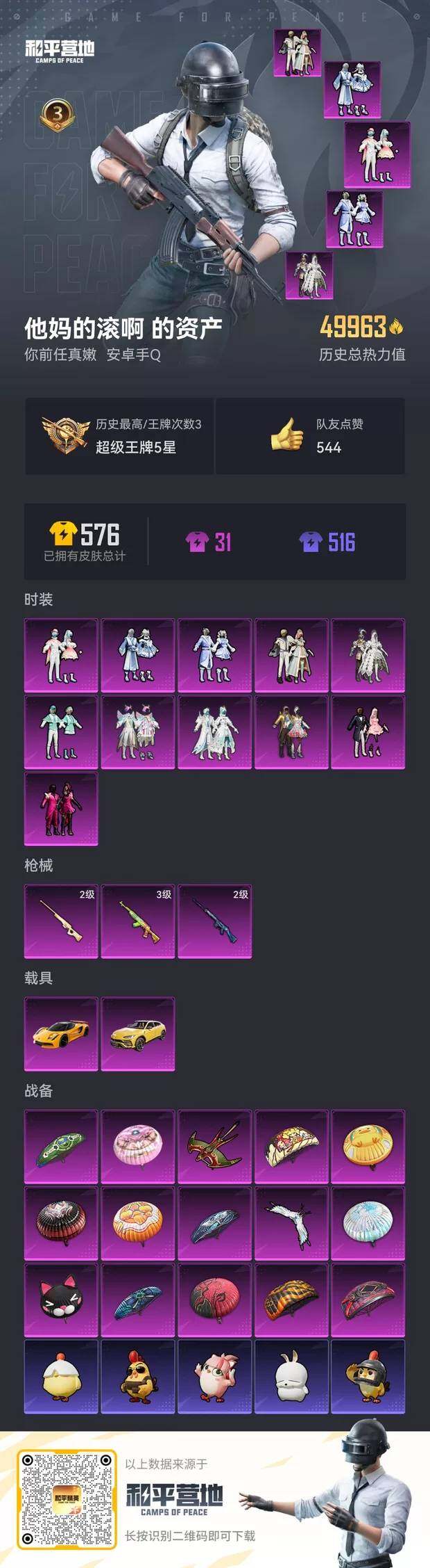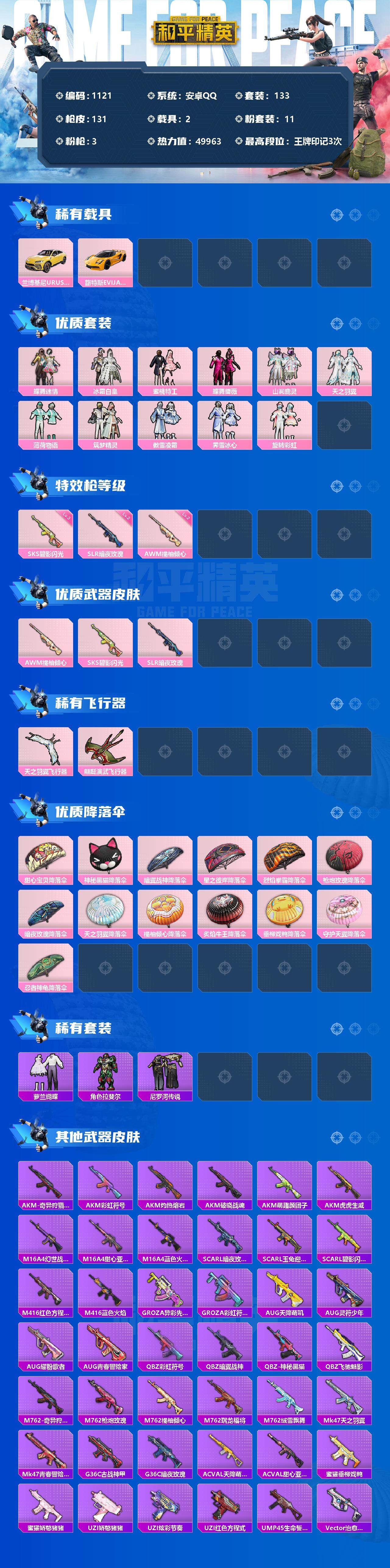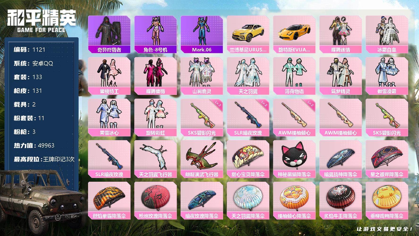 [12680250]安卓 手Q-11粉装-3特效枪-2载具-2粉色飞行器-49963热力值-3王牌印记-133套装-131枪皮