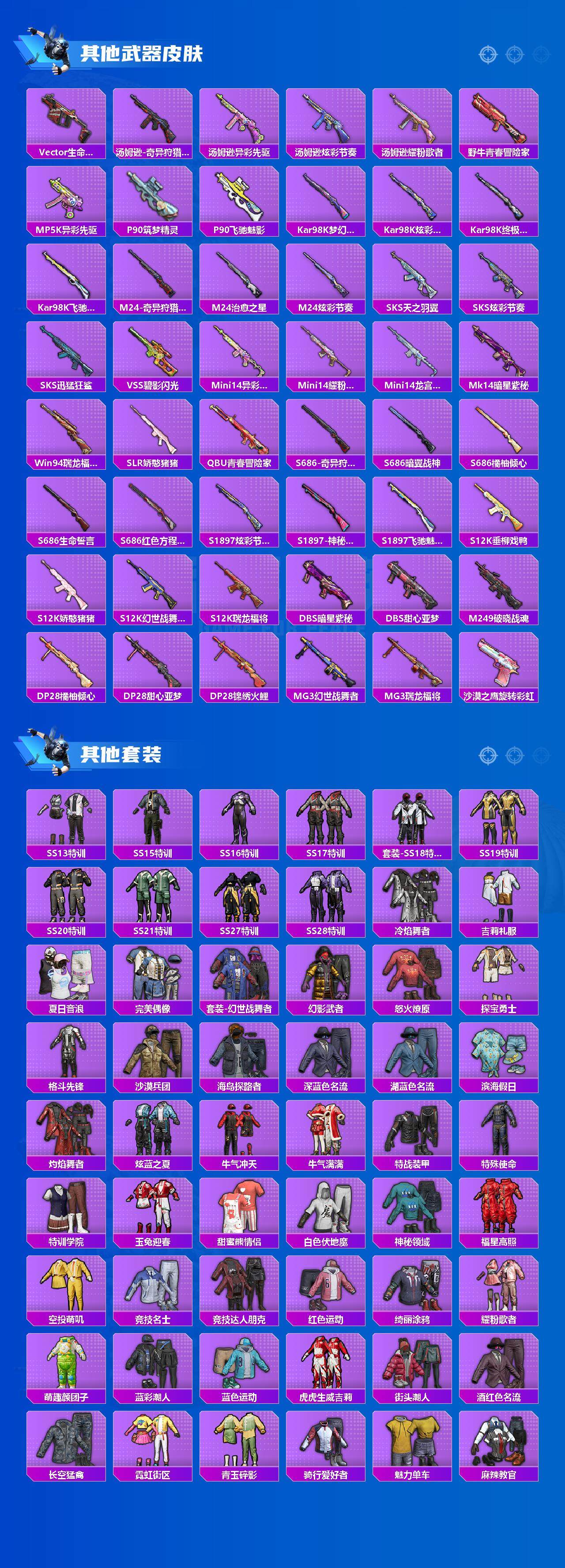 【稀有枪皮】:AKM-奇异狩猎者,AKM-彩虹符号,AKM-灼热熔岩,AKM-破晓战魂,AKM-萌趣颜团子,AKM-虎虎生威,M16A4-幻世战舞者,M16A4-甜心亚梦,M16A4-蓝色火焰,SCAR-L-暗夜玫瑰,SCAR-L-玉兔迎春,SCAR-L-碧影闪光,M416-红色方程式,M416-蓝色火焰,GROZA-异彩先驱,GROZA-彩虹符号,AUG-天降萌叽,AUG-灵符少年,AUG-耀粉歌者,AUG-青春冒险家,QBZ-彩虹符号,QBZ-暗翼战神,QBZ-神秘黑猫,QBZ-飞驰魅影,M762-奇异狩猎者,M762-枪炮玫瑰,M762-橘柚倾心,M762-瑞龙福将,M762-绒雪飘舞,Mk47-天之羽翼,Mk47-青春冒险家,G36C-古战神甲,G36C-暗夜玫瑰,AC-VAL-天降萌叽,AC-VAL-甜心亚梦,蜜獾-垂柳戏鸭,蜜獾-娇憨猪猪,UZI-娇憨猪猪,UZI-炫彩节奏,UZI-红色方程式,UMP45-生命誓言,Vector-治愈之星,Vector-生命誓言,汤姆逊-奇异狩猎者,汤姆逊-异彩先驱,汤姆逊-炫彩节奏,汤姆逊-耀粉歌者,野牛-青春冒险家,MP5K-异彩先驱,P90-筑梦精灵,P90-飞驰魅影,Kar98K-梦幻火箭,Ka