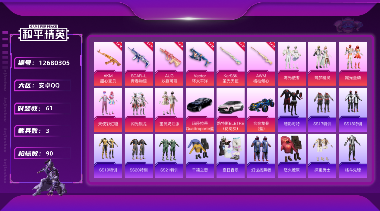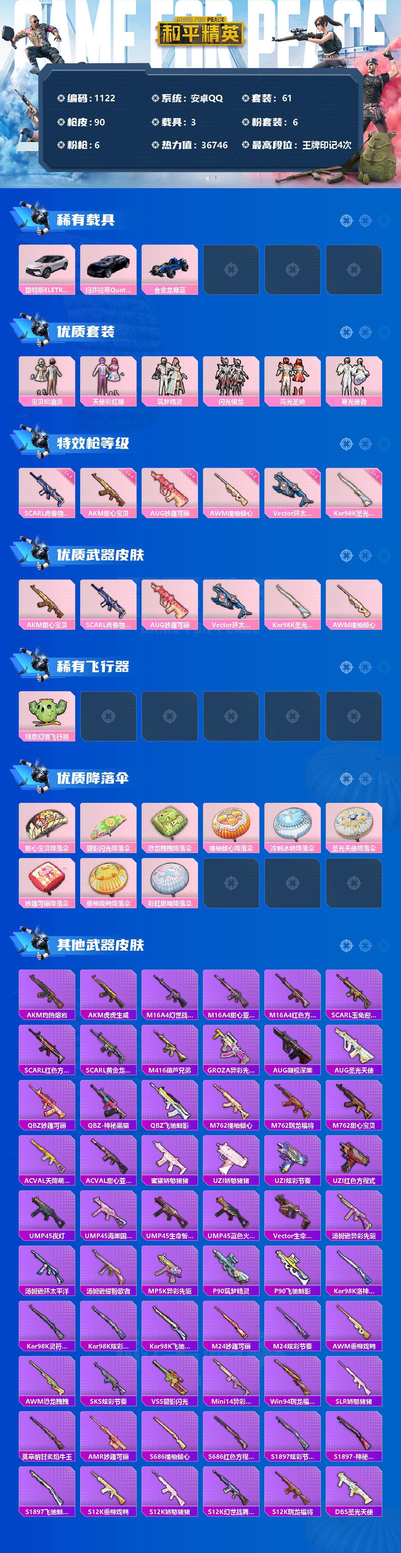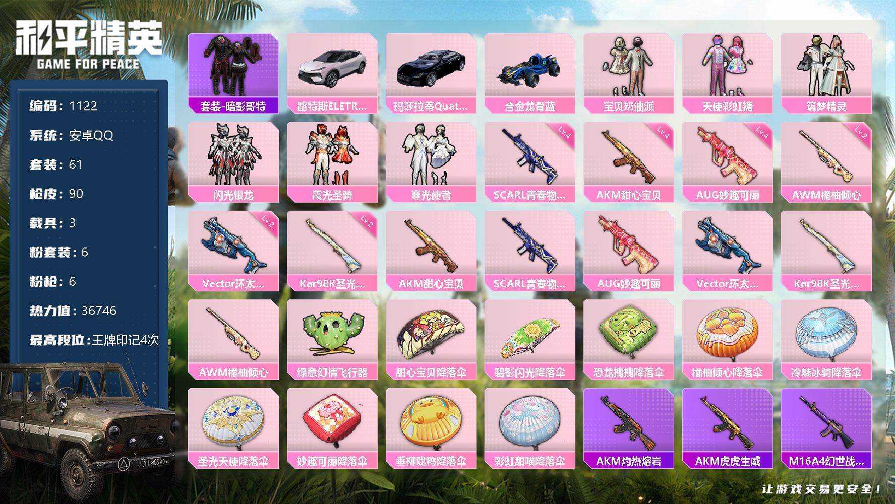 [12680305]安卓 手Q-6粉装-6特效枪-3载具-1粉色飞行器-36746热力值-4王牌印记-61套装-90枪皮 【热门品类】:套装-暗影哥特 【粉色载具】:路特斯ELETRE(花绽灰),玛莎拉蒂Quattroporte(夜幕蓝),合金龙骨(蓝) 【粉色套装】:粉装-宝贝奶油派,粉装-天使彩虹糖,粉装-筑梦精灵,粉装-闪光银龙,粉装-霞光圣骑,粉装-寒光使者 【粉色枪皮等级】:AKM-甜心宝贝(四级),SCAR-L-青春物语(四级),AUG-妙趣可丽(四级),Vector-环太平洋(二级),Kar98K-圣光天使(二级),AWM-橘柚倾心(二级) 【粉色枪皮】:AKM-甜心宝贝,SCAR-L-青春物语,AUG-妙趣可丽,Vector-环太平洋,Kar98K-圣光天使,AWM-橘柚倾心 【粉色飞行器】:绿意幻情飞行器 【粉色降落伞】:甜心宝贝降落伞,碧影闪光降落伞,恐龙拽拽降落伞,橘柚倾心降落伞,冷魅冰骑降落伞,圣光天使降落伞,妙趣可丽降落伞,垂柳戏鸭降落伞,彩虹甜喵降落伞 【稀有枪皮】:AKM-灼热熔岩,AKM-虎虎生威,M16A4-幻世战舞者,M16A4-甜心亚梦,M16A4-红色方程式,SCAR-L-玉兔迎春,SCAR-L-红色方程式,SCAR-L-黄金龙骨,M416-葫芦兄弟,GROZA-异彩先驱,AUG-凝视深渊,AUG-圣光天使,QBZ-妙趣可丽,QBZ-神秘黑猫,QBZ-飞驰魅影,M762-橘柚倾心,M762-瑞龙福将,M762-甜心宝贝,AC-VAL-天降萌叽,AC-VAL-甜心亚梦,蜜獾-娇憨猪猪,UZI-娇憨猪猪,UZI-炫彩节奏,UZI-红色方程式,UMP45-夜灯,UMP45-海渊国主,UMP45-生命誓言,UMP45-蓝色火焰,Vector-生命誓言,汤姆逊-异彩先驱,汤姆逊-环太平洋,汤姆逊-耀粉歌者,MP5K-异彩先驱,P90-筑梦精灵,P90-飞驰魅影,Kar98K-洛神天依,Kar98K-灵符少年,Kar98K-炫彩节奏,Kar98K-飞驰魅影,M24-炫彩节奏,M24-妙趣可丽,AWM-垂柳戏鸭,AWM-恐龙拽拽,SKS-炫彩节奏,VSS-碧影闪光,Mini14-异彩先驱,Win94-瑞龙福将,SLR-娇憨猪猪,莫辛纳甘-炙焰牛王,AMR-妙趣可丽,S686-橘柚倾心,S686-红色方程式,S1897-炫彩节奏,S1897-神秘黑猫,S189