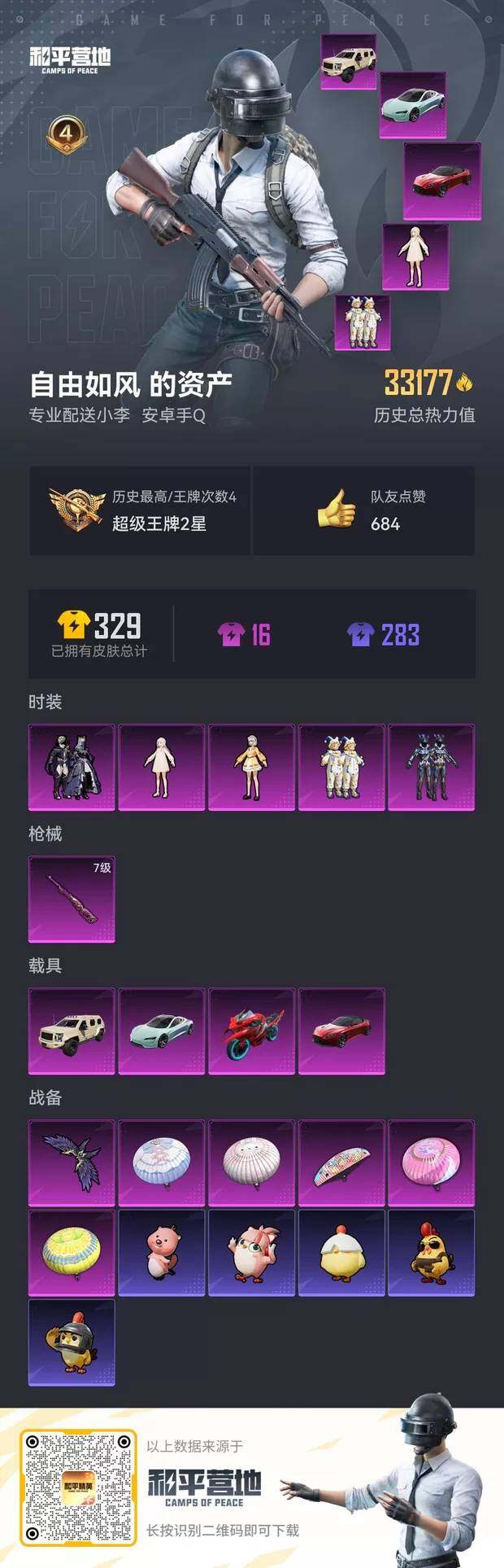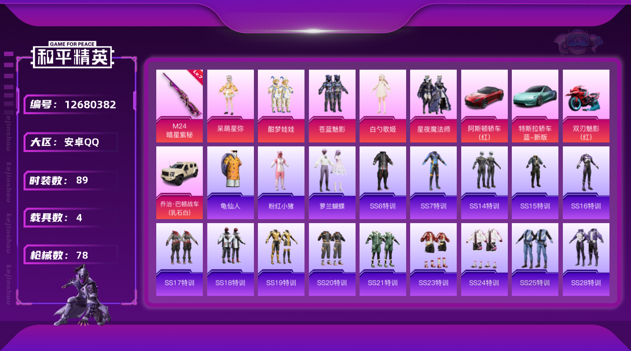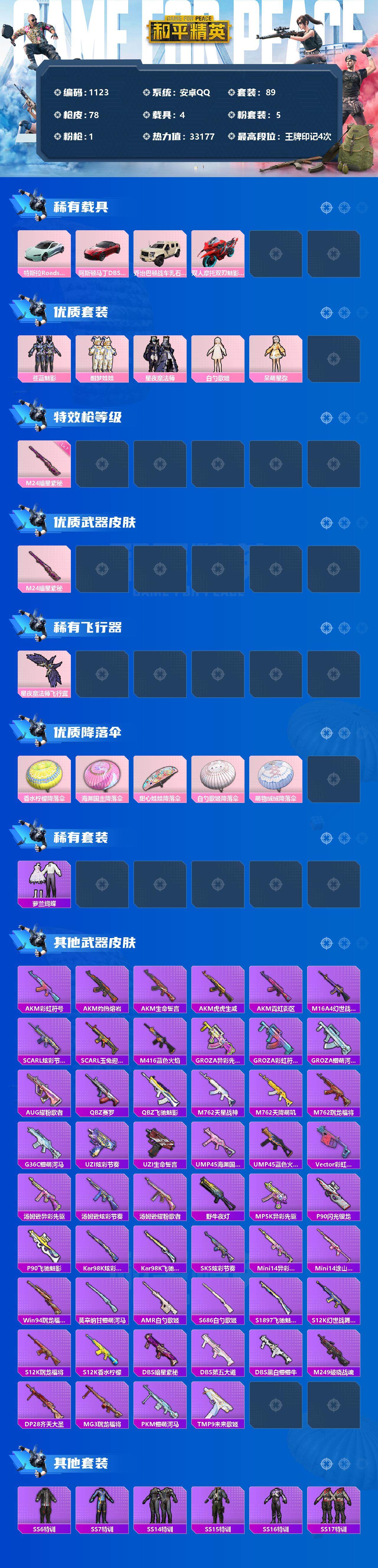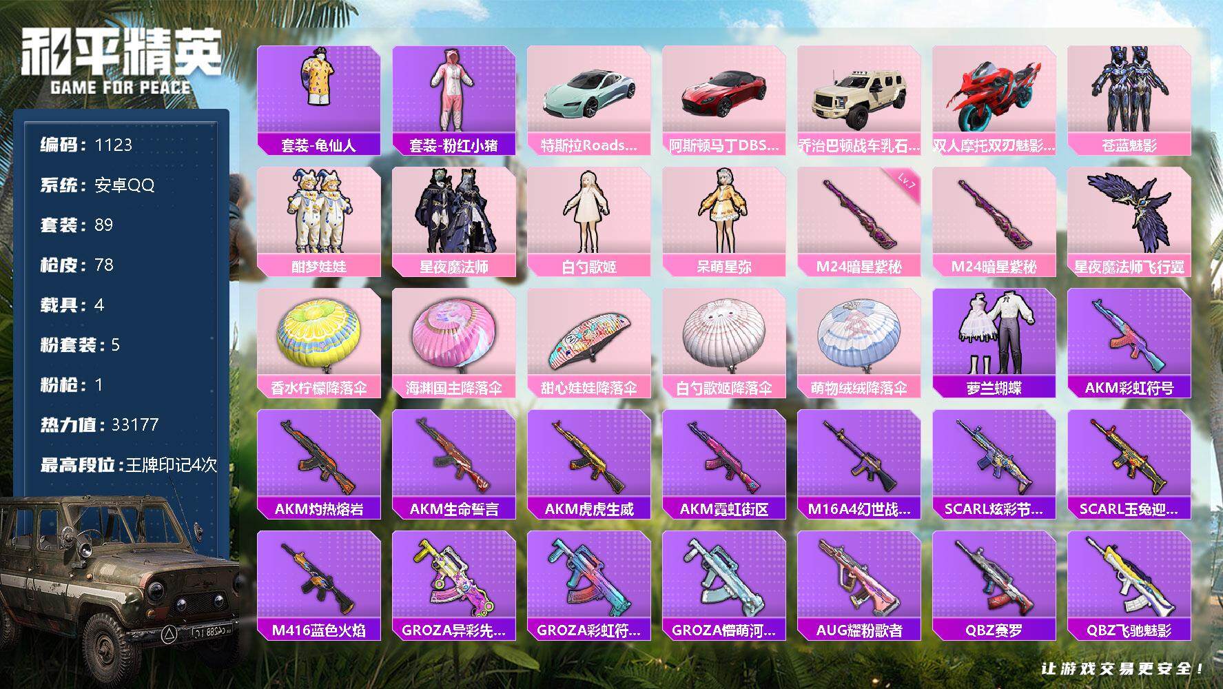 [12680382]安卓 手Q-5粉装-1特效枪-4载具-1粉色飞行器-33177热力值-4王牌印记-89套装-78枪皮