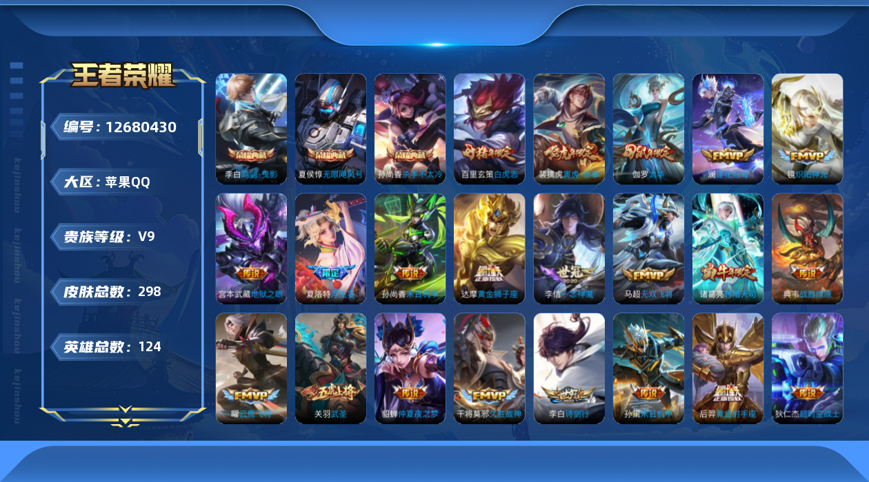 - PX_2103149-贵族8/皮肤205/传说26/史诗50/英雄125/碎月剑心/特工战影/地狱之眼/仲夏夜之梦/白虎志/时之恋人男/一念神魔/云鹰飞将/武圣/启明星使/炽阳神光/音你心动女/李逍遥/无双飞将/诗剑行/山海炽霜斩/山海苍雷引/齐天大圣/电玩雷克斯/妄想实况/惊梅引/遇见神鼓/逐花归海/铠琥珀纪元/马超琥珀纪元/乘龙铭钟鼎/乘龙淬吴钩/司空震愿照山河定/姜子牙天穹之誓/狄仁杰阴阳师